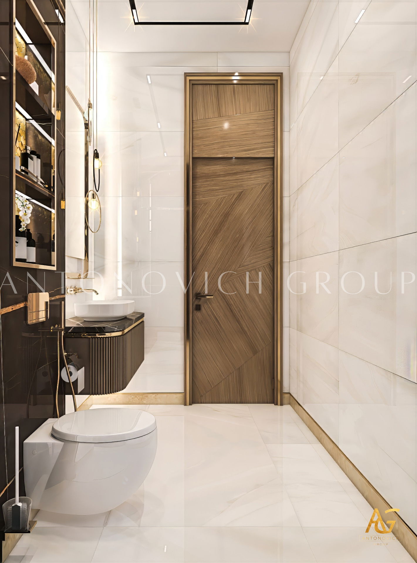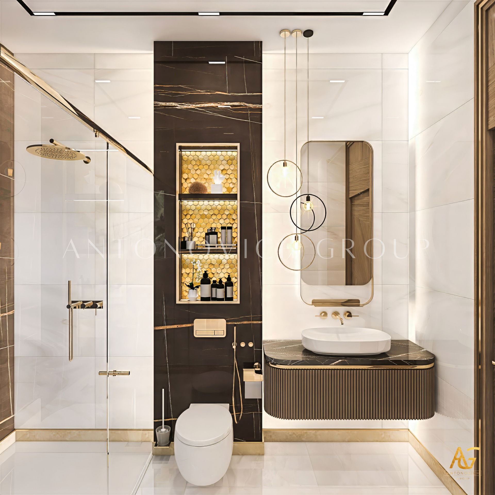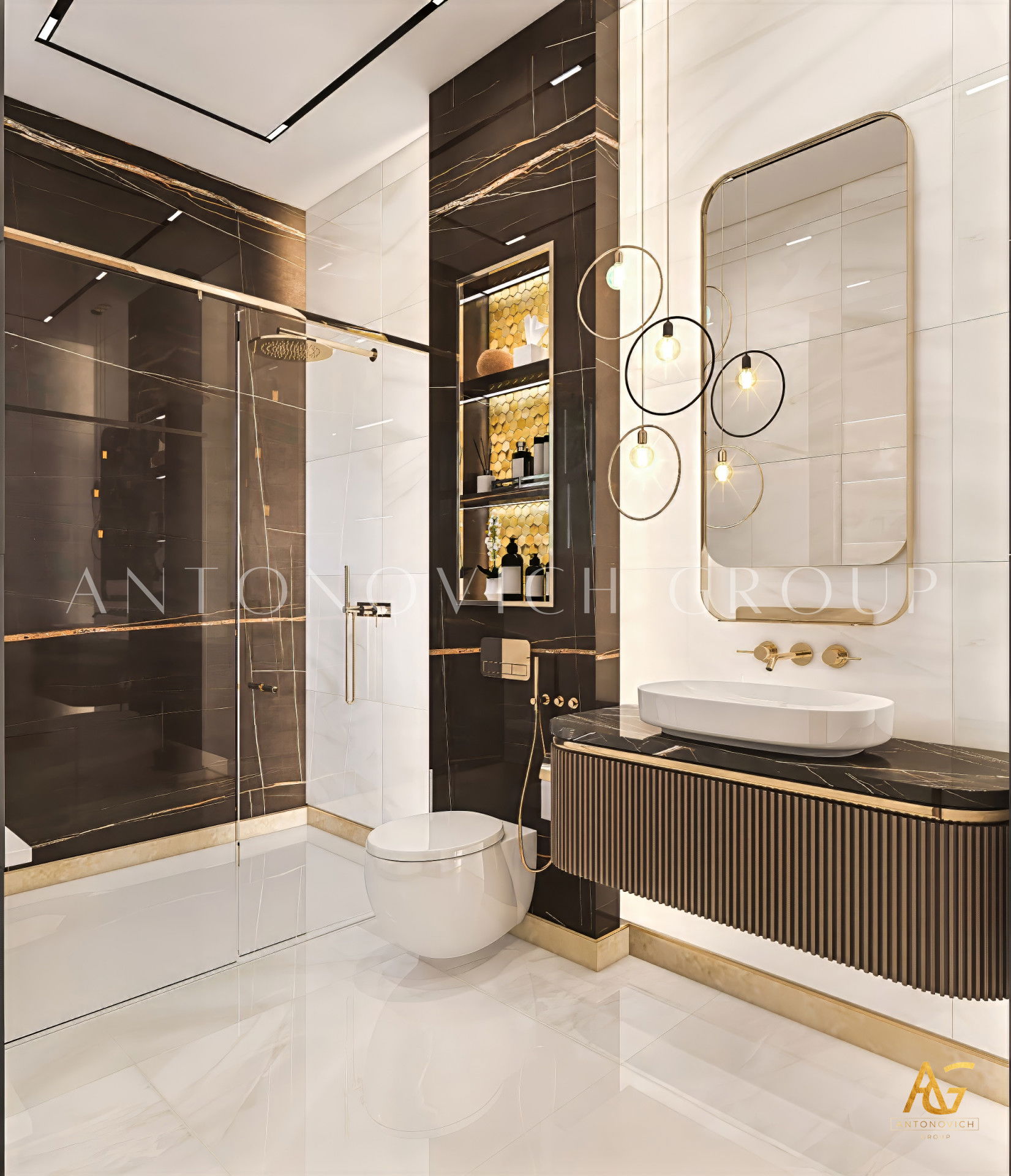 В отделке много роскошных деталей: декор с золотым акцентом выглядит элегантно — золотые акценты в ванной комнате добавляют блеска. Тёмные акценты в ванных комнатах заметны в шкафах и стеллажах, некоторые элементы выдержаны в тёмных тонах от пола до стен, создавая мрачную атмосферу. Также использованы мрамор и золото в ванной комнате и практичные решения, например встроенные шкафы для ванной комнаты, которые сохраняют порядок.