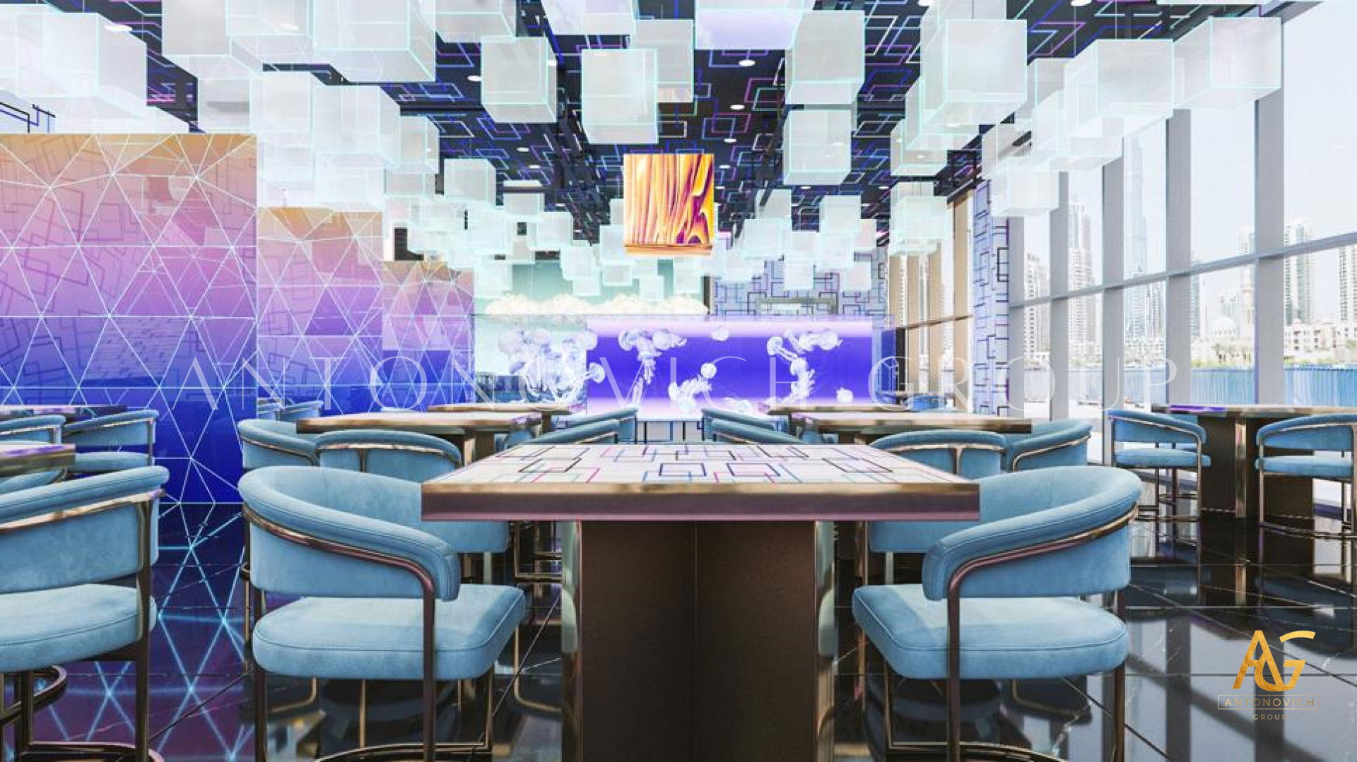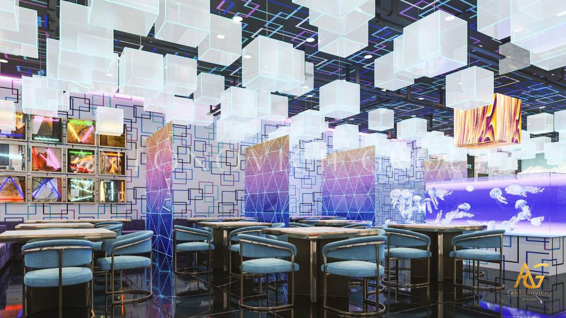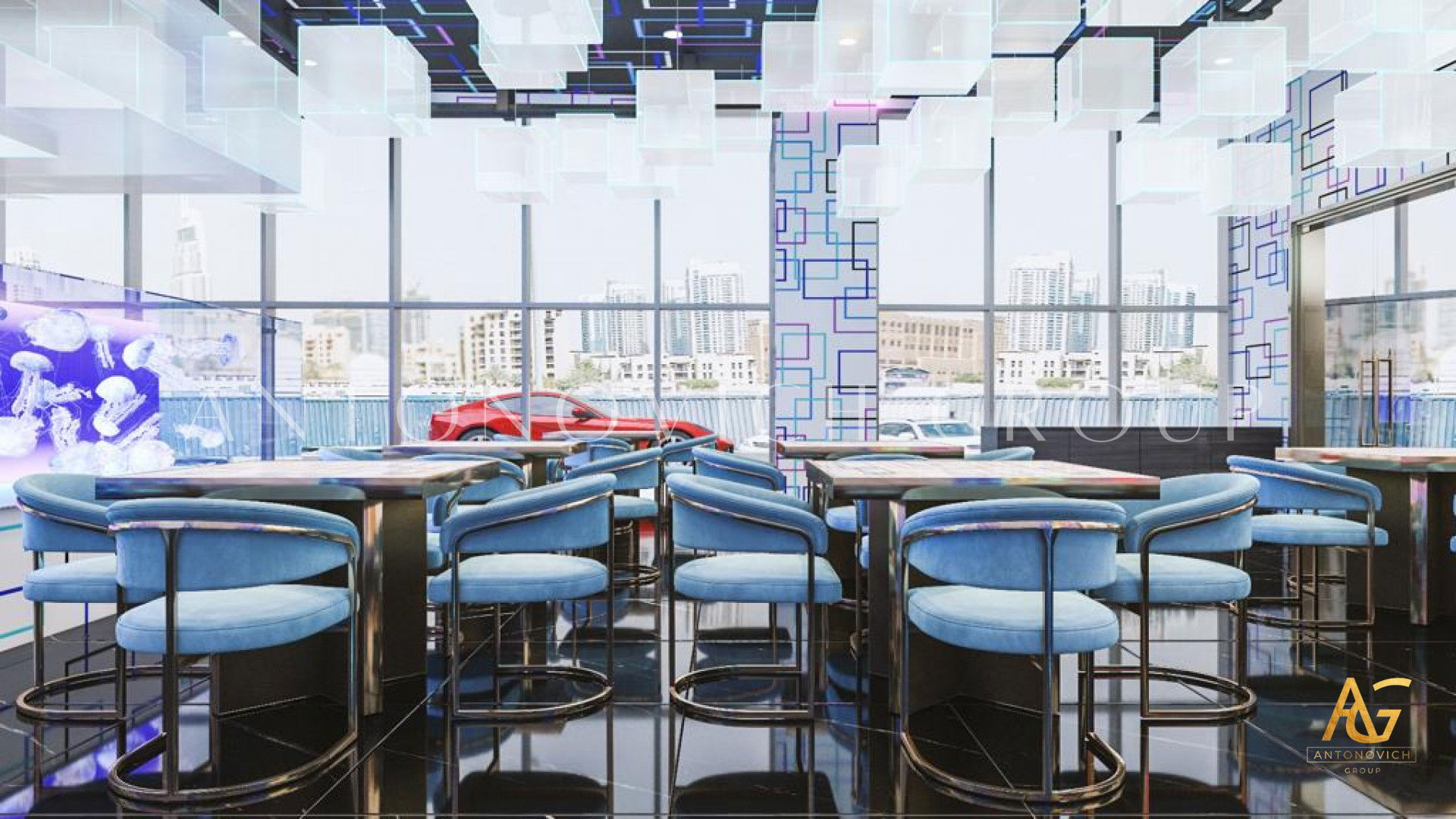 Цвета в современный ресторанный интерьер поражают своей гармонией. Мебель для ресторана премиум-класса тщательно подобрана, каждый элемент продуман для создания премиальной атмосферы. Мебель, которую собрала Антонович Дизайн (Antonovich Design), прекрасна — сочетание цвета и конструкции на высоте. Напольные покрытия для ресторана остаются одной из ключевых деталей роскошного интерьера. Каждая деталь — отдельное произведение искусства. Антонович Дизайн создала этот высококлассный дизайн ресторана в Дубае с целью обеспечить максимальный комфорт клиентов и сформировать модный ресторанный интерьер в ОАЭ. Проект демонстрирует современный ресторанный интерьер в сочетании с утонченной функциональностью.