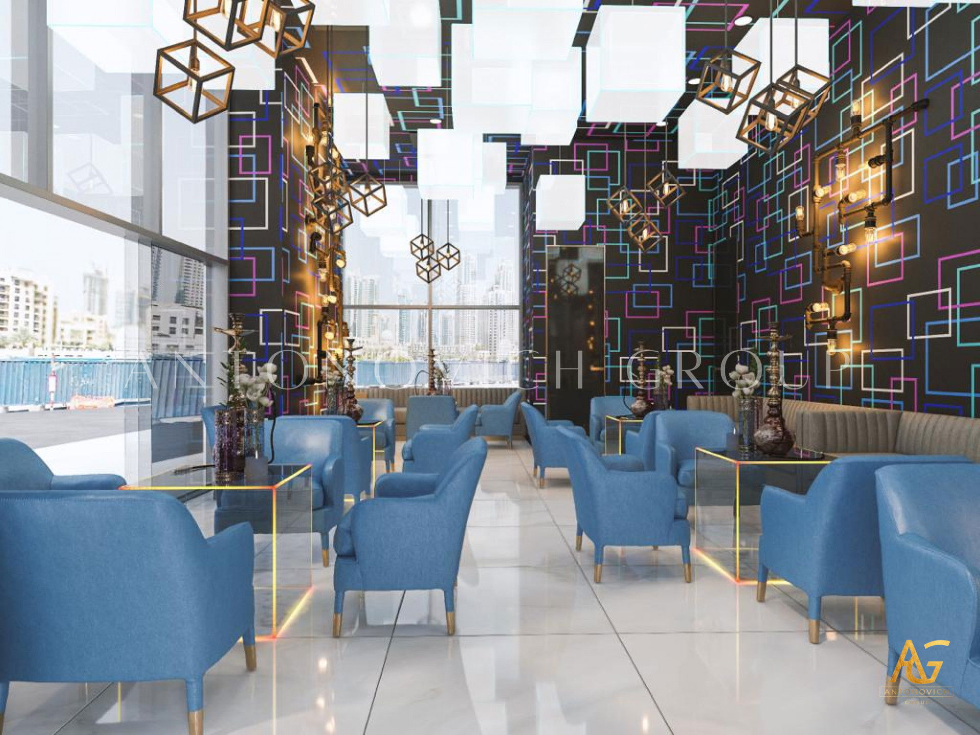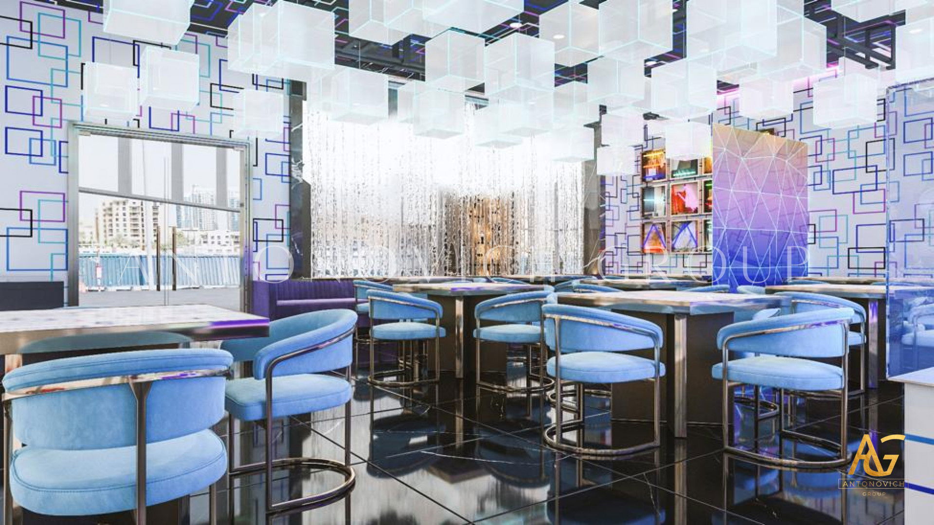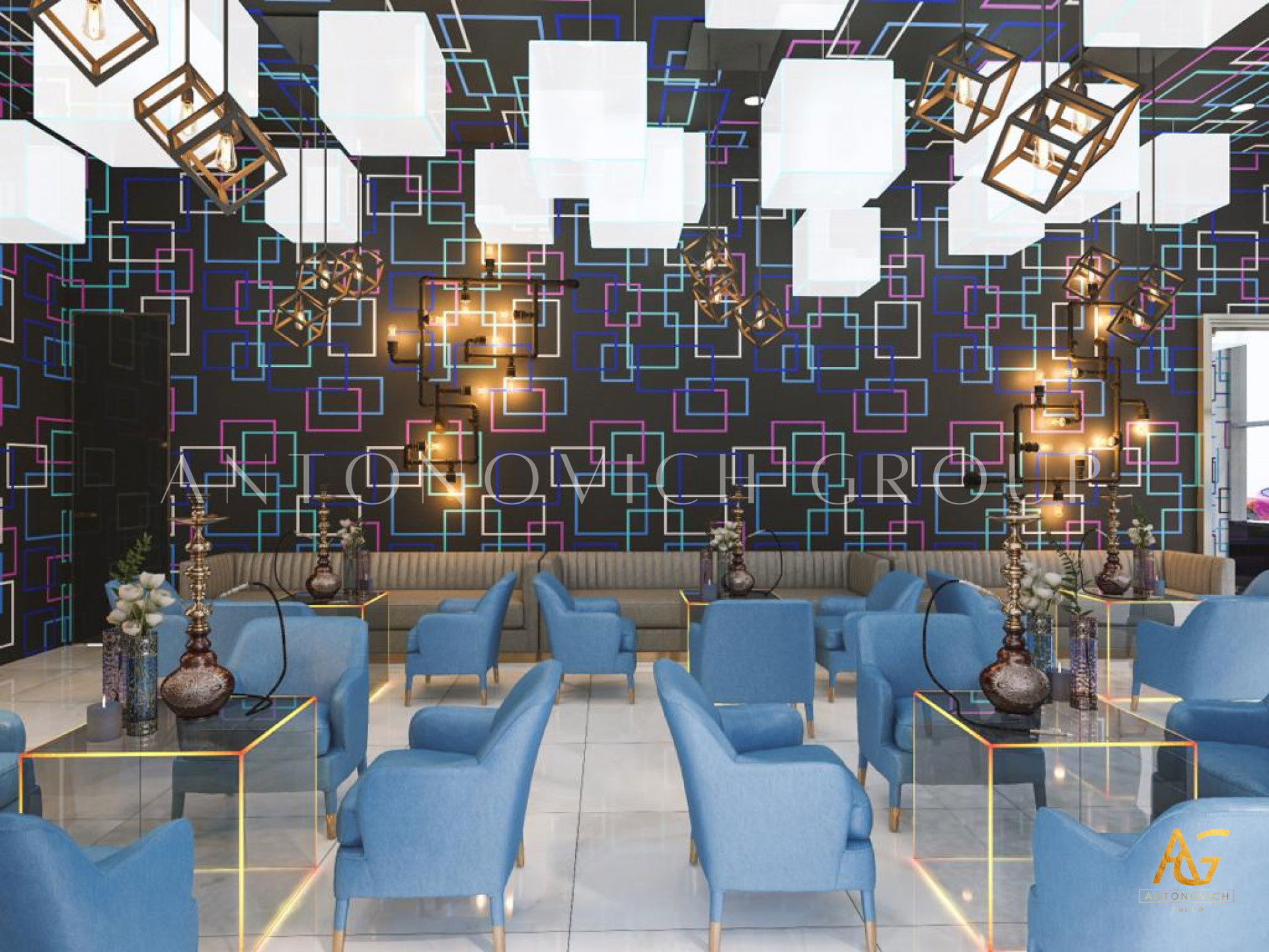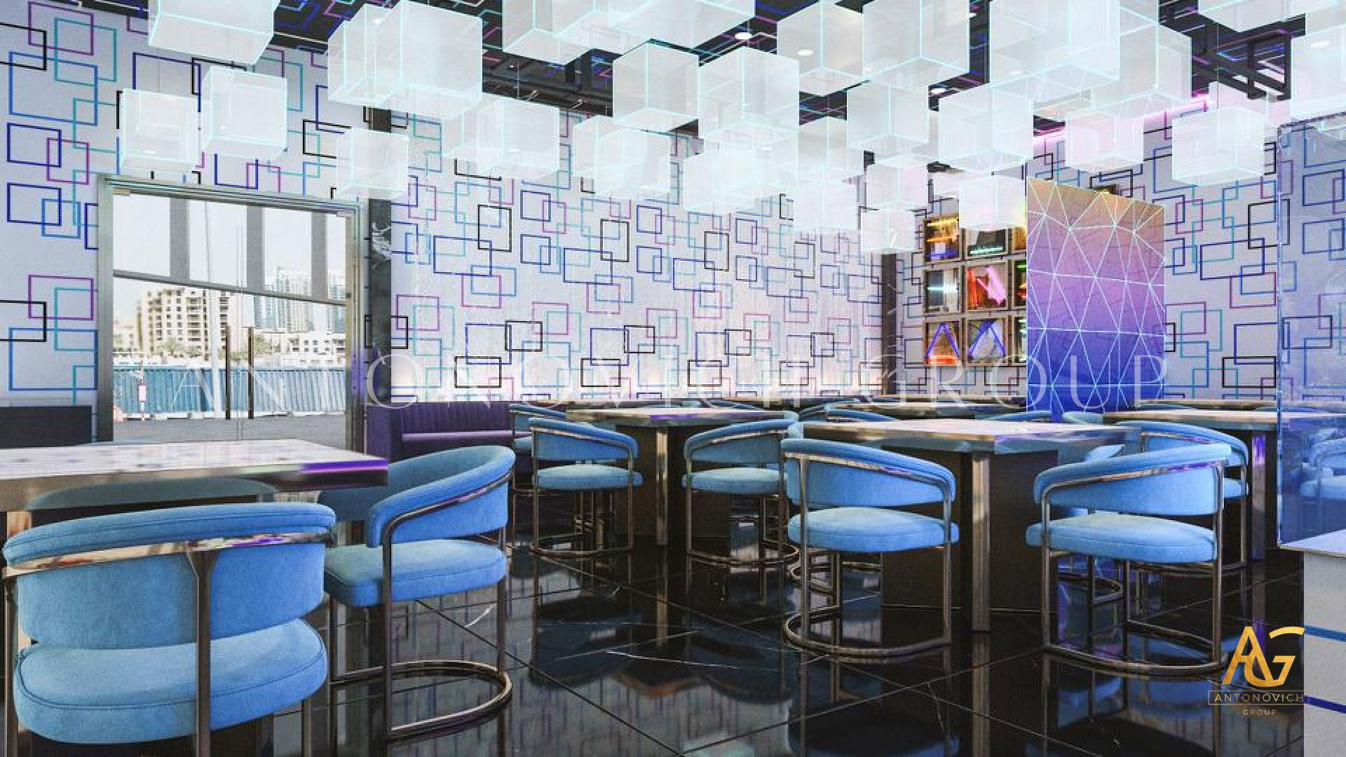 Интерьер этого роскошного заведения выполнен в современном стиле: современный дизайн интерьера ресторана с продуманной композицией и лучшими идеями декора. Оттенки выглядят изысканно и современно. Синие акценты усиливают ресторанный интерьер с синими акцентами. Такой декор ресторана в Дубае подчёркивает элегантность пространства. Диваны и столы подчёркивают ощущение роскоши. Напольные покрытия для ресторана выполнены с вниманием к качеству и создают тёплую, премиальную атмосферу. Барный интерьер ресторана в Дубае придаёт помещению современный и утончённый характер.