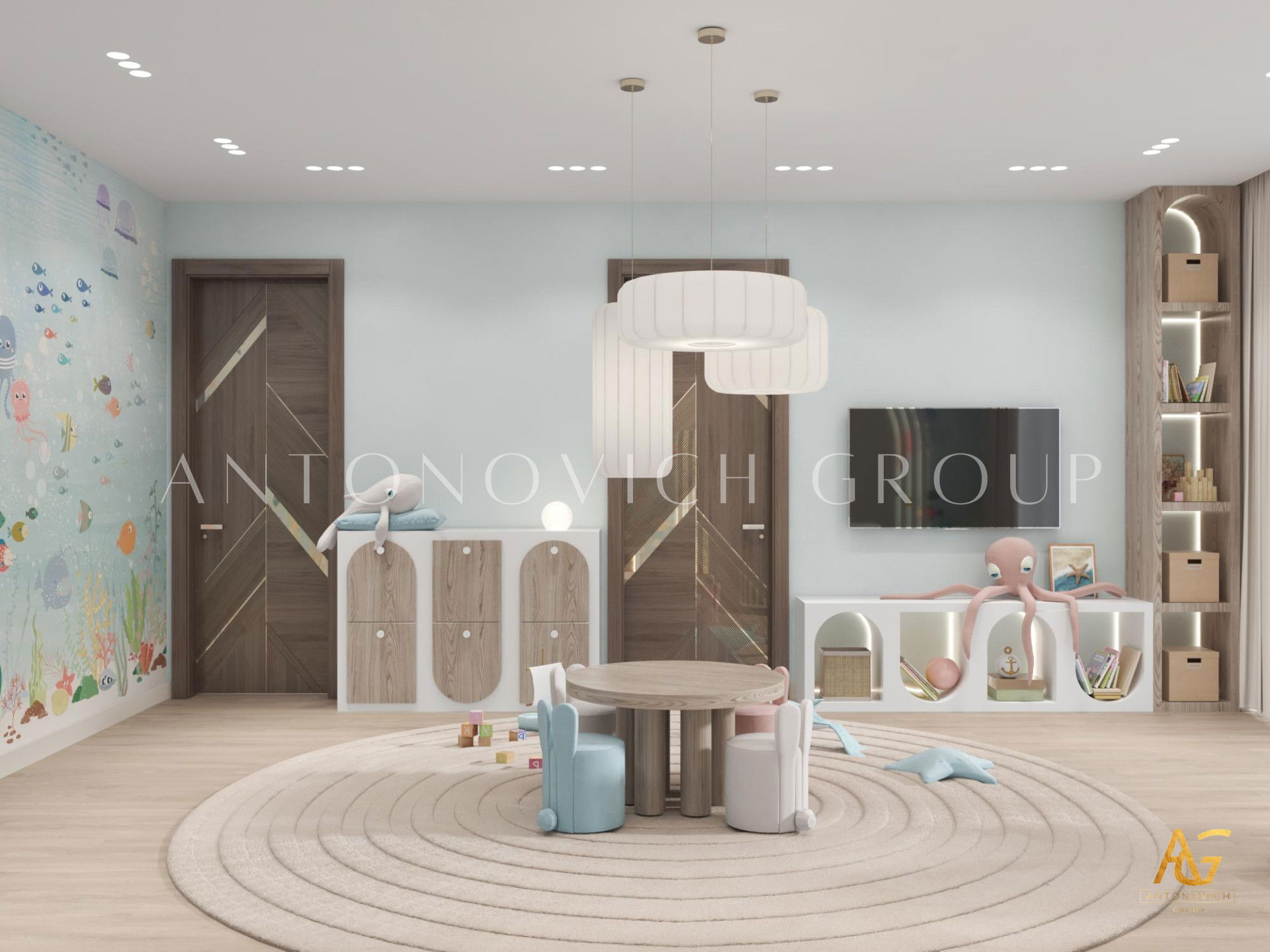 В комнате установлено большое зеркало: большая зеркальная детская спальня позволяет переодеваться и готовиться к дню. При этом пространство спроектировано так, чтобы дети могли свободно двигаться: детская спальня с местом для игр и дизайн просторной детской спальни учитывают зоны для отдыха и активности. Ваши дети полюбят этот интерьер — уют и функциональность объединены в одном решении.