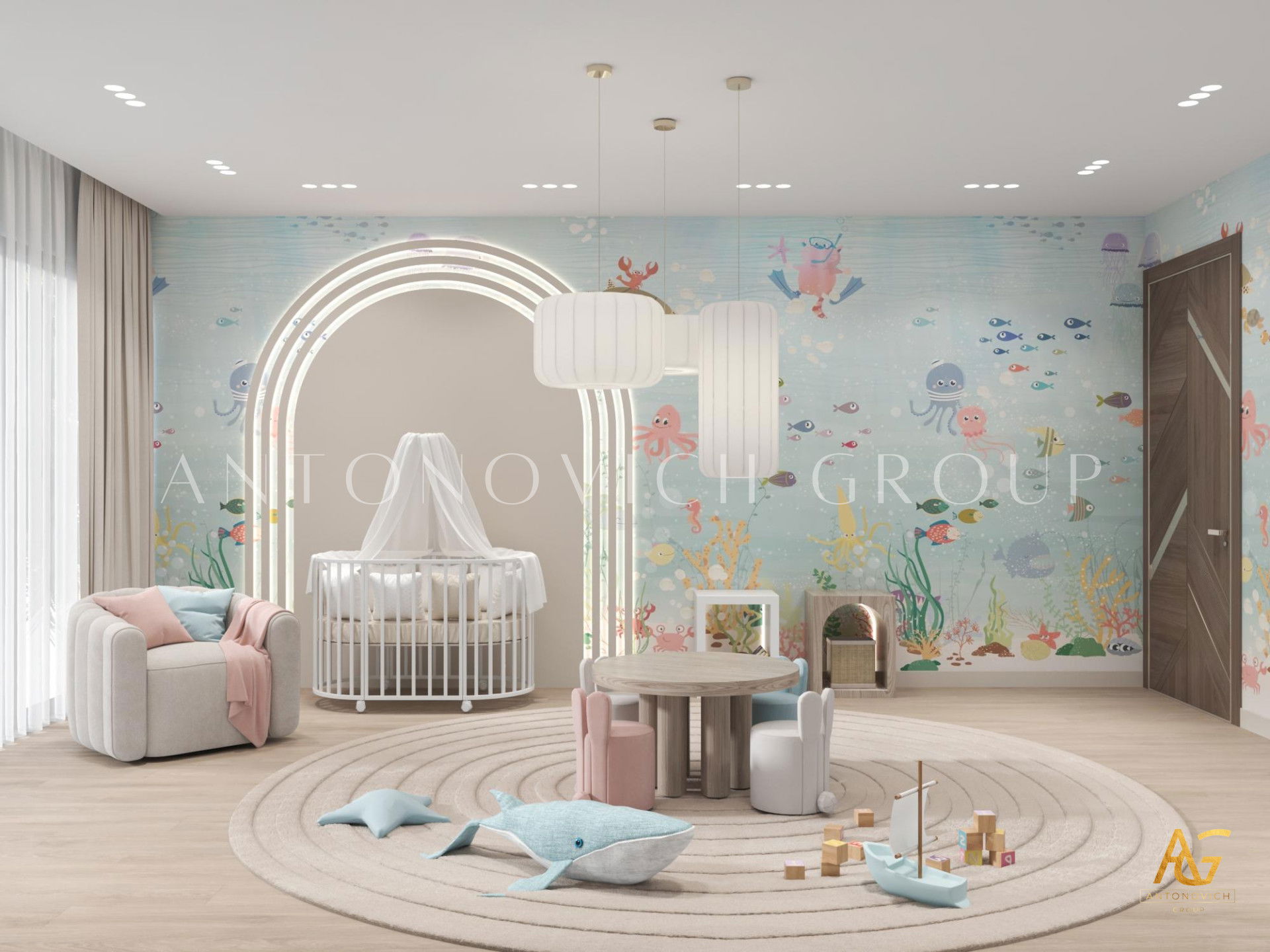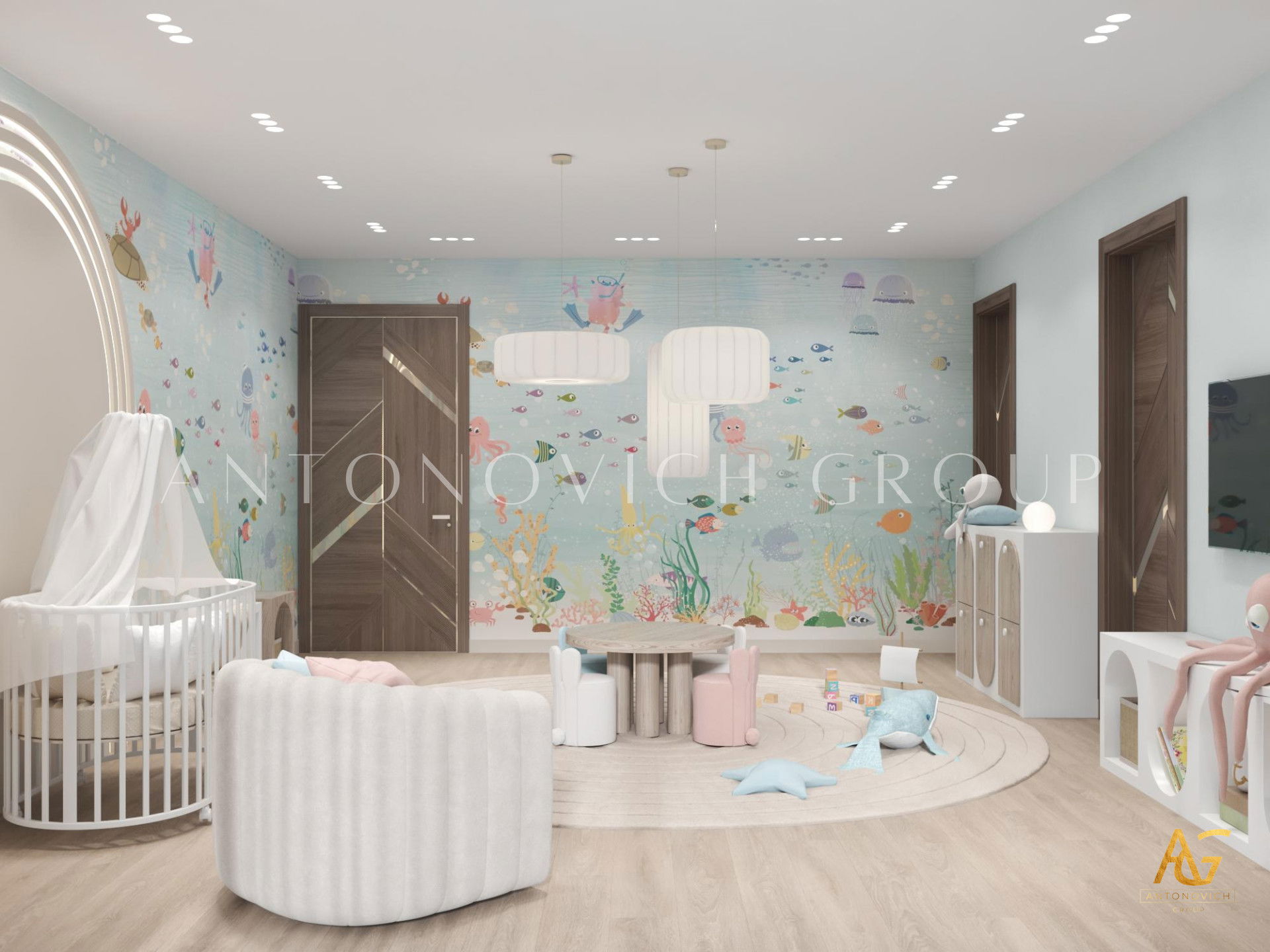 Роскошная детская спальня также отличается продуманным освещением. Уникальная и дорогая люстра привезена в Дубае с особым шиком — это настоящая люстра для детской спальни, которая придаёт комнате изысканность. Детская спальня в Дубае получила особую нотку роскоши. Элегантное изголовье для детской создаёт плавные, текучие линии и служит центральным декоративным акцентом.