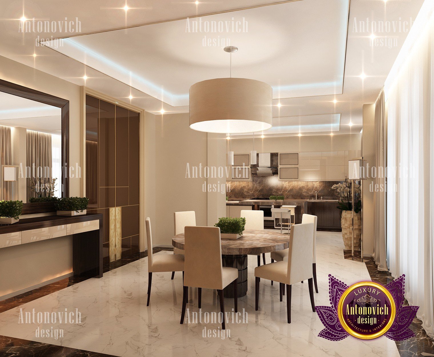 Столовая зона также впечатляет. Её оформление столовой зоны и элегантность усиливают общую атмосферу. Впечатляющие стулья и круглые столы удивляют роскошными деталями и стилем. Такие элементы — это детали интерьера элитной квартиры. Освещение для роскошного интерьера продумано до мелочей и выглядит утончённо. Уютный дизайн квартиры заметен в каждой зоне. Такой дизайн квартиры Эмирейтс-Хиллз подчёркивает статус и комфорт жилья.