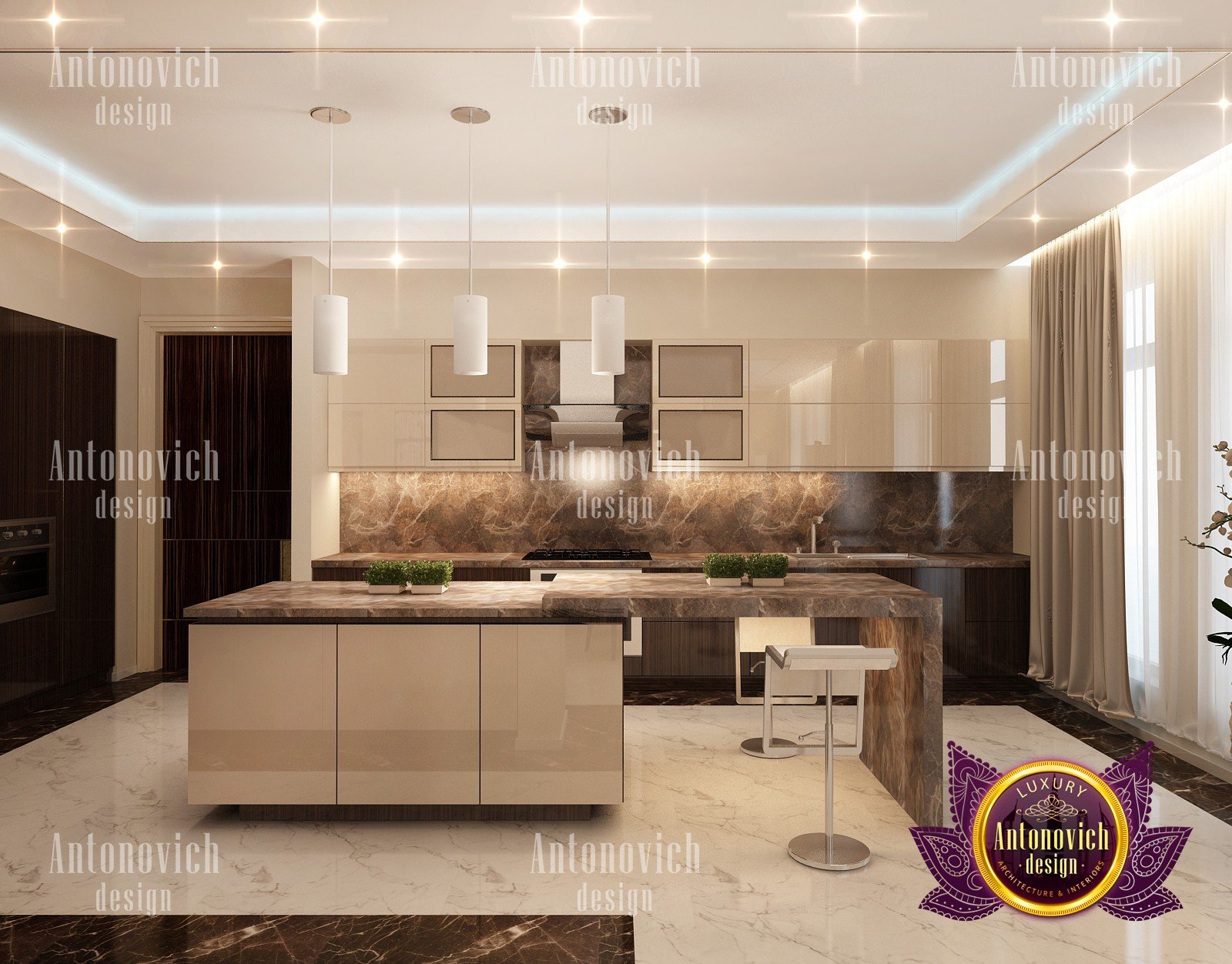 Красивая кухня спроектирована со вкусом и функциональностью. Большое пространство и эргономичная планировка обеспечивают лёгкость и комфорт. Готовить завтрак всегда приятно! Это роскошная кухня в квартире, где каждая деталь продумана. Её мраморный центральный элемент и мраморный пол в интерьере гармонируют между собой. Кремово-коричневые акценты в интерьере выглядят изысканно. Вы не устанете готовить здесь обед и ужин!