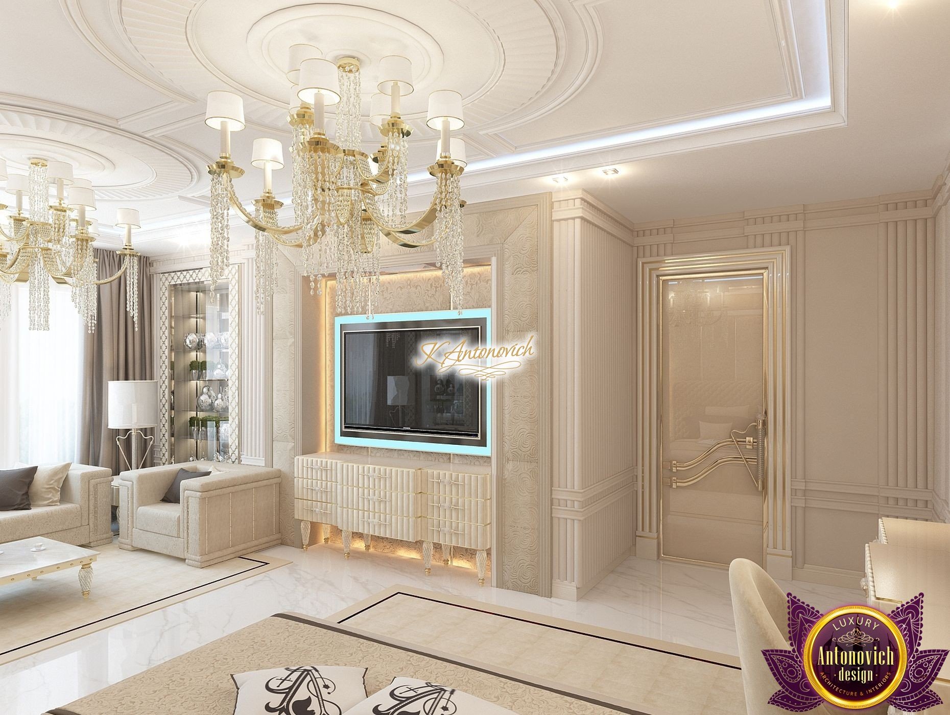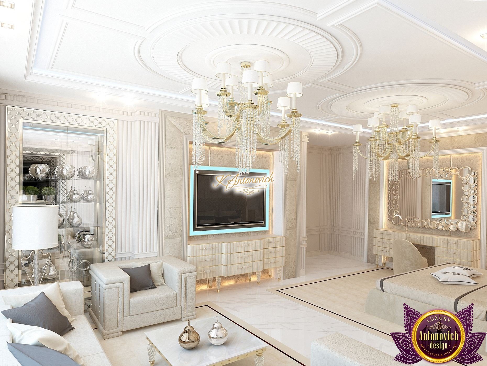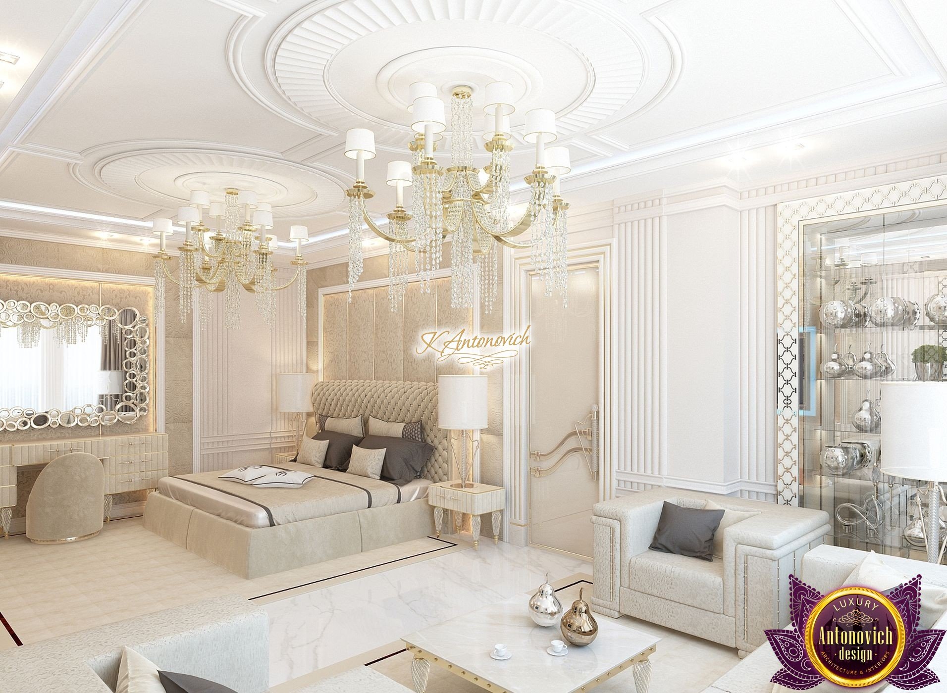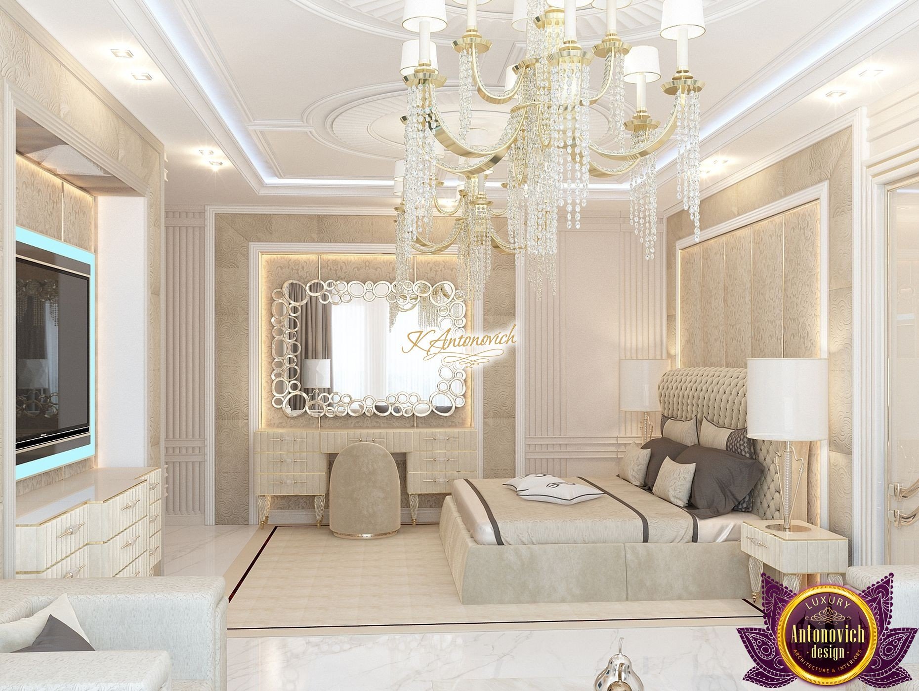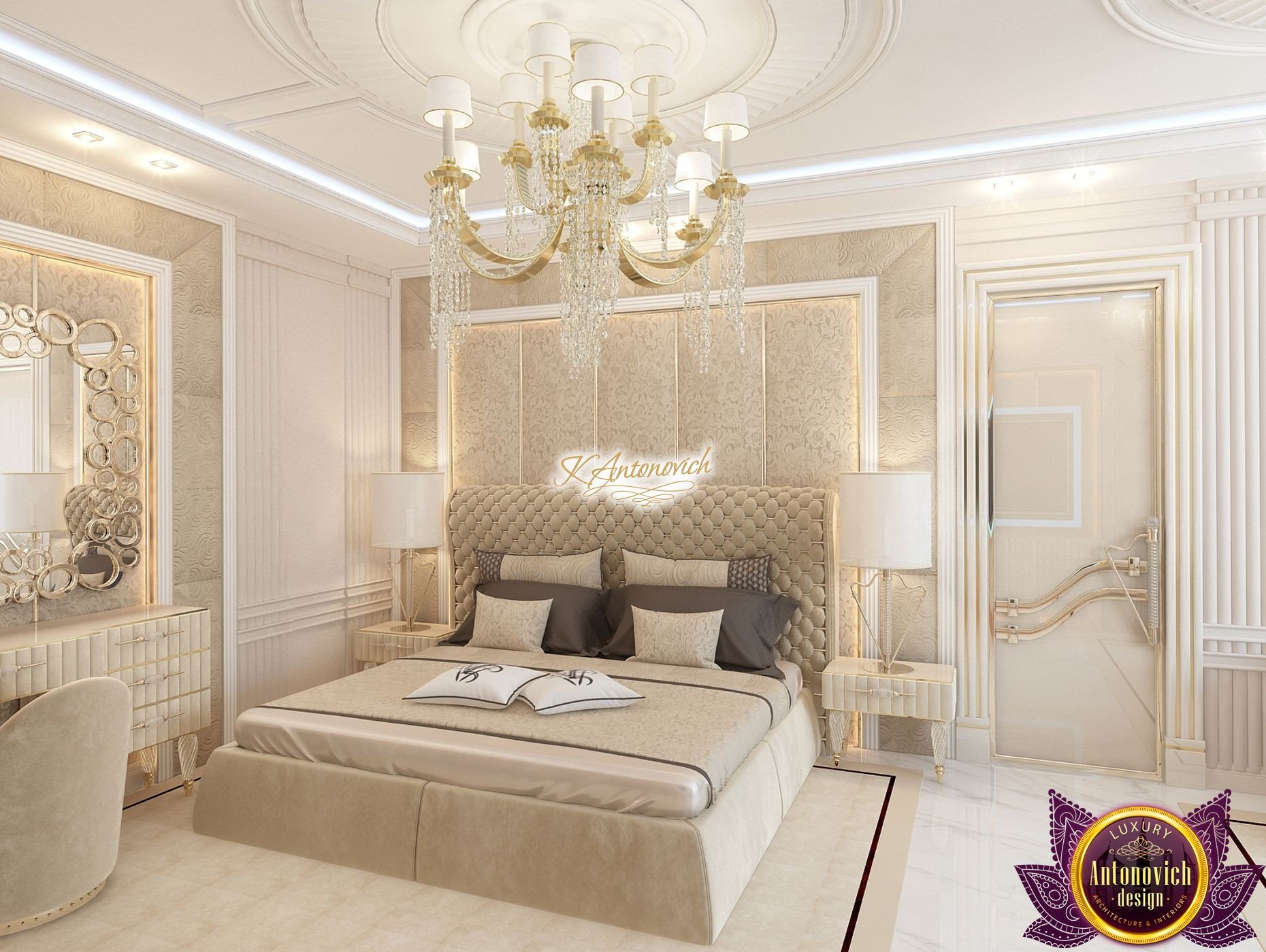 Кремовая теплота домашнего уюта буквально наполняет пространство этой изысканной спальни. В этом проекте слились неоклассика, акценты ар-деко и элементы современного стиля. Это уютный интерьер спальни: интерьер спальни в стиле неоклассика и интерьер спальни в стиле ар-деко гармонично сочетаются. Дизайнеры интерьерной студии Антонович Дизайн (Antonovich Design) мастерски импровизируют с материалами, фактурами и оттенками, чтобы достичь эффекта изящной роскоши. Главный акцент интерьера — большая кровать с высоким изголовьем. Изголовье обито мягким бархатом кремового тона, бархатное изголовье для спальни с неглубокими рельефами придаёт этому декоративному элементу особое очарование. Текстильные панели — один из самых популярных элементов настенной отделки. Текстильные панели для спальни наполняют комнату особенно уютной и мягкой атмосферой, а также обеспечивают отличную шумоизоляцию. Шумоизоляция спальни текстиль способствует полноценному отдыху. В этом интерьере панель обита благородными тканями с принтом: вертикальная утяжка и линия подсветки по периметру идеально подчёркивают текстуру ткани. Мраморный пол в спальне украшен мягкими коврами — натуральные ковры для спальни создают контраст и тепло. Дизайн спальни с туалетным столиком смотрится великолепно: большой будуарный стол и мягкое бархатное кресло гармонируют с большим зеркалом в оригинальной раме. По бокам кровать дополнена элегантными столиками на хрустальных ножках. Просторное помещение разделено на две зоны: зона отдыха с диванами и креслами расположена у окна, где размещена мягкая мебель у окна в спальне. Для зонирования пространства дизайнеры используют ковры и потолочную отделку — классическое зонирование спальни и гостиной.