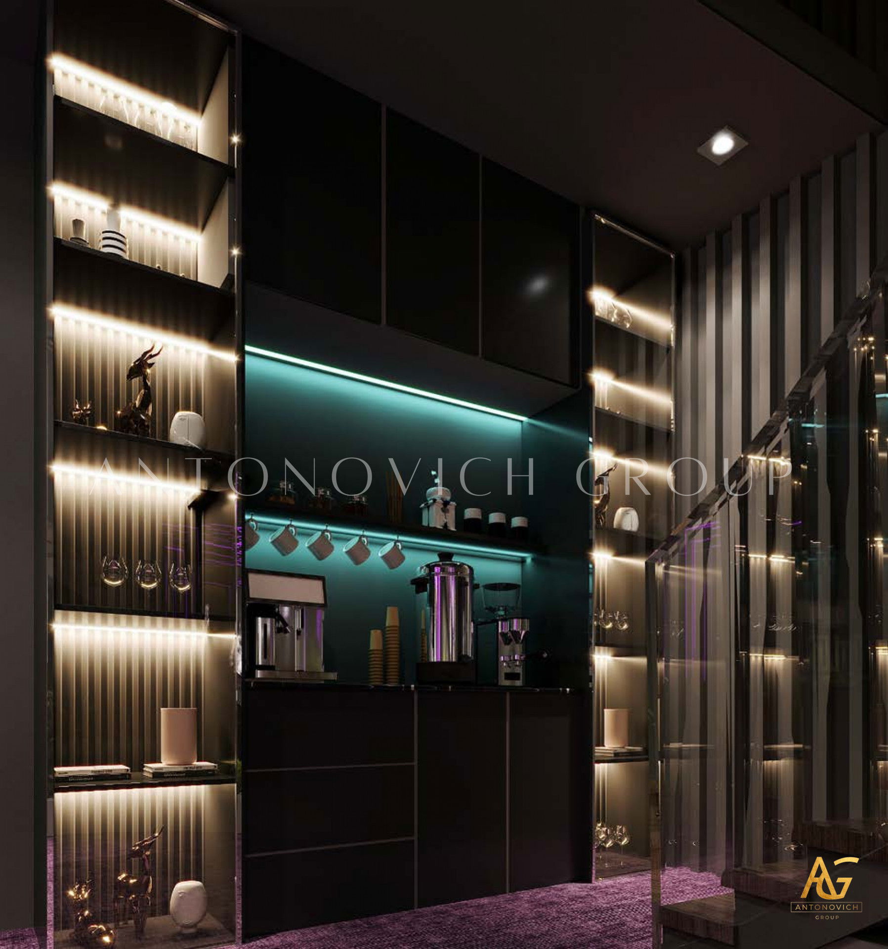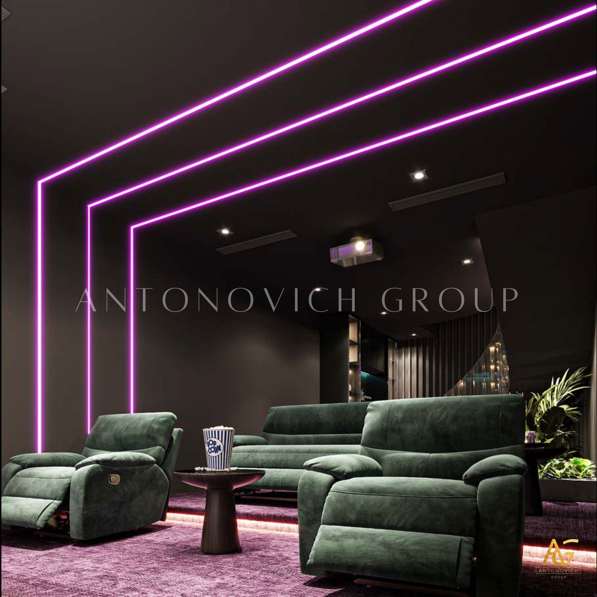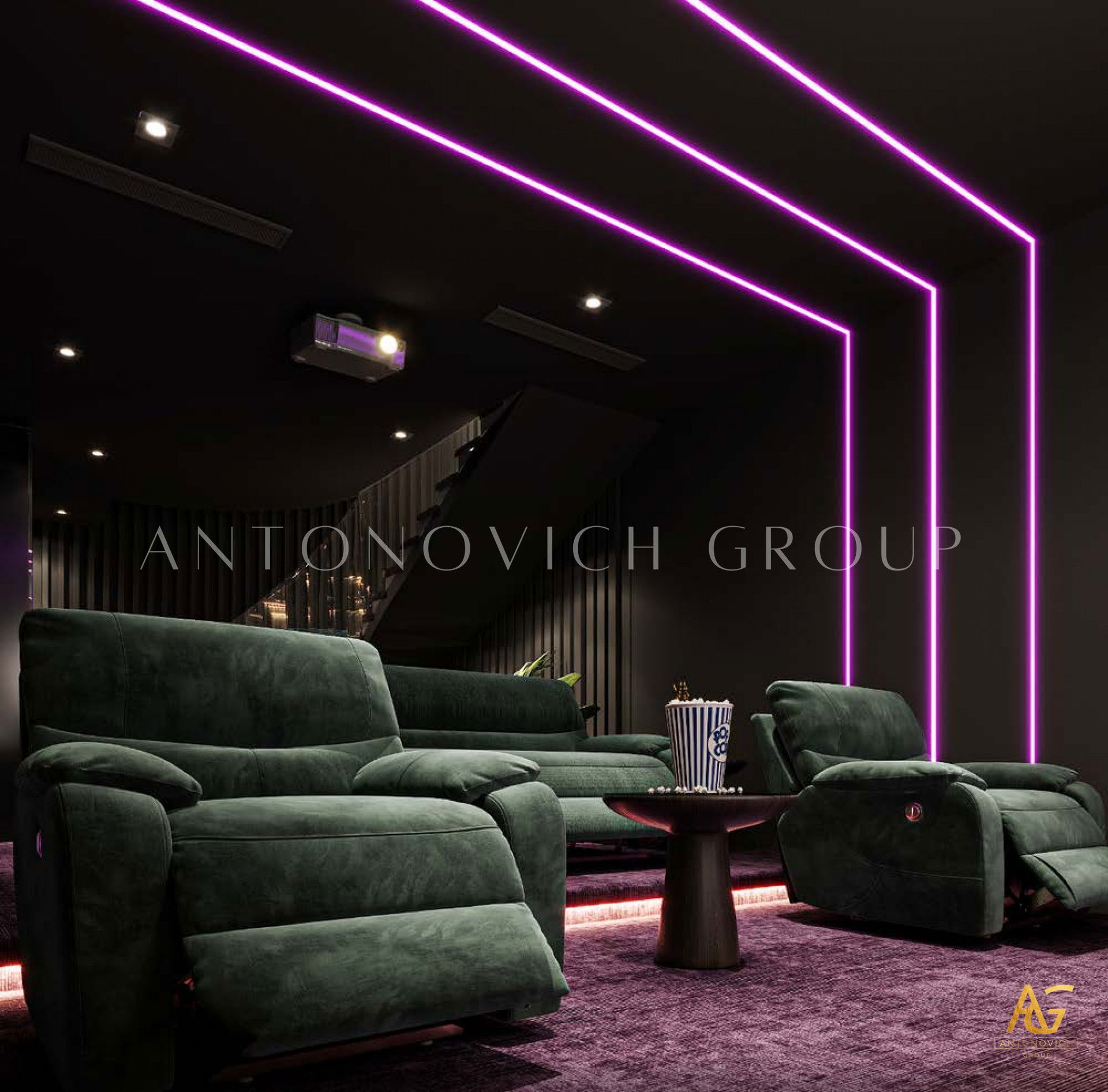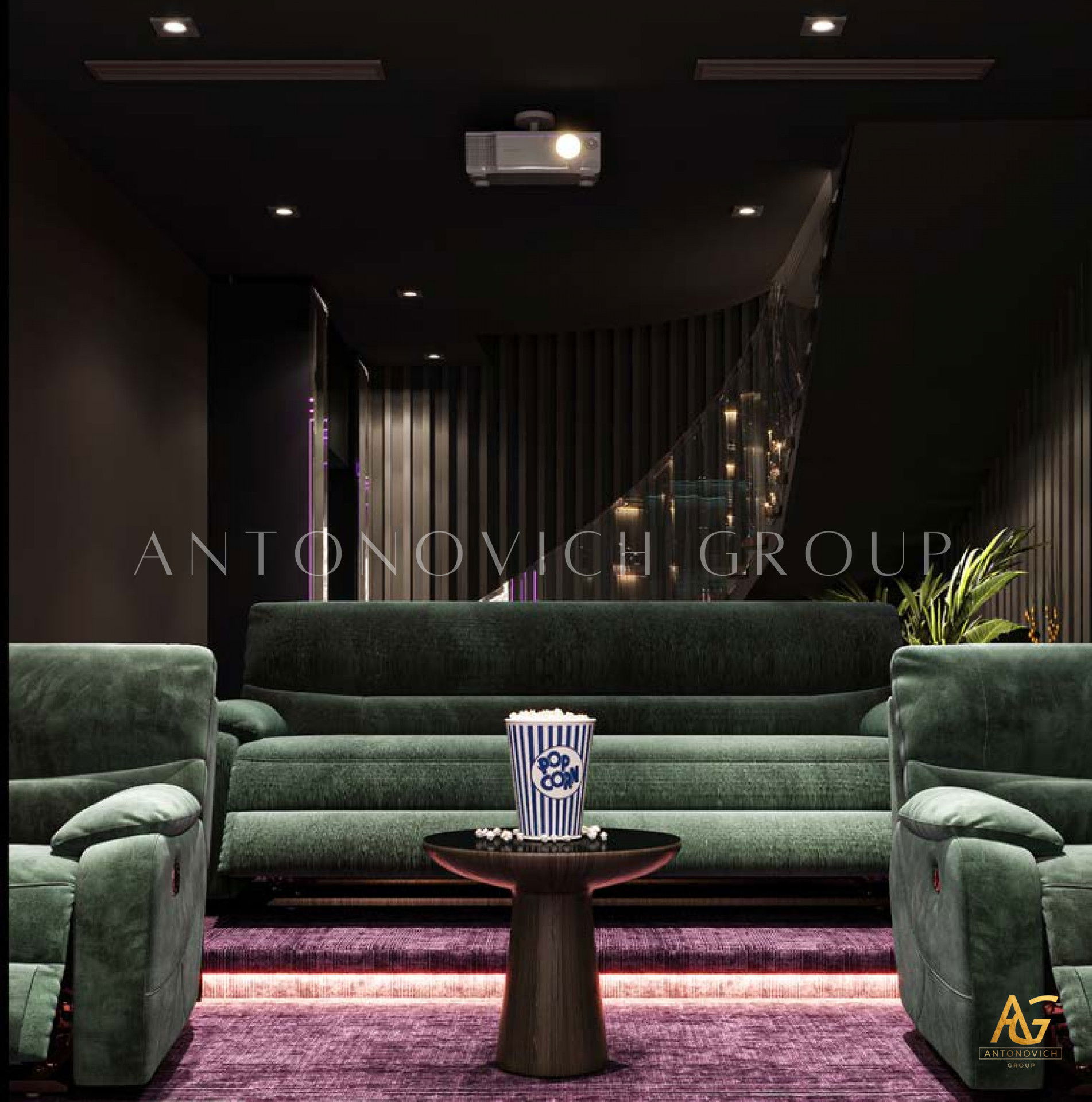 В сфере интерьерного дизайна Антонович Групп (Antonovich Group) постоянно переосмысливает понятие роскоши и утончённости. Недавняя реализация — роскошный домашний кинотеатр с креслами-реклайнерами из тёмно-зелёного бархата и выразительными чёрно-розовыми акцентами — впечатляет любителей дизайна. Этот проект показывает, как дизайн домашнего кинотеатра объединяет кинематографичность и уют, создавая атмосферу роскоши и комфорта для зрителя.