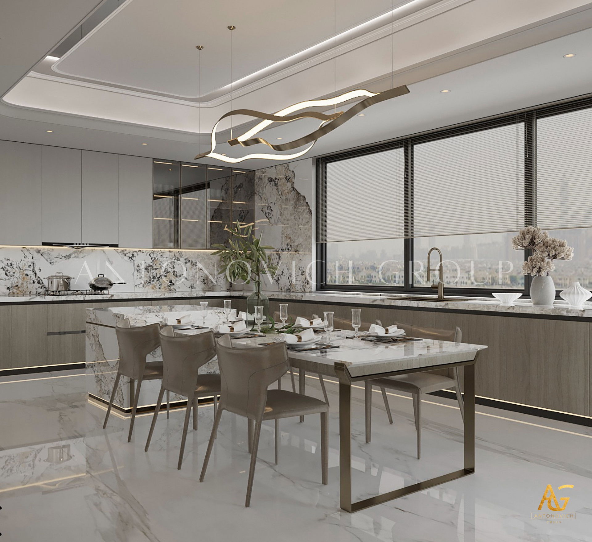 Интерьеры современной кухни от Антонович Дизайн отмечены чистыми линиями и минимализмом. Рациональные формы и продуманное расположение элементов создают атмосферу сдержанной элегантности. Интеграция современных концепций дизайна гарантирует, что каждая кухня становится площадкой, где кулинарное творчество встречается с актуальной эстетикой.