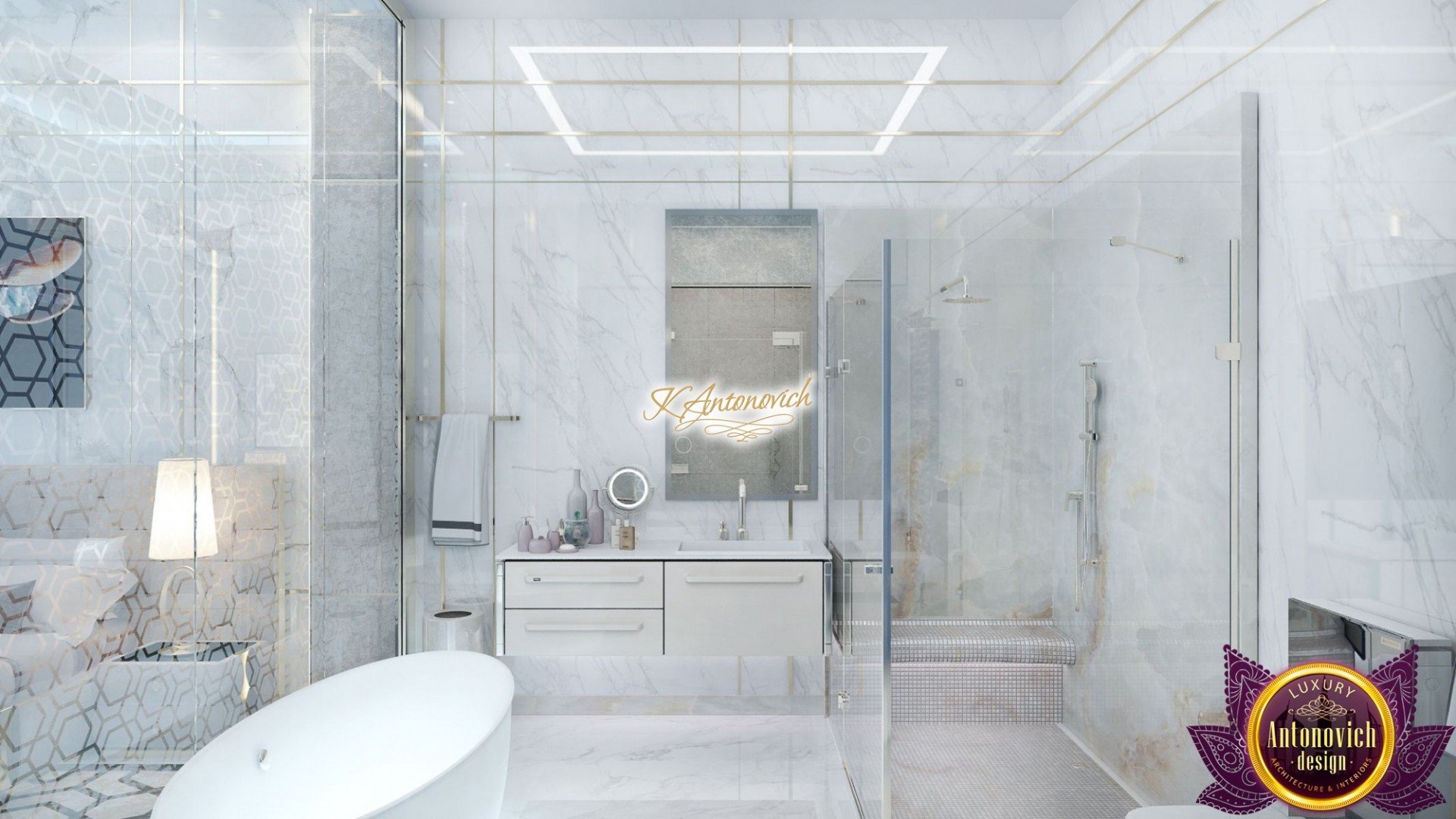 Стеклянные панели, отделяющие спальню от ванной, придают пространству прозрачный характер — это спальня с застеклённой ванной, где ничто не скрыто и дом ощущается открытым. Автоматические шторы для спальни пропускают естественный свет днём и обеспечивают приватность ночью. Стены и мебель дополняют друг друга: разные тона холодной палитры создают иллюзию, что мебель — часть стены, как, например, стол под телевизор. Эти приёмы — часть дизайн современной спальни. Здесь реализован эргономичный дизайн интерьера спальни.