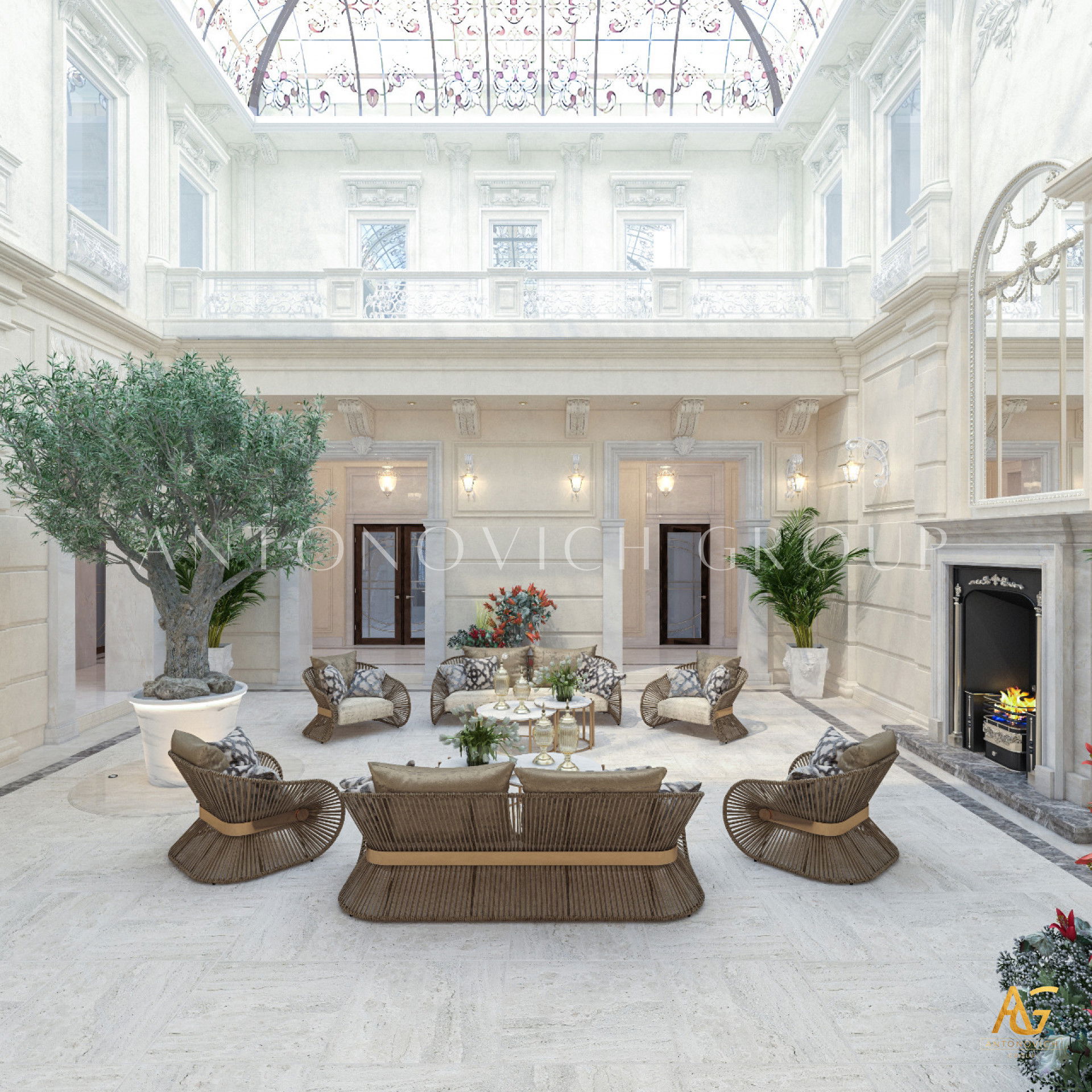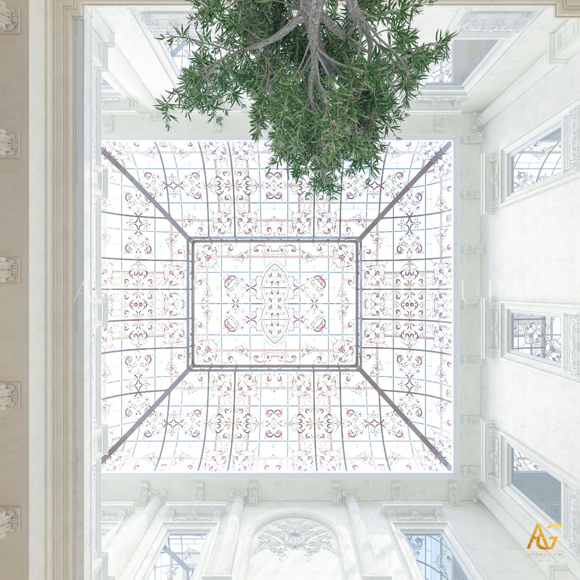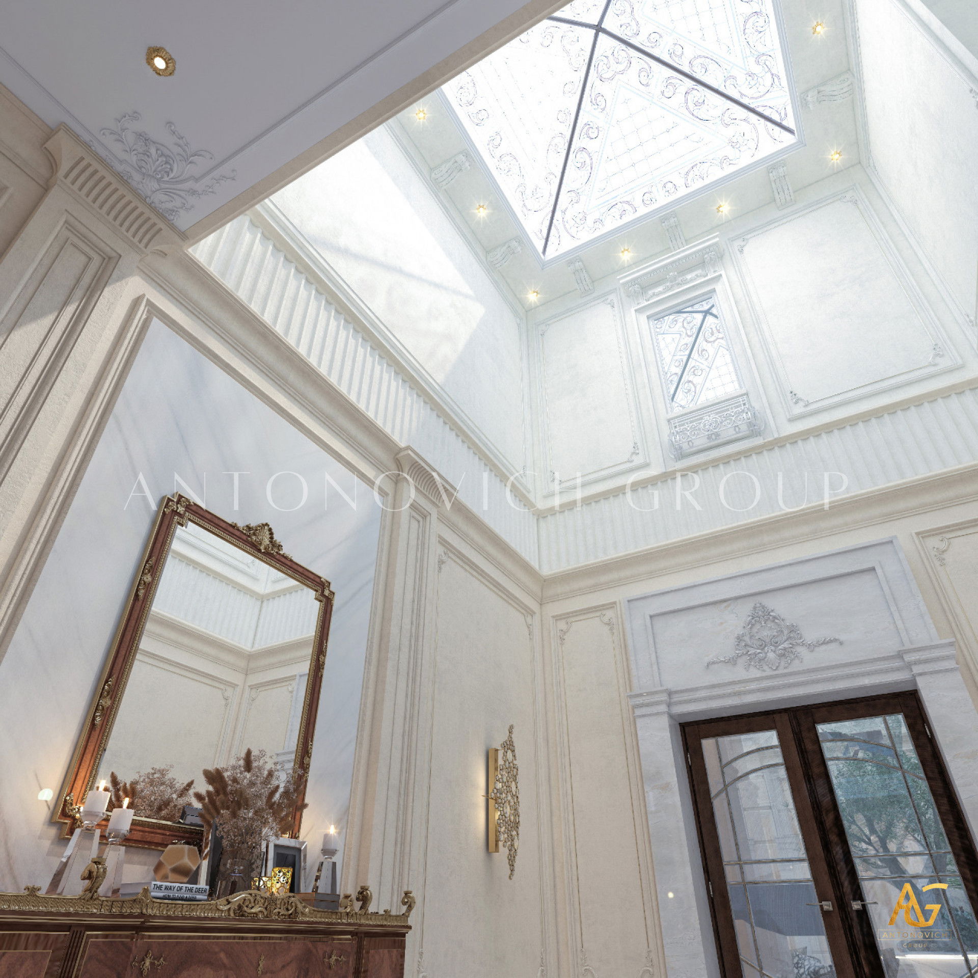 Антонович Дизайн применила открытую планировку в зоне прихода и гостевого приёма. Здесь возведён художественный купол из стекла с комбинированием фибры и витражей. Именно такой дизайн купола задаёт королевский лад интерьеру. Создание купольных конструкций — задача высокой технической и художественной сложности; над ней работала команда профессионалов с необходимой квалификацией. Сочетание искусства, креативности и мастерства позволило реализовать уникальный дизайн купола, характерный для многих роскошных вилл региона.