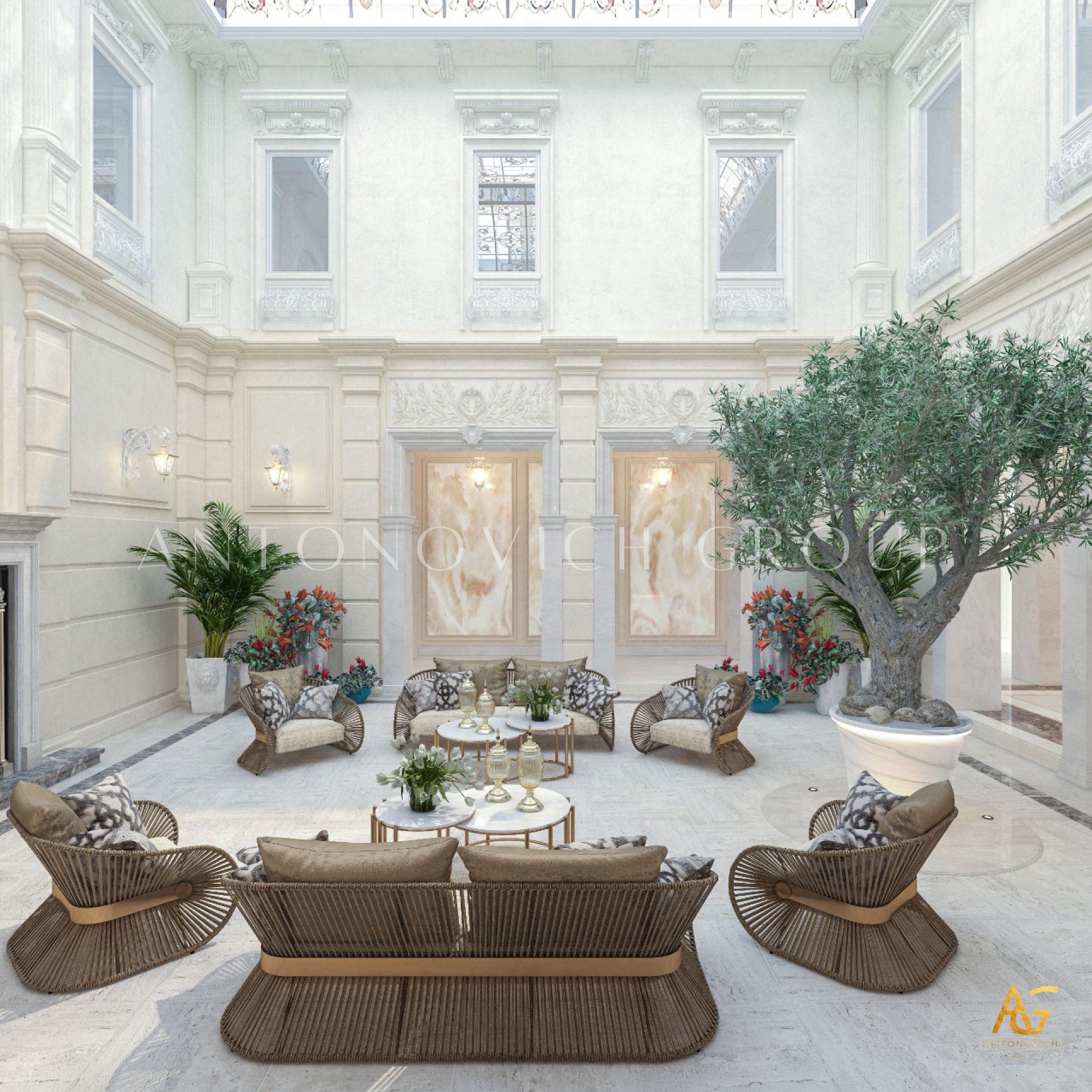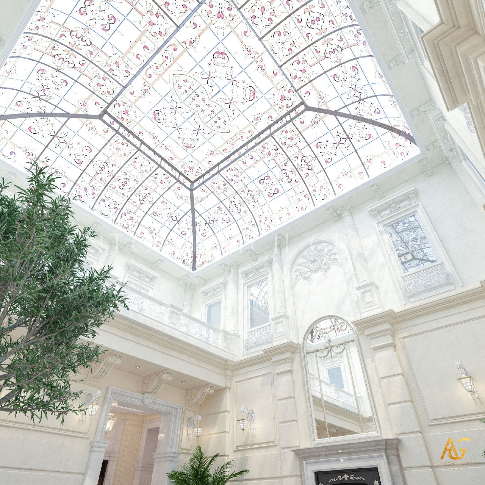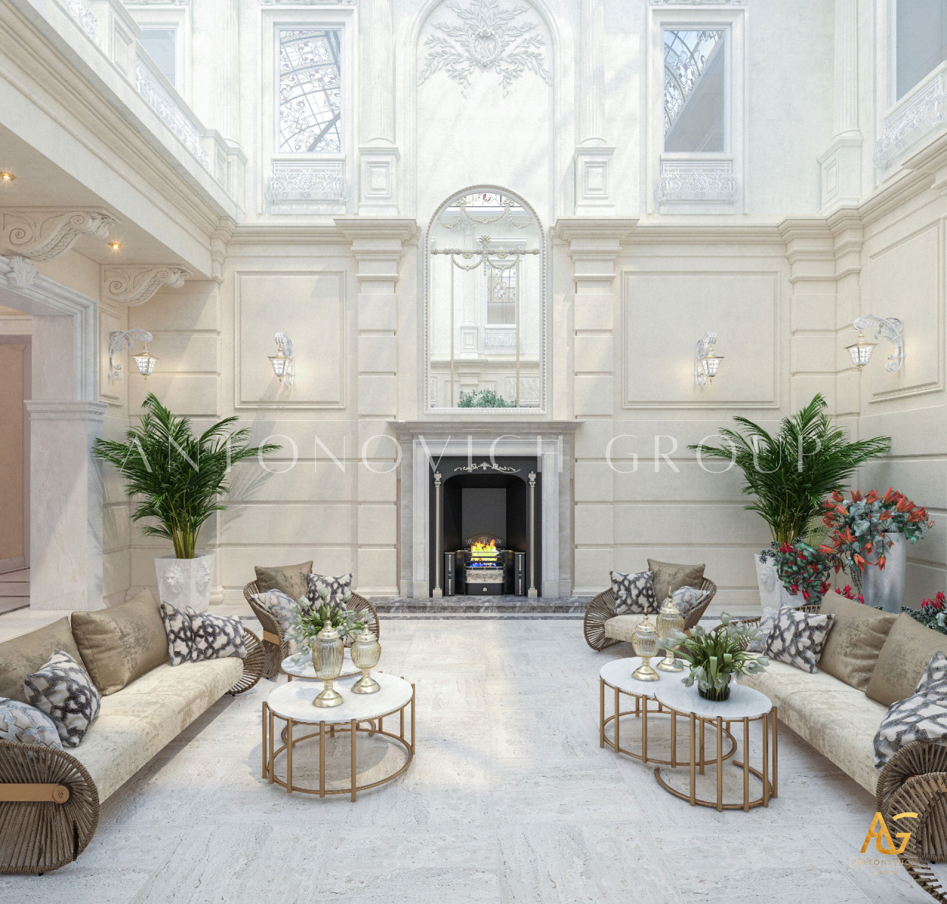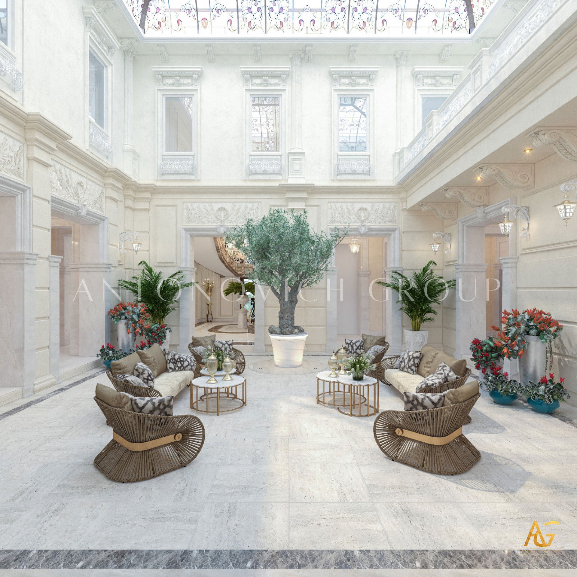 Антонович Дизайн применила открытую планировку в зоне прихода и гостевого приёма. Здесь возведён художественный купол из стекла с комбинированием фибры и витражей. Именно такой дизайн купола задаёт королевский лад интерьеру. Создание купольных конструкций — задача высокой технической и художественной сложности; над ней работала команда профессионалов с необходимой квалификацией. Сочетание искусства, креативности и мастерства позволило реализовать уникальный дизайн купола, характерный для многих роскошных вилл региона.