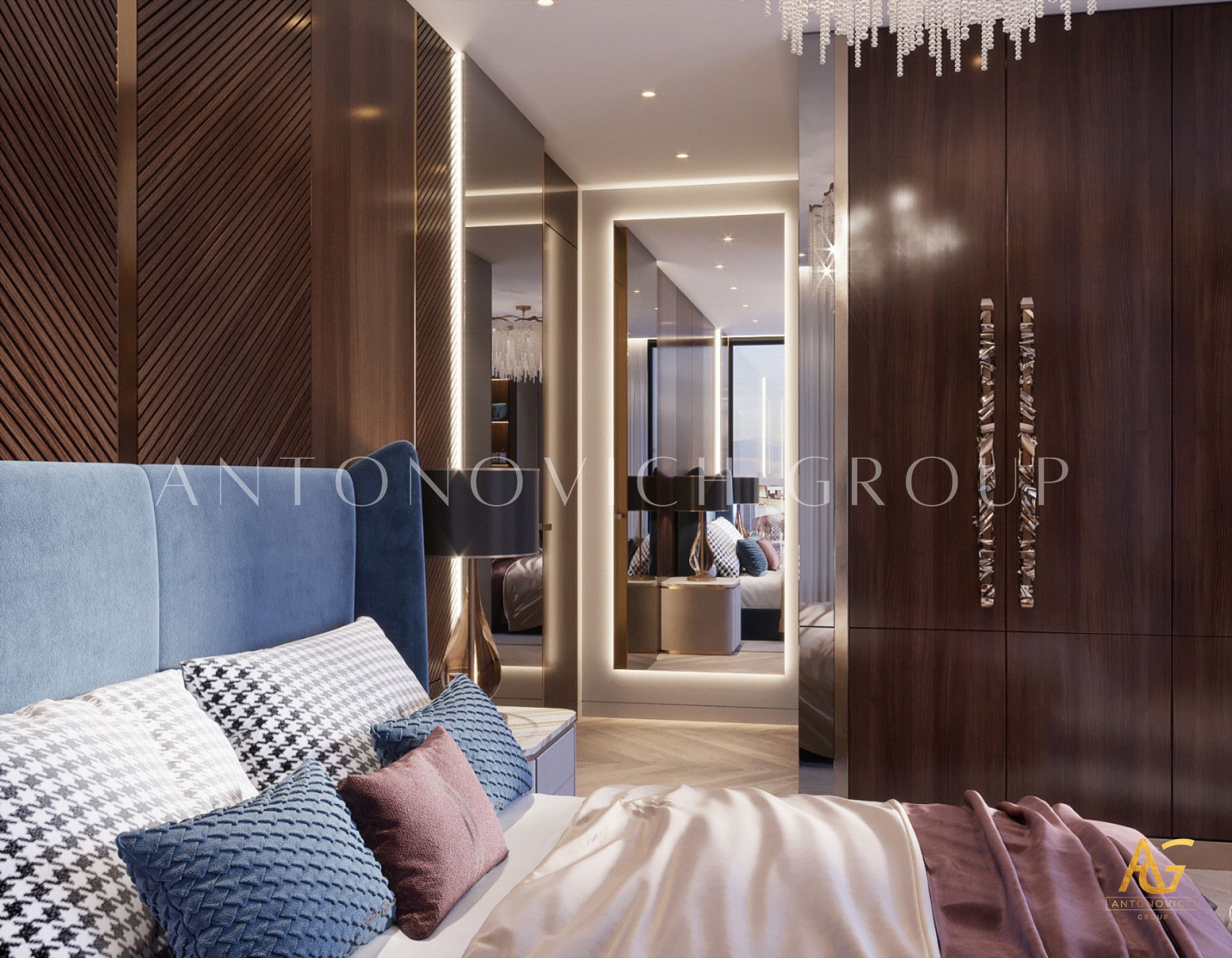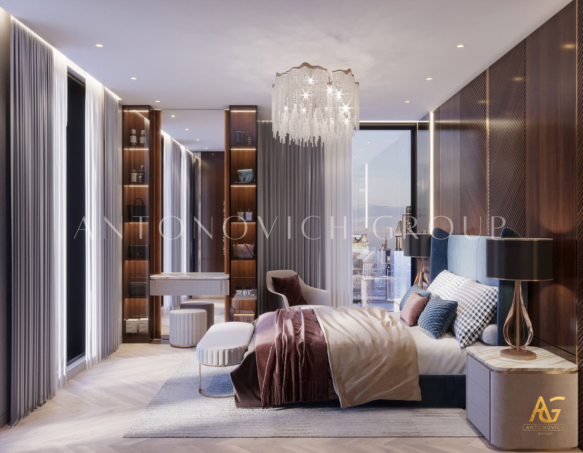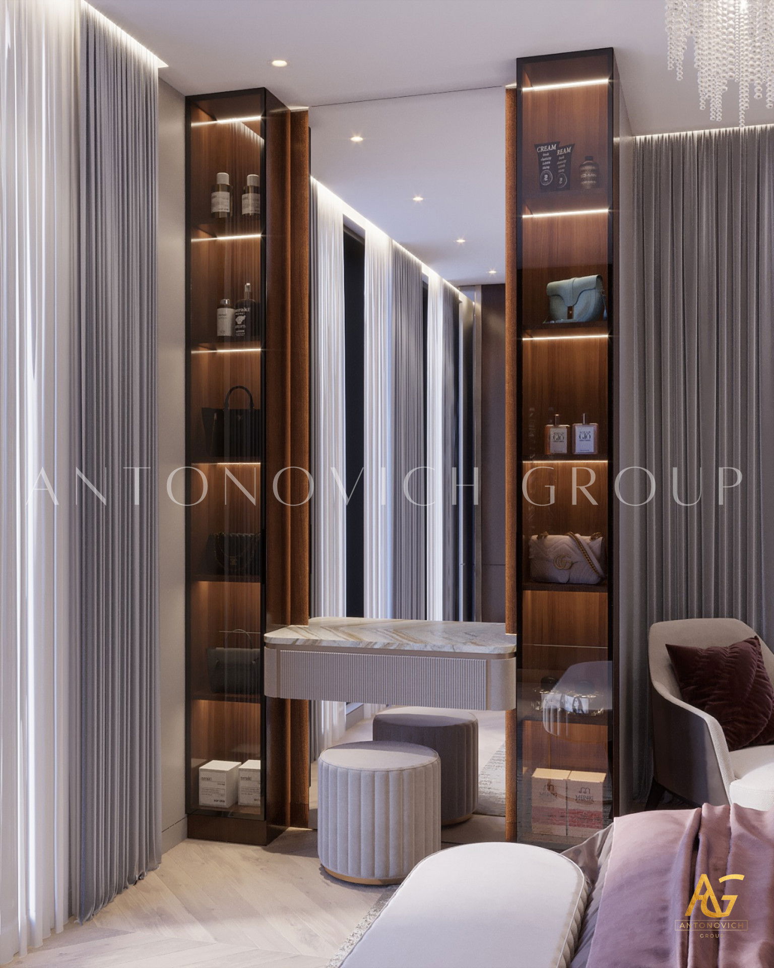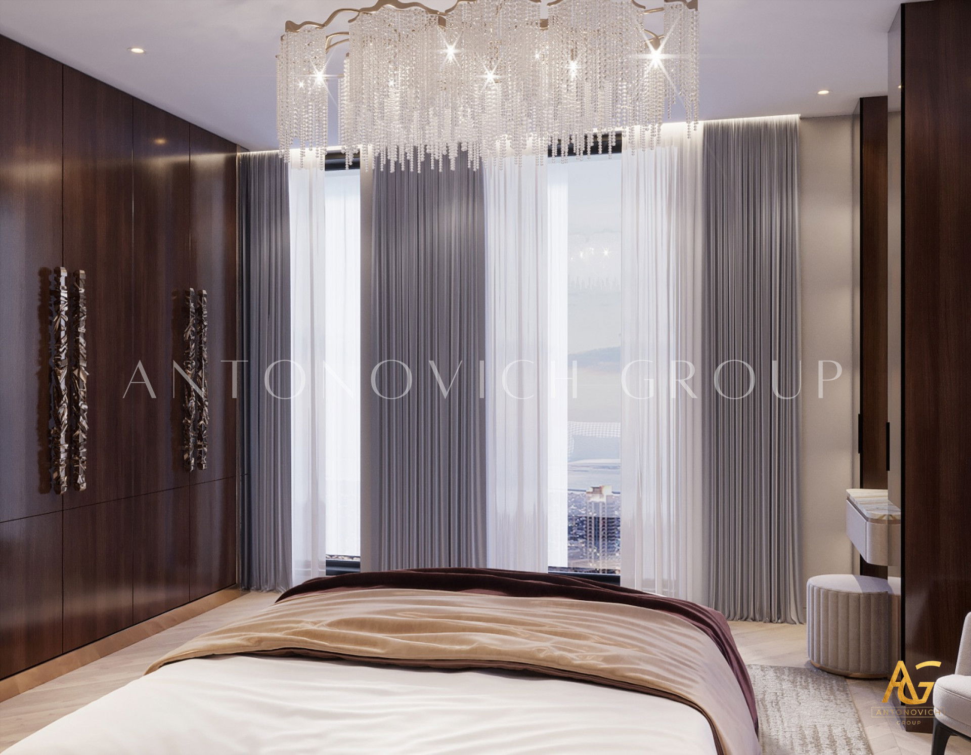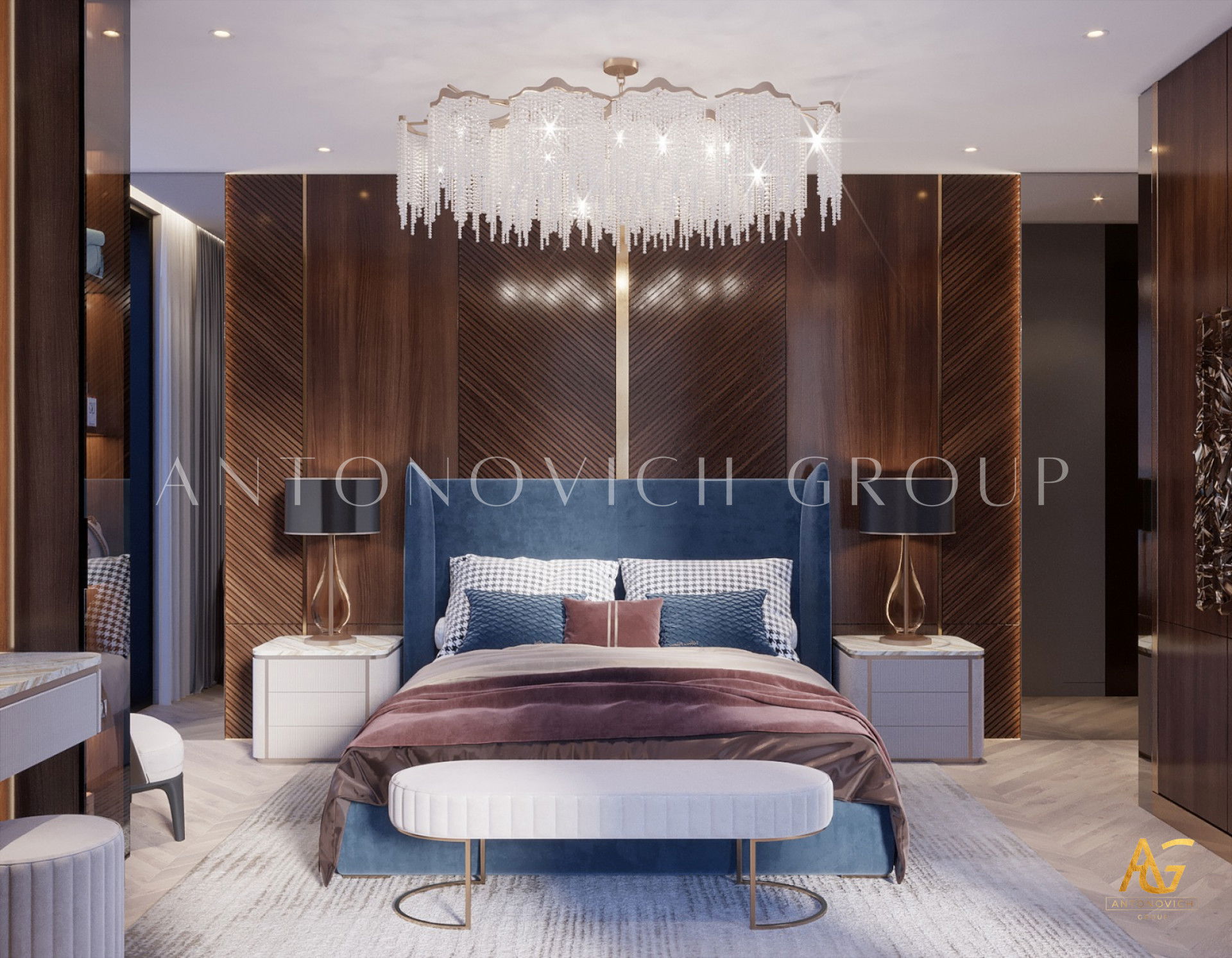 Проекты Антонович Дизайн неизменно демонстрируют проектирование спальни класса люкс: каждая спальня воспринимается как шедевр — персонализированный ретрит, отражающий характер владельца. От продуманной темы до сияющих люстр, индивидуальной мебели и гармоничной палитры — всё направлено на создание бескомпромиссного пространства роскоши и вечной элегантности.