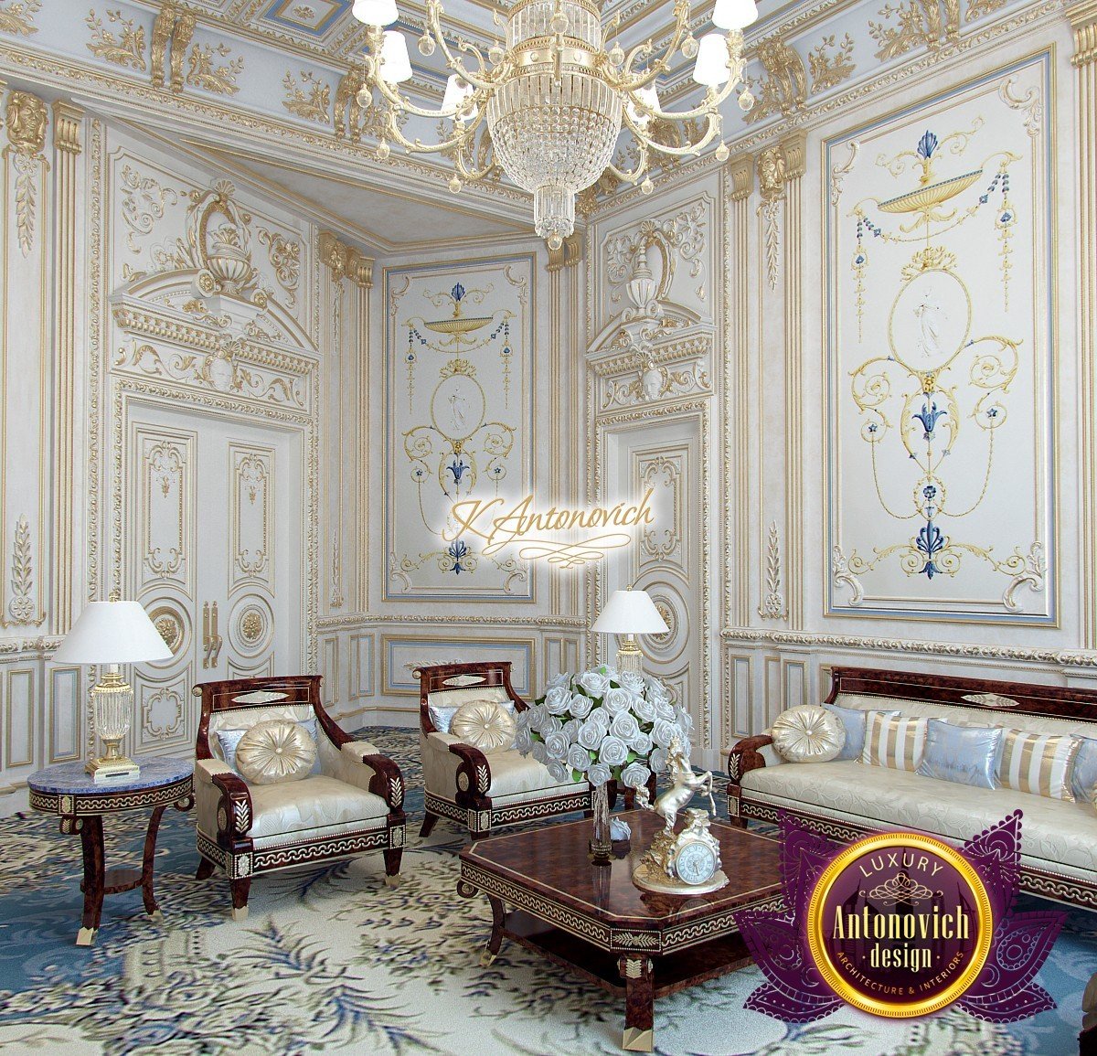 Этот проект — дизайн гостиной в бежевых тонах с акцентами золота и лиловыми нюансами. На стенах много резных деталей; такие идеи оформления гостиной с резьбой придают интерьеру торжественный характер. Мы работаем над дизайном просторной дворцовой гостиной, чтобы каждая деталь — от света до ткани — соответствовала общей эстетике.