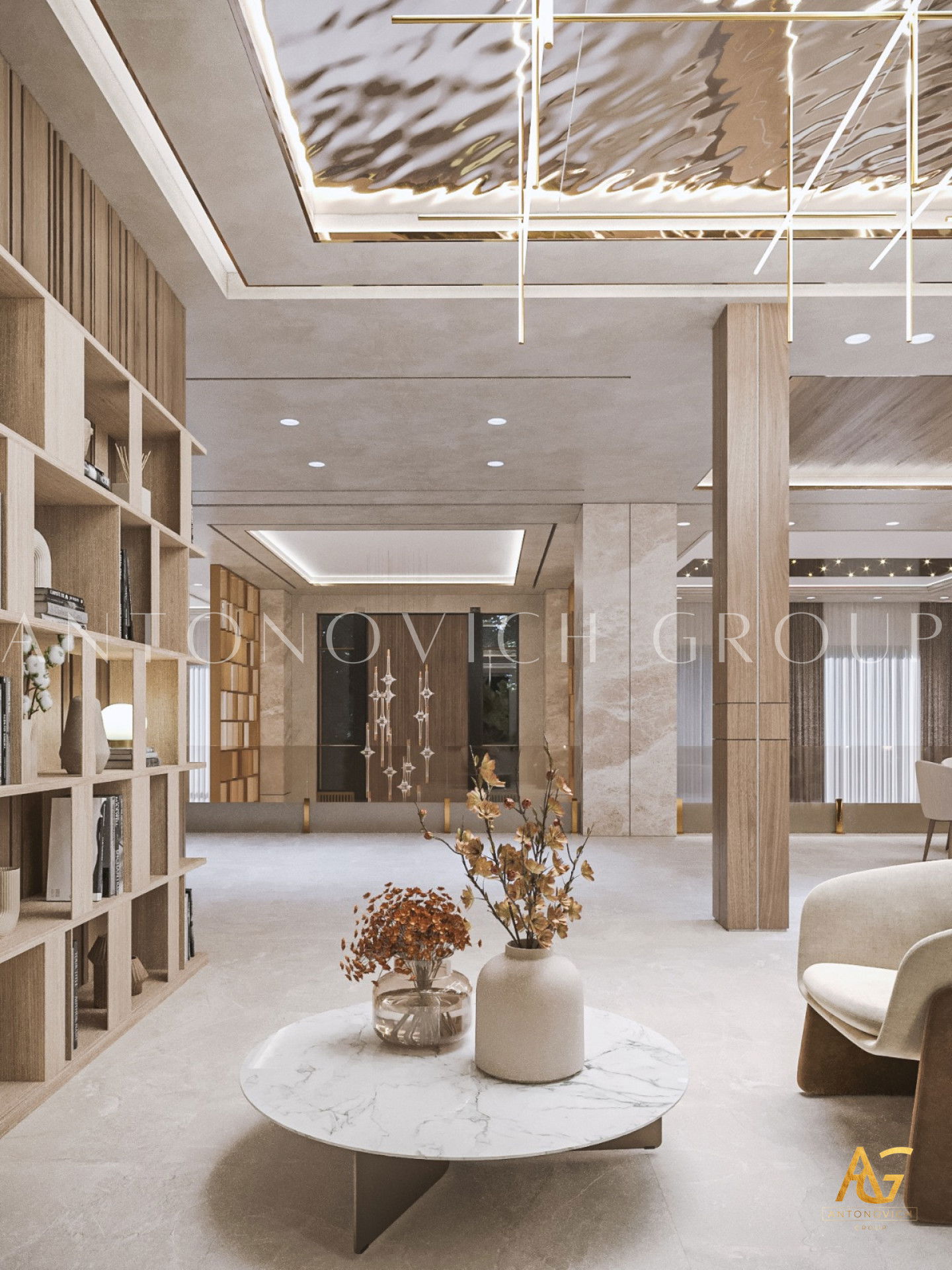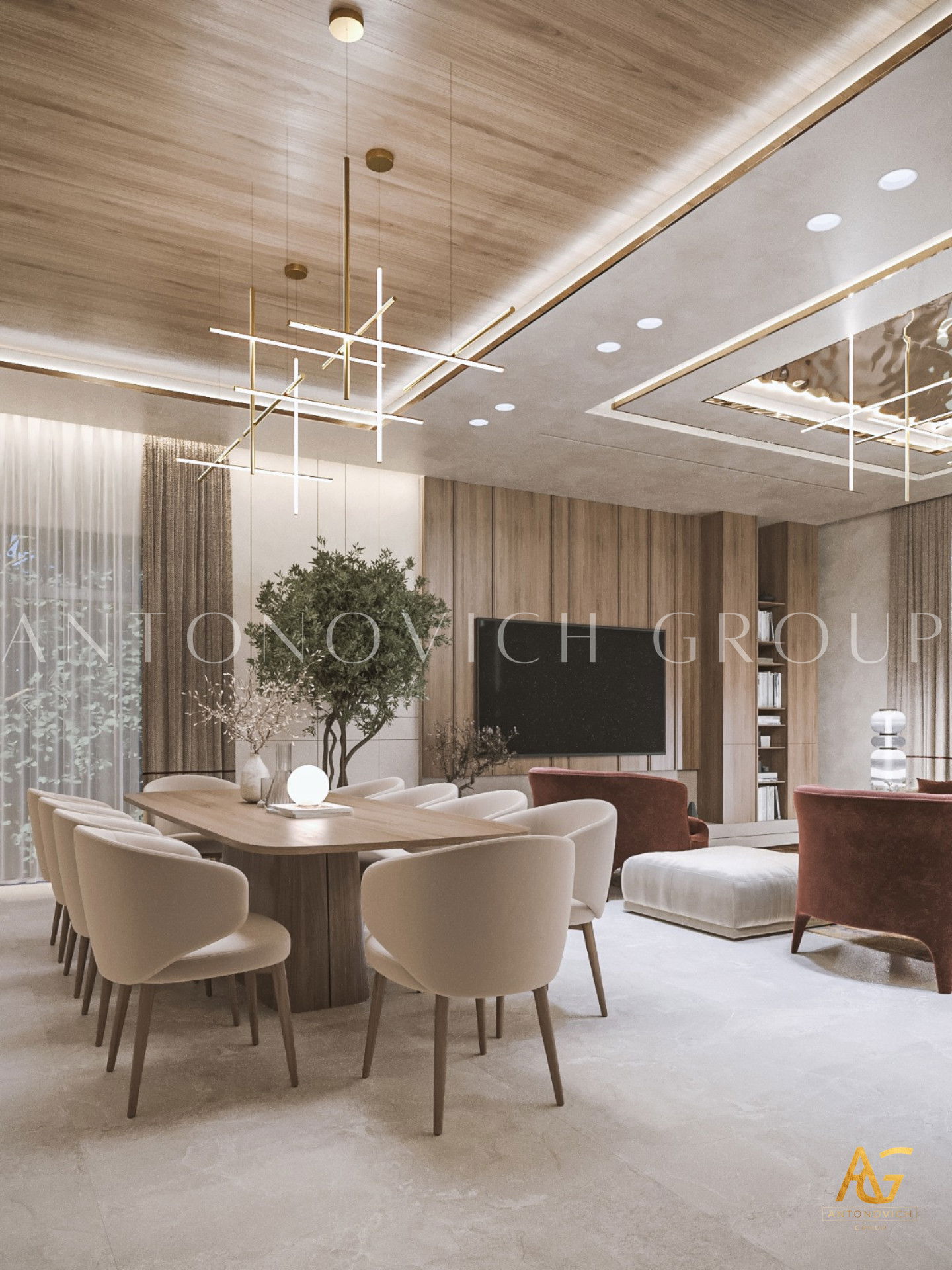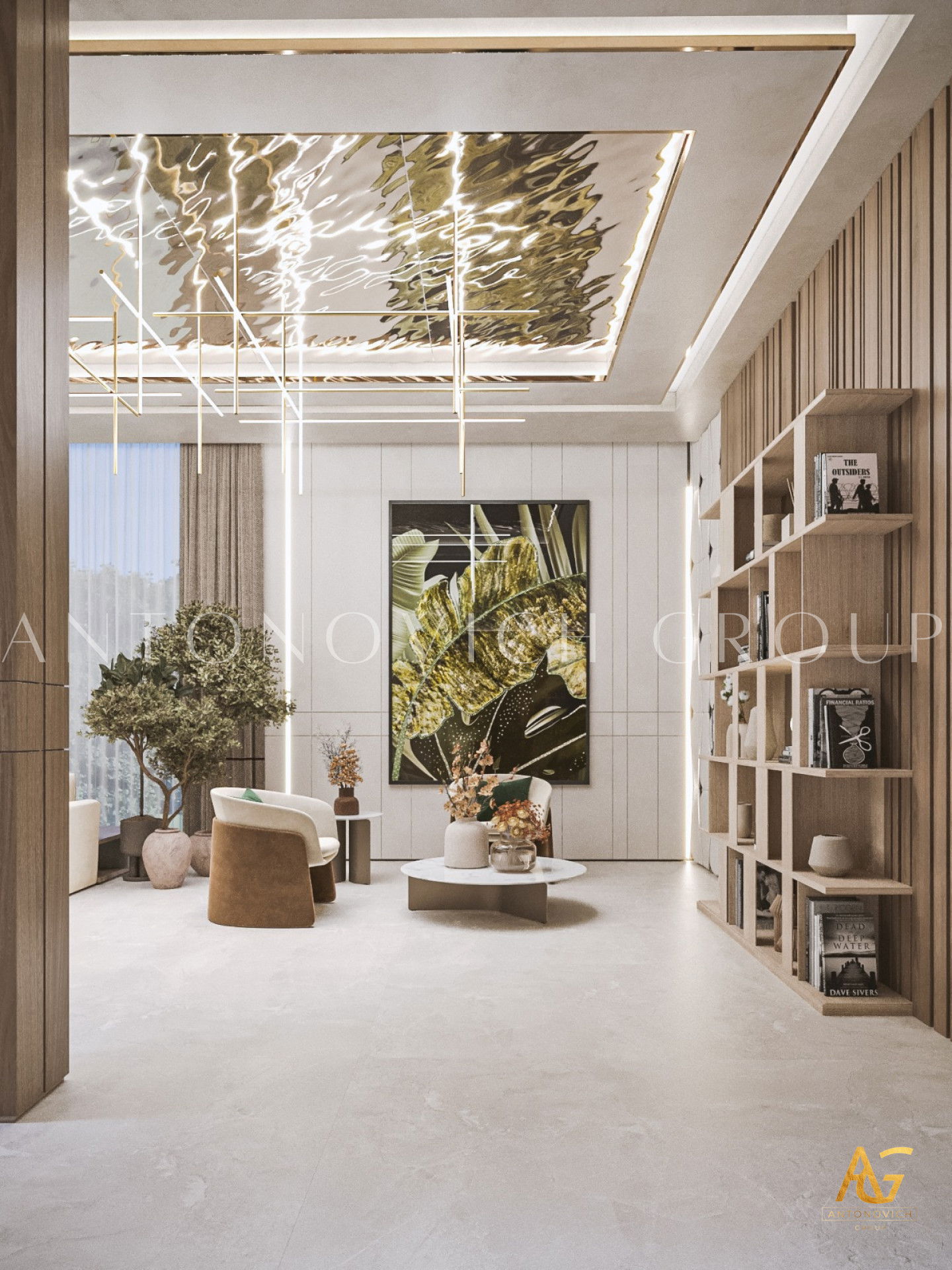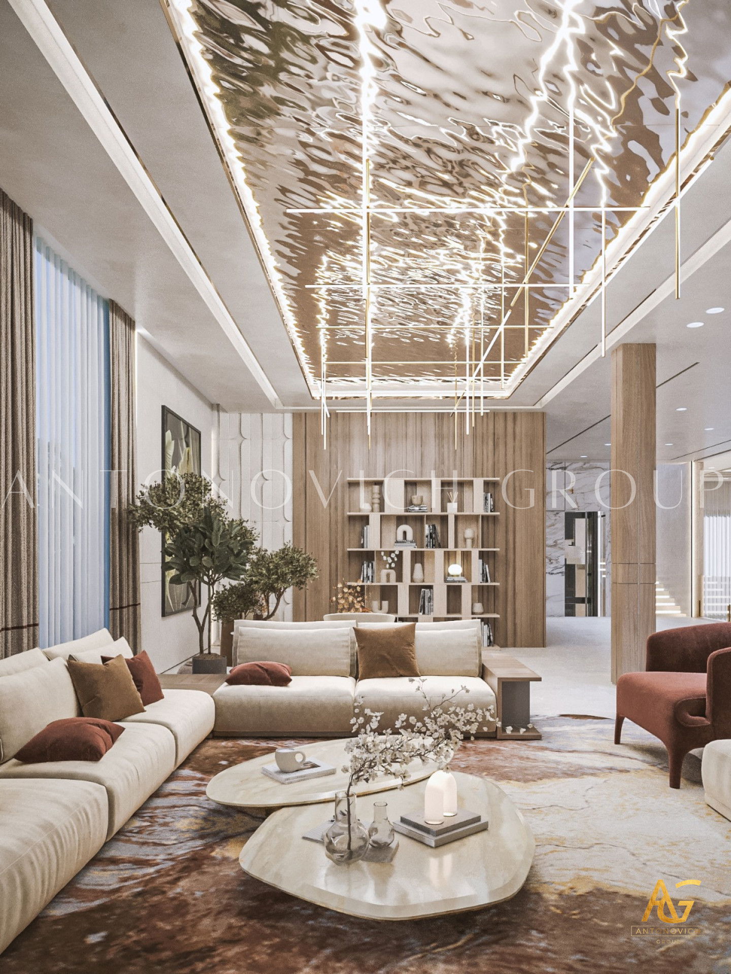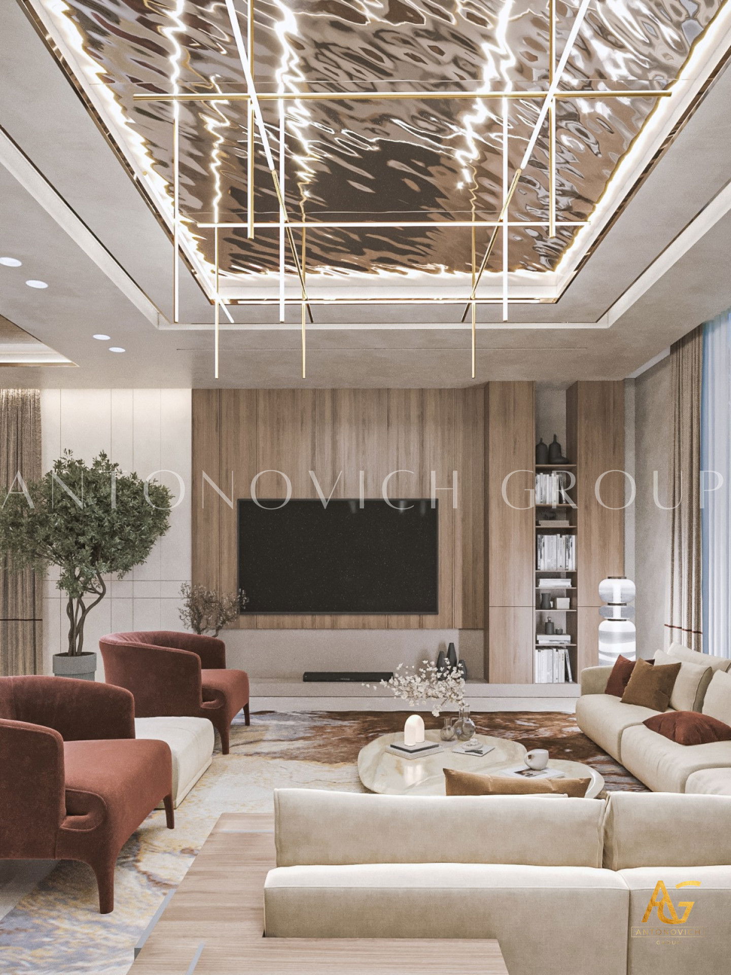 В целом интерьер воплощает торжество классики — классический дизайн гостиной, к которому дизайнеры добавили тёплые и романтичные штрихи. Это особенно заметно в разнообразии розовых оттенков: интерьер гостиной в пастельных тонах подчёркивает мягкость образа. Лепной декор с позолотой присутствует в оформлении стен и потолков — это яркий пример дизайн гостиной с лепниной. Эти элементы создают роскошный дизайн гостиной и подчёркивают благородный характер пространства.