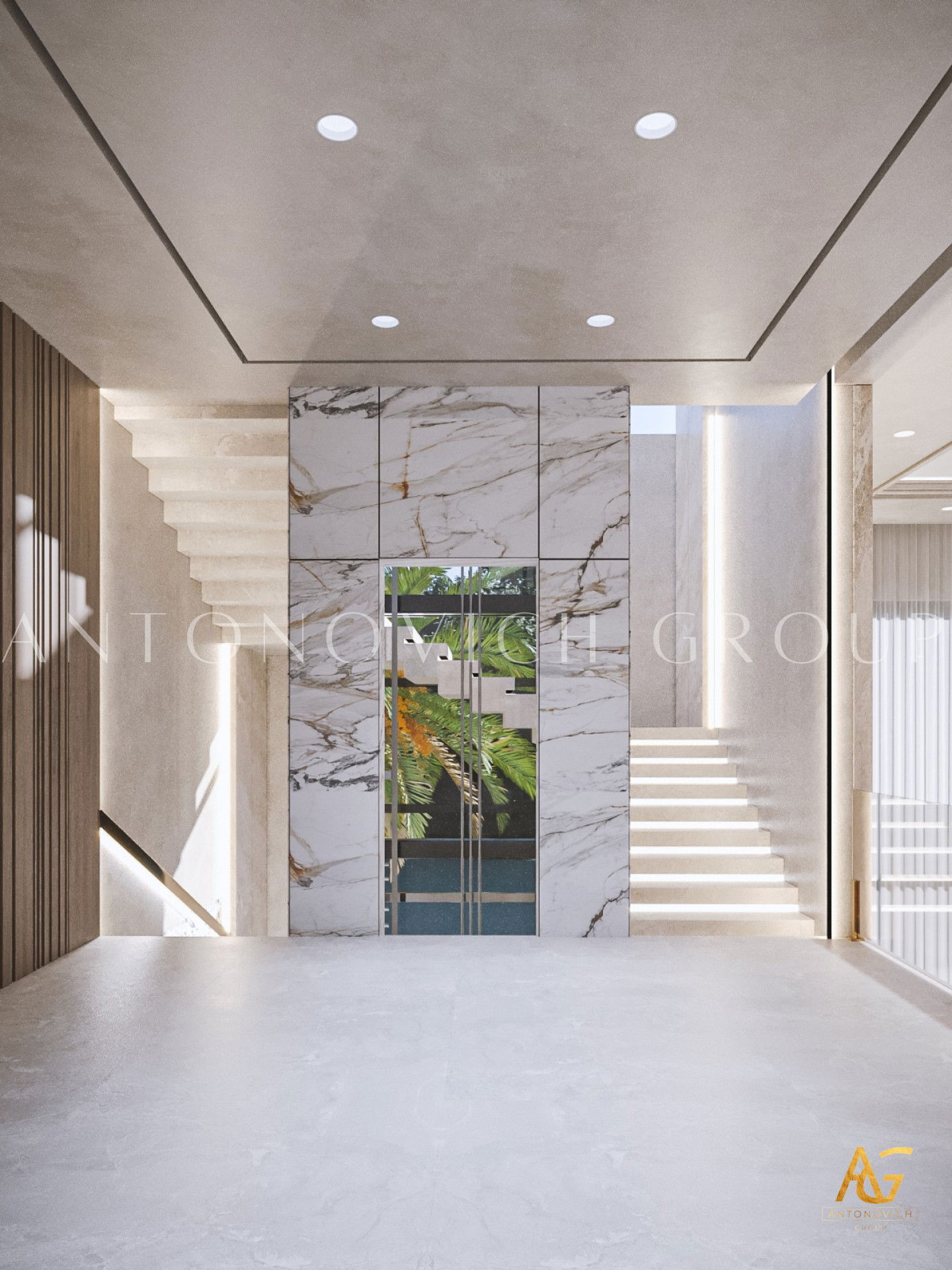 В проекте интерьер просторной гостиной подчёркнут большими окнами, обрамлёнными элегантными пилястрами с лепными капителями. За ними развешаны роскошные натуральные шелковые шторы классические в лаконичном, классическом исполнении. Настоящий мраморный пол в гостиной с резным узором воспринимается как произведение дизайнерского искусства. В проекте итальянская мебель в интерьере украшена изящной инкрустацией, дорогой обивкой и позолотой.