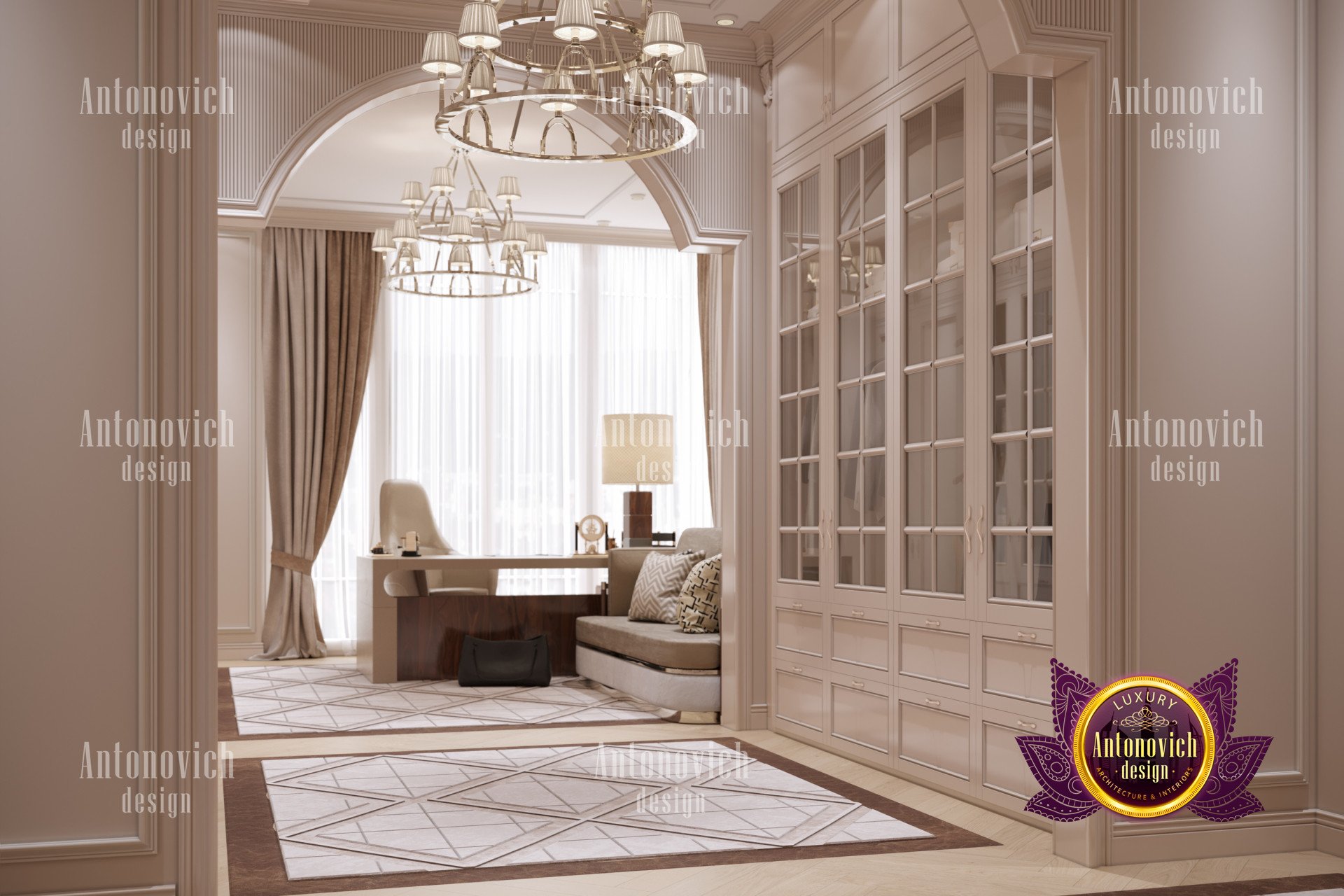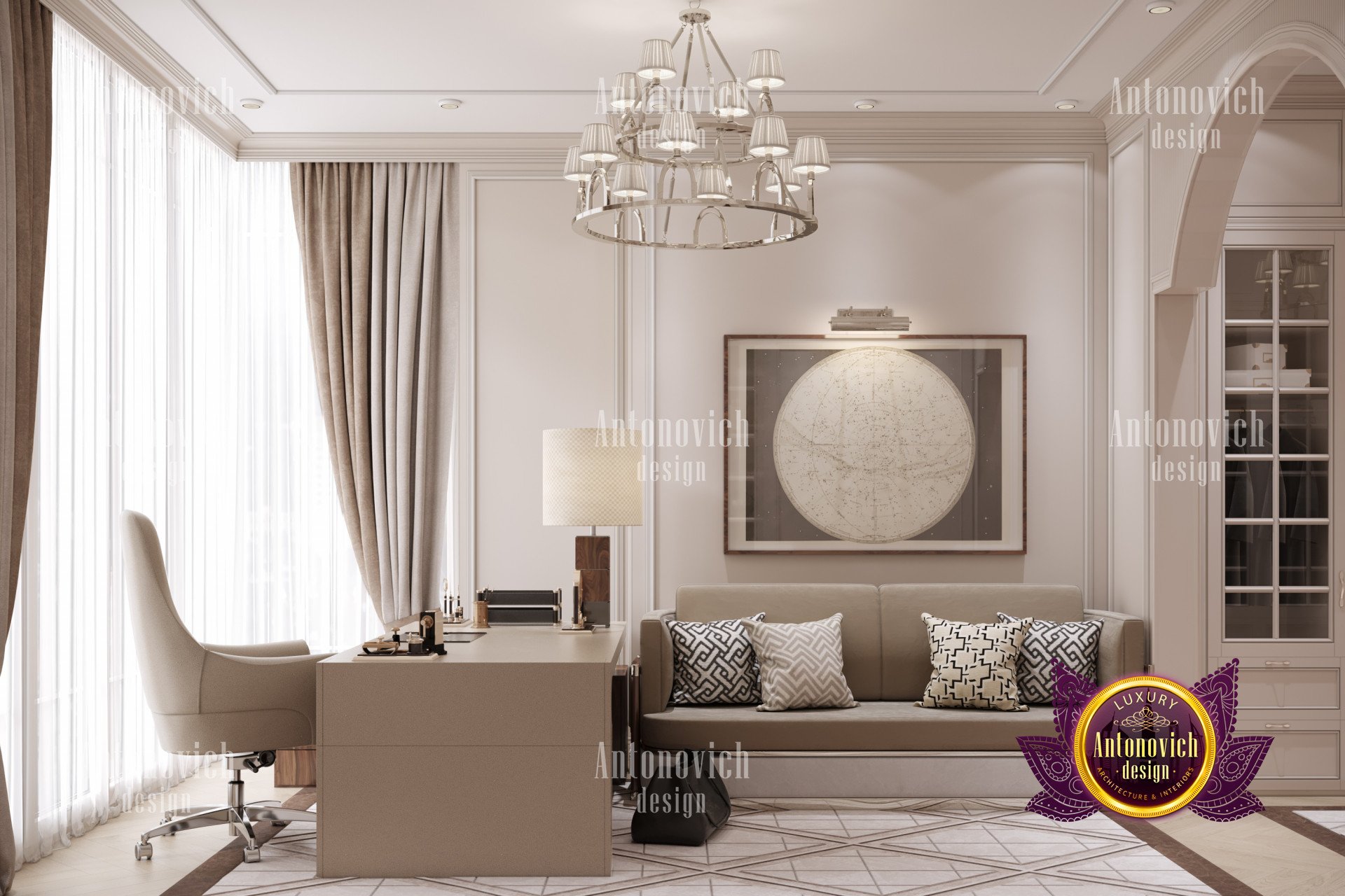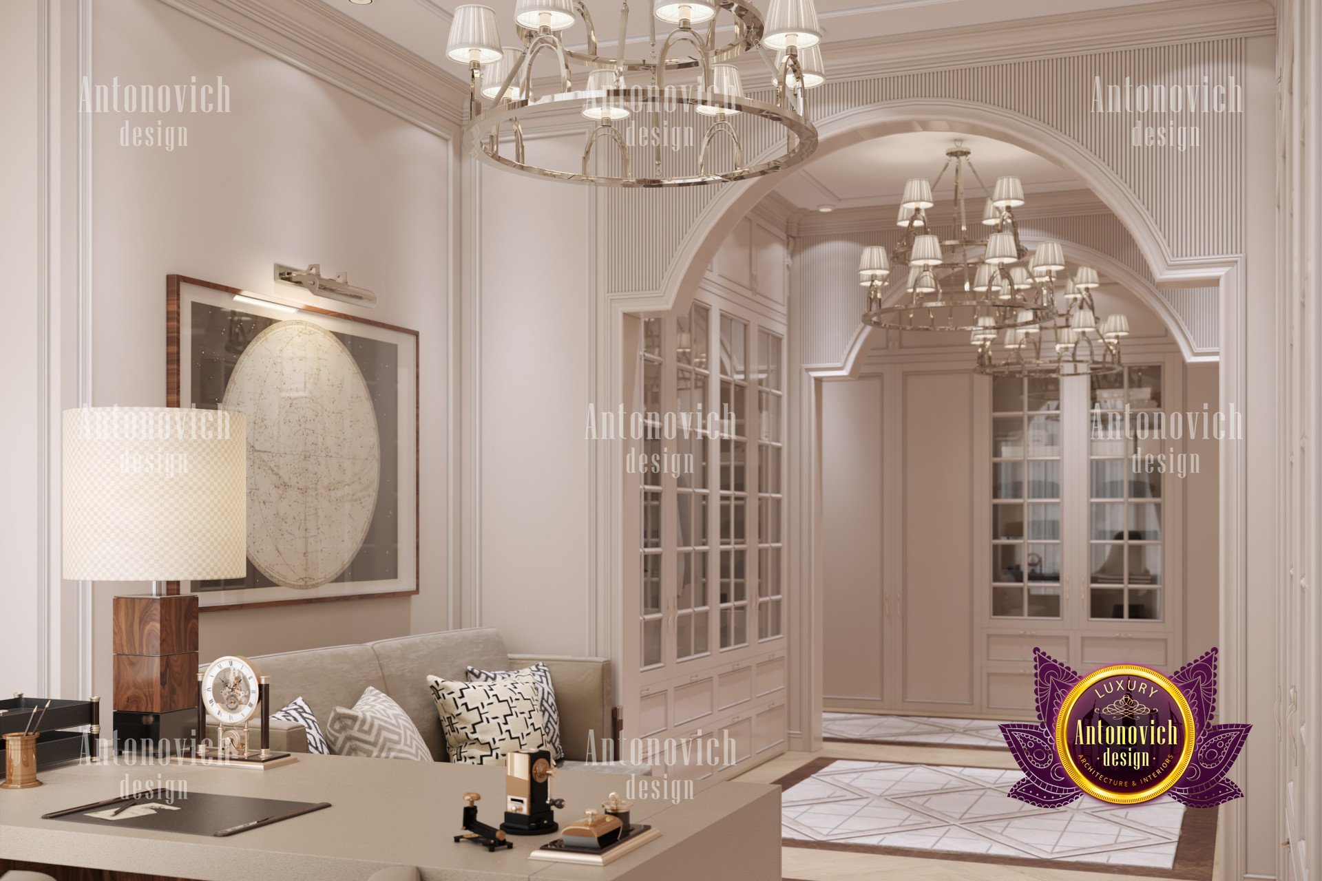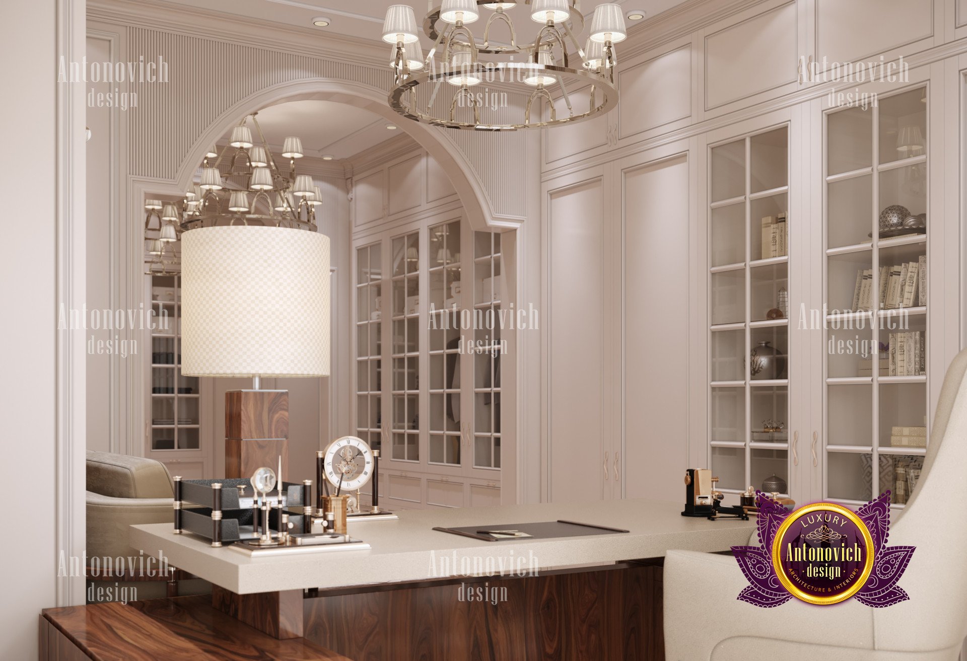 В интерьере использованы роскошные мебельные решения: письменный стол, офисное кресло и диван выдержаны в единой стилистике, создавая гармоничный образ. Это мебель для домашнего кабинета премиум-класса, а продуманная компоновка обеспечивает эргономичный домашний кабинет. Атмосфера не скучна — палитра подобрана для продуктивности, и элементы освещения подчёркивают стиль. Также продумано освещение домашнего кабинета люкс; впечатляющие люстры подойдут как мужчине, так и женщине.