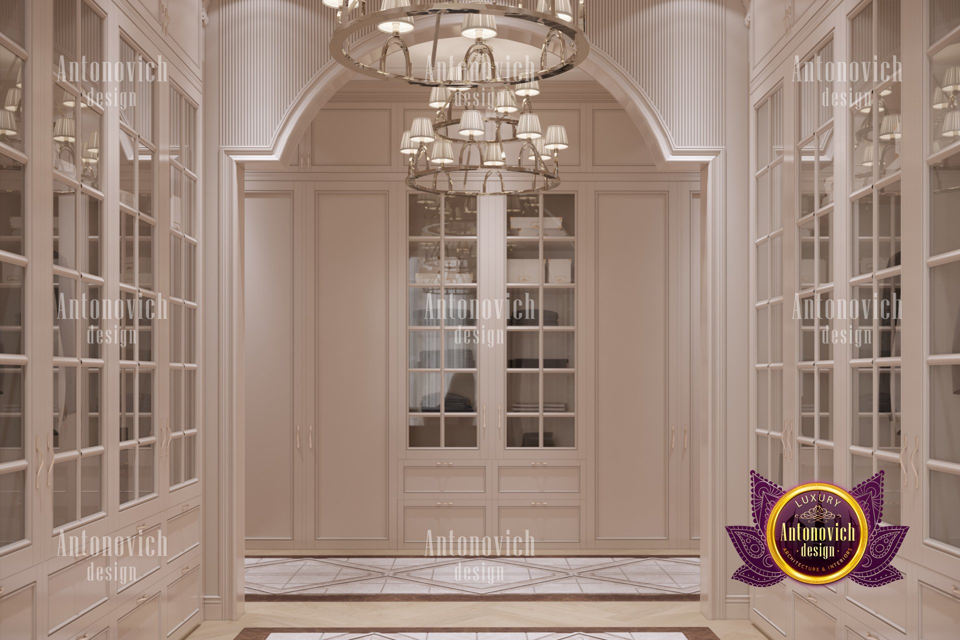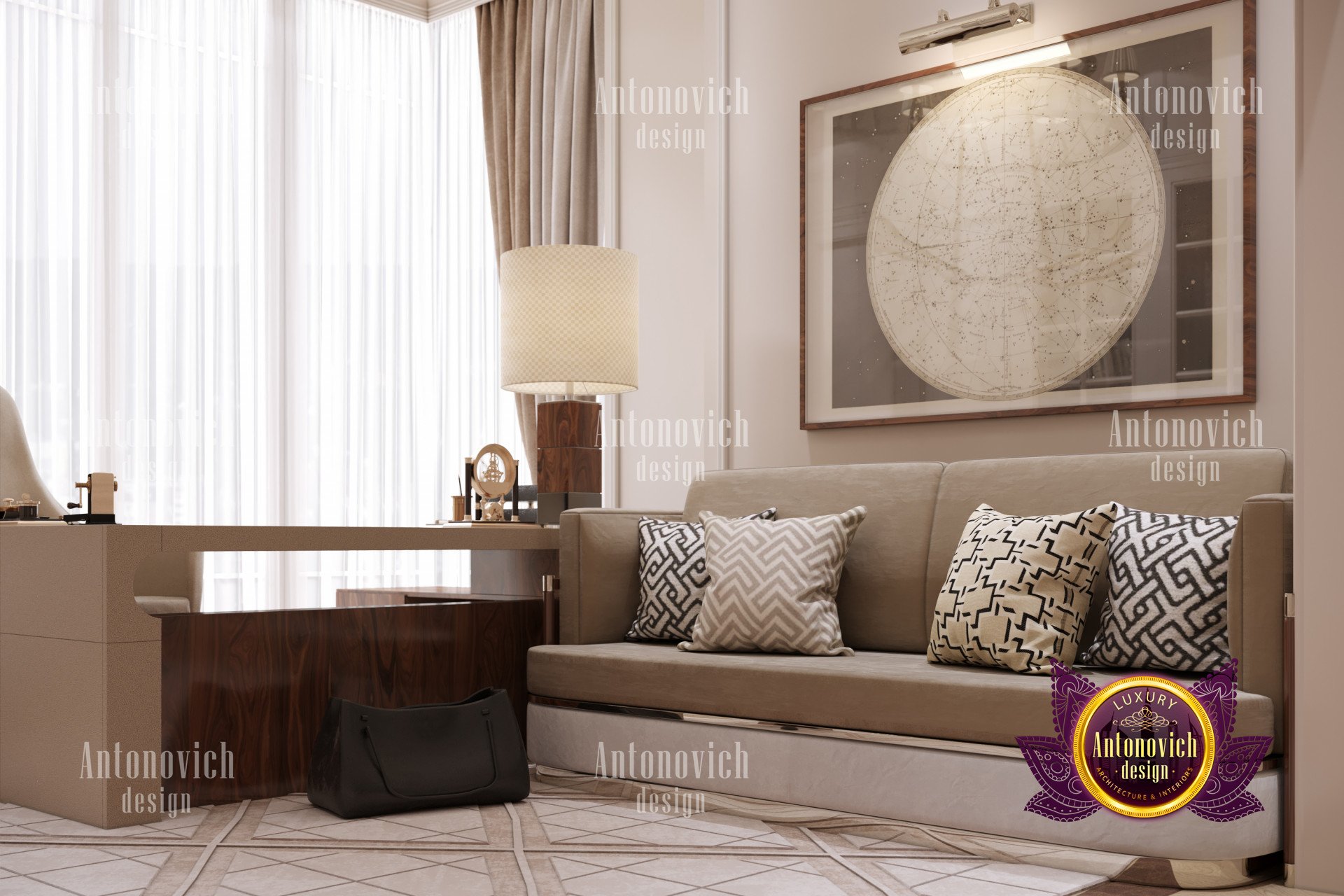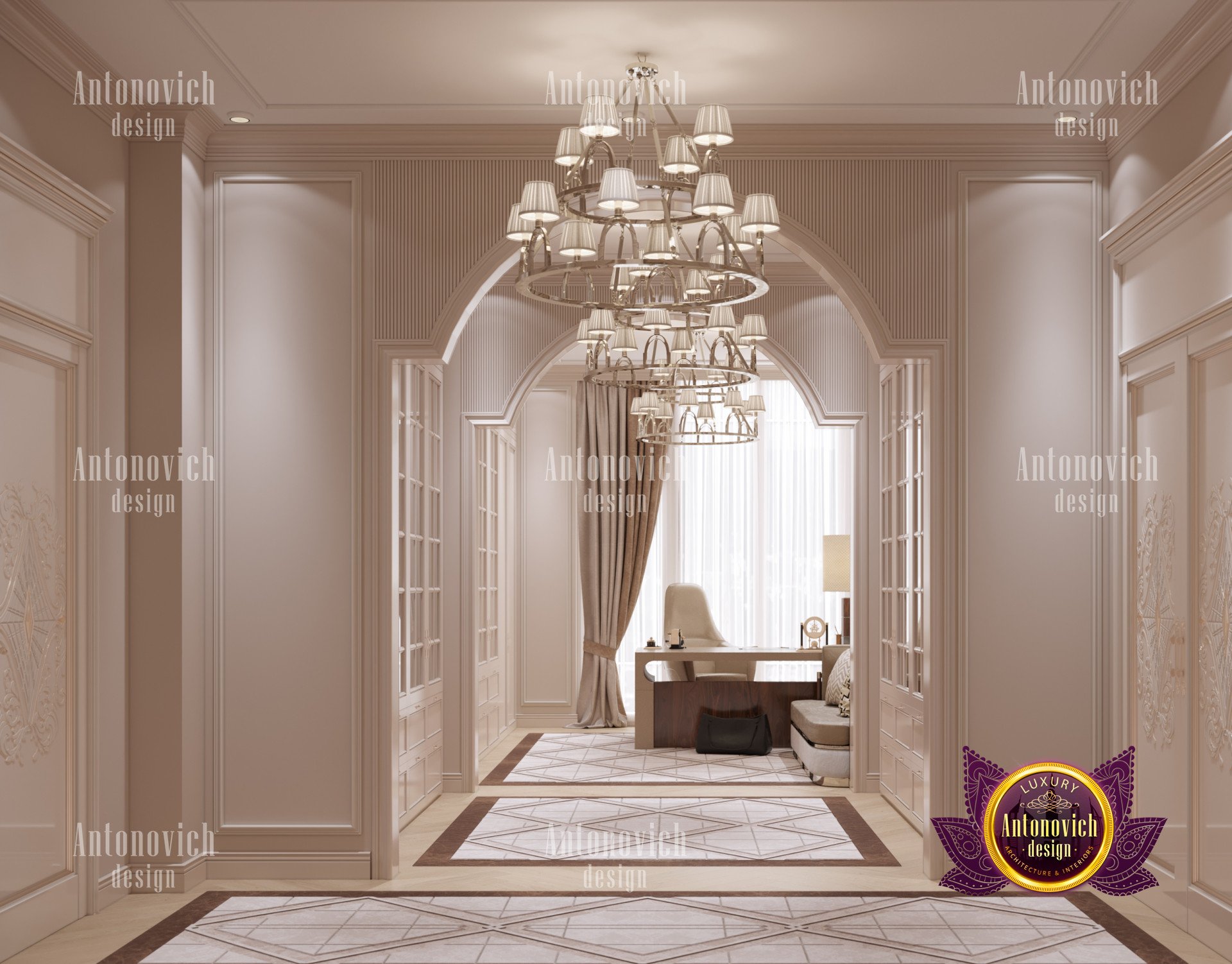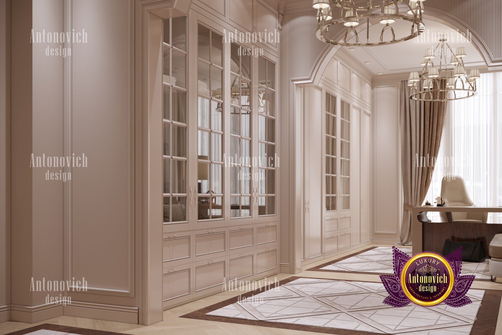 В интерьере использованы роскошные мебельные решения: письменный стол, офисное кресло и диван выдержаны в единой стилистике, создавая гармоничный образ. Это мебель для домашнего кабинета премиум-класса, а продуманная компоновка обеспечивает эргономичный домашний кабинет. Атмосфера не скучна — палитра подобрана для продуктивности, и элементы освещения подчёркивают стиль. Также продумано освещение домашнего кабинета люкс; впечатляющие люстры подойдут как мужчине, так и женщине.
