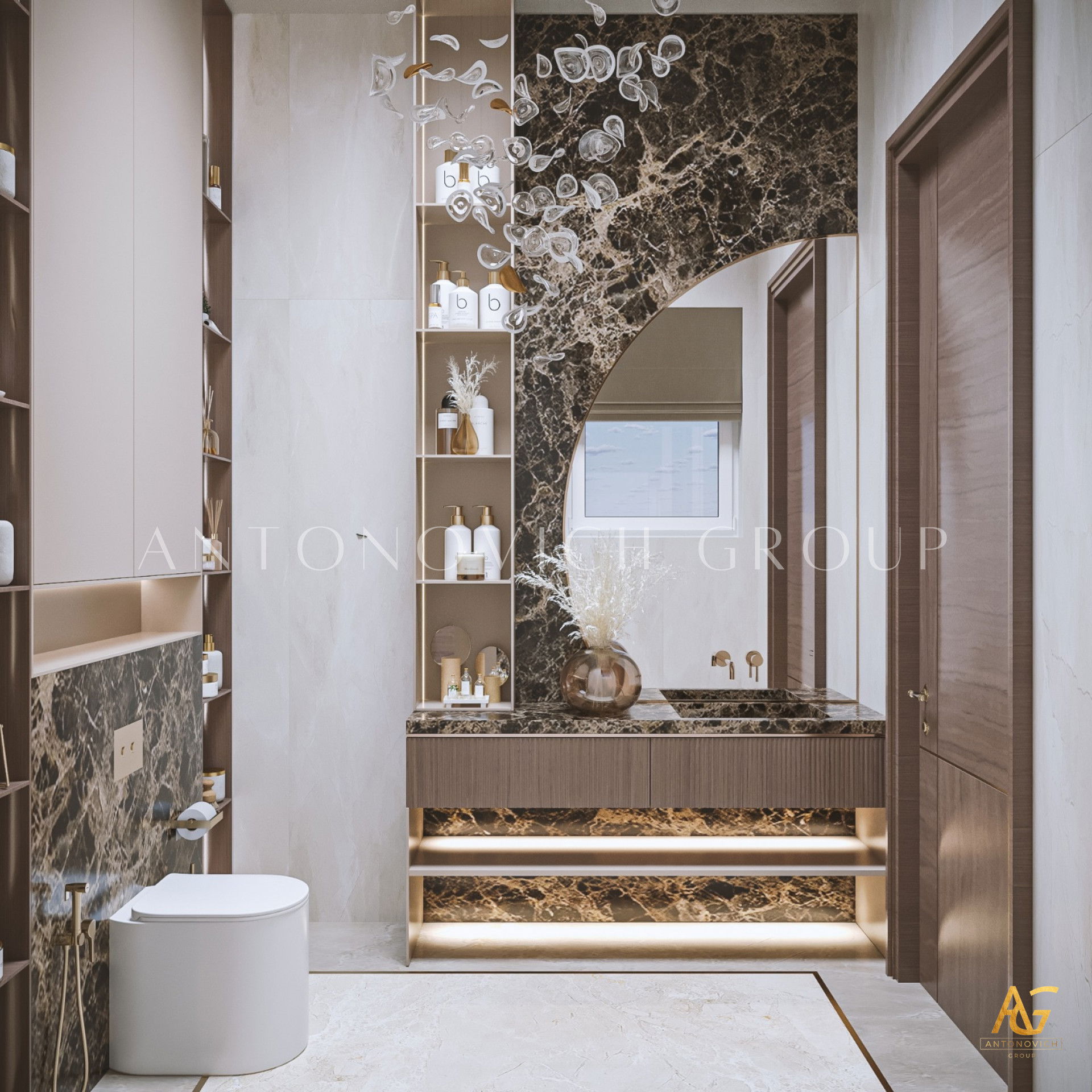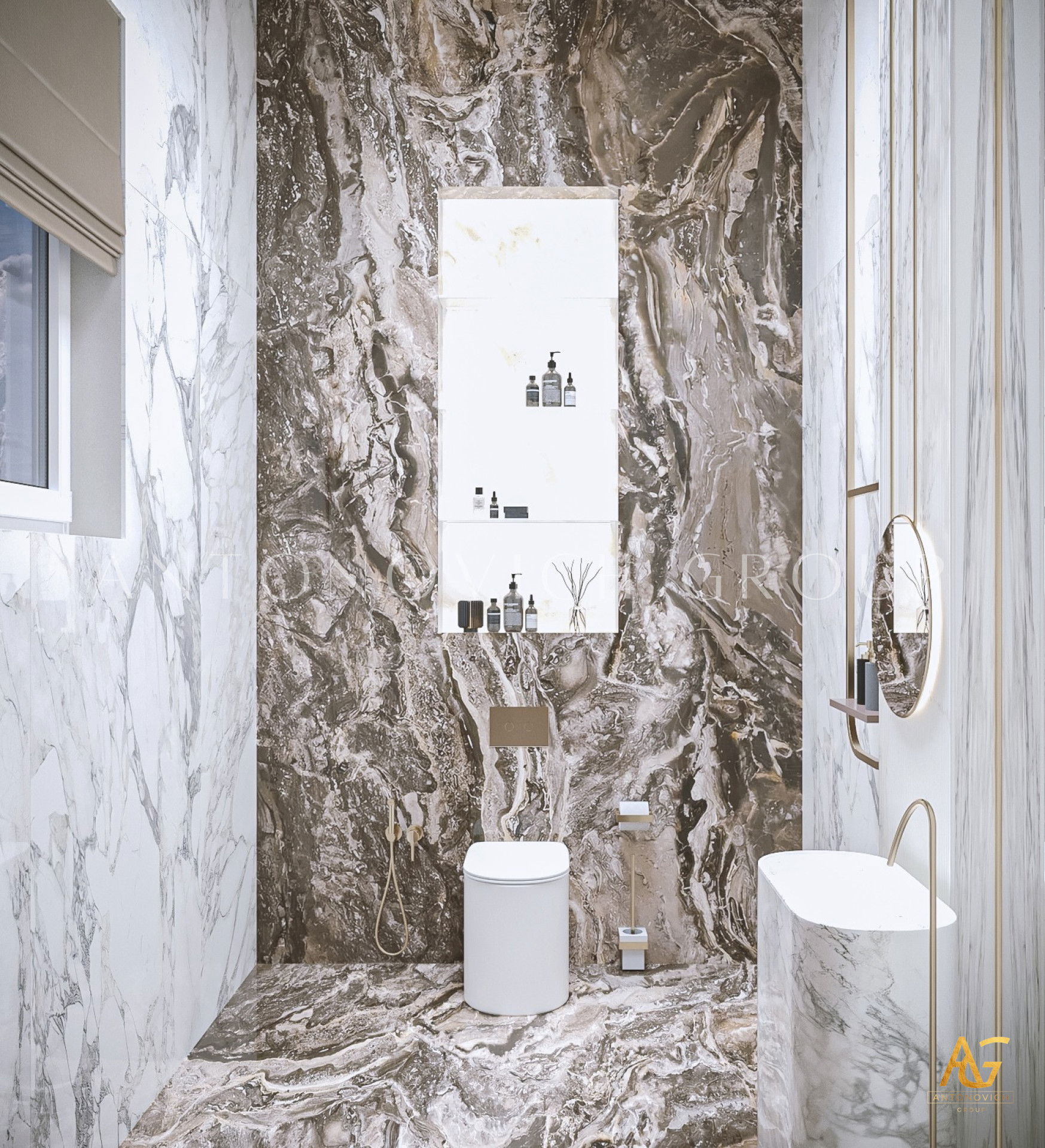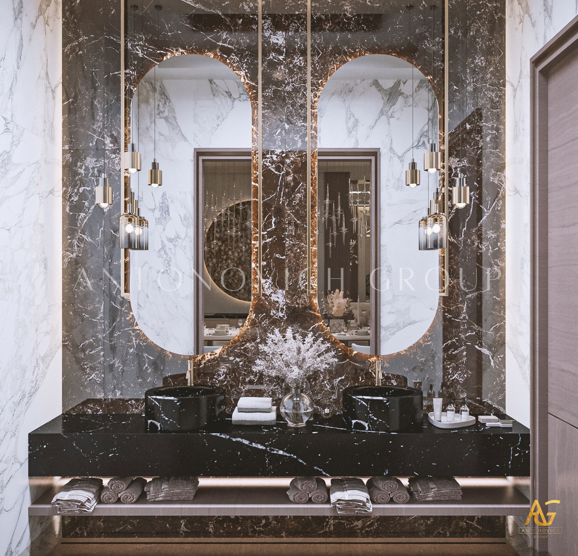 Ванные комнаты рассматриваются как частные спа в пределах виллы. Использование мрамора, оникса и современных аксессуаров создает атмосферу наслаждения. Индивидуальные туалетные столики, дизайнерские зеркала и решения освещения добавляют чувство утонченности.