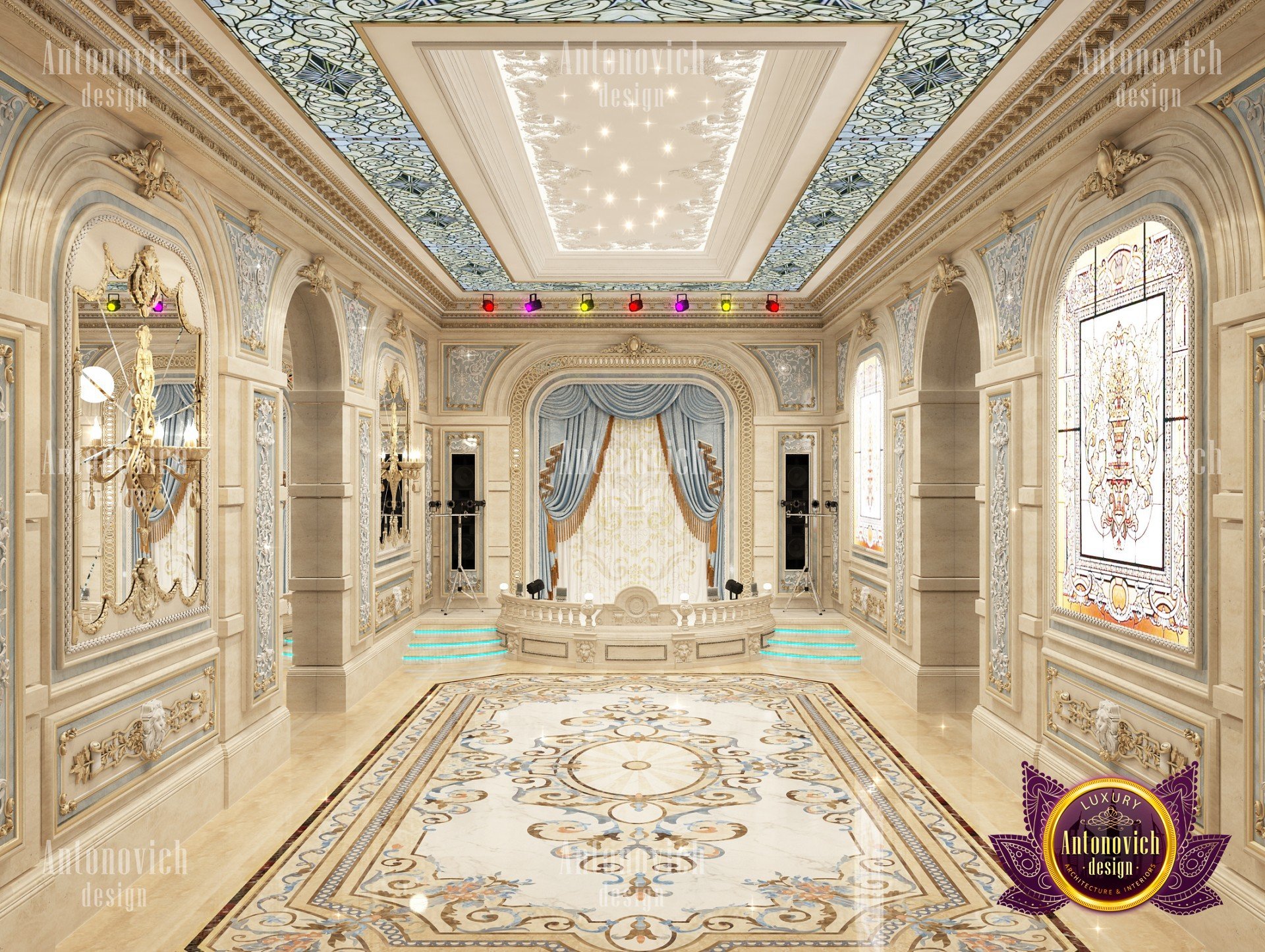 Лепнина и витражи на потолке расположены прямо над центральной композицией узоров на полу, а сама потолочная композиция украшена изящными светильниками. Потолок обрамлён великолепной лепниной и витражными вставками — это делает его визуально лёгким и невесомым. Для каждого проекта инженеры и архитекторы прорабатывают все детали, чтобы жизнь в доме была комфортной и абсолютно безопасной.