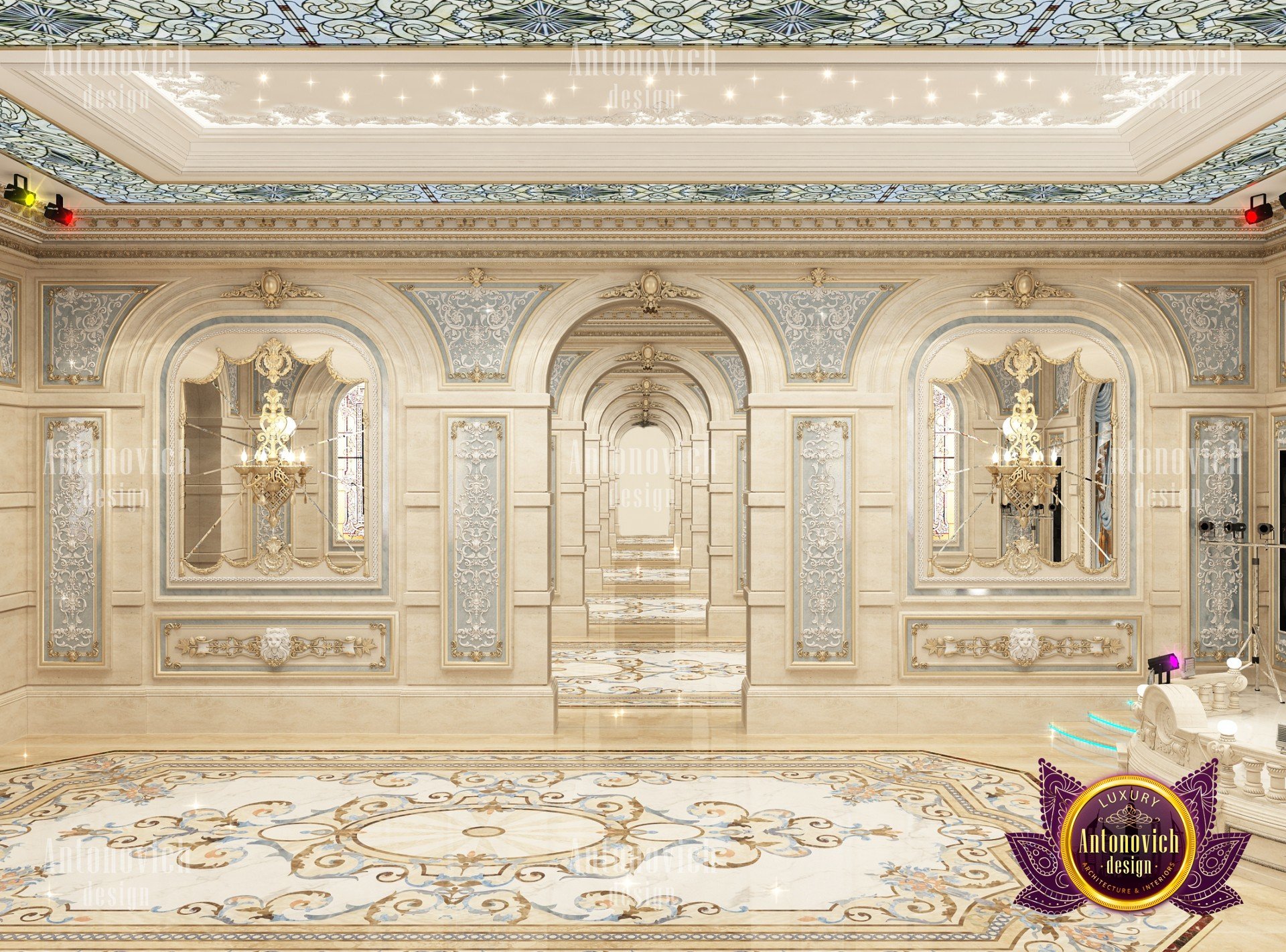 Дизайн прихожей создаётся с учётом мельчайших деталей, чтобы все проектные решения реализовывались безупречно уже на первых этапах работы. Интерьер холла идеально подчёркивает архитектурные особенности здания и формирует верное первое впечатление и торжественную атмосферу. Пол из белого итальянского мрамора с резными узорами подчёркивает статусность пространства. Авторская мебель и семейный логотип предусмотрены в проекте как способ сохранить историю семьи и подчеркнуть индивидуальность. Замысловатые завитки узоров на мраморе придают интерьеру очарование королевского дворца.