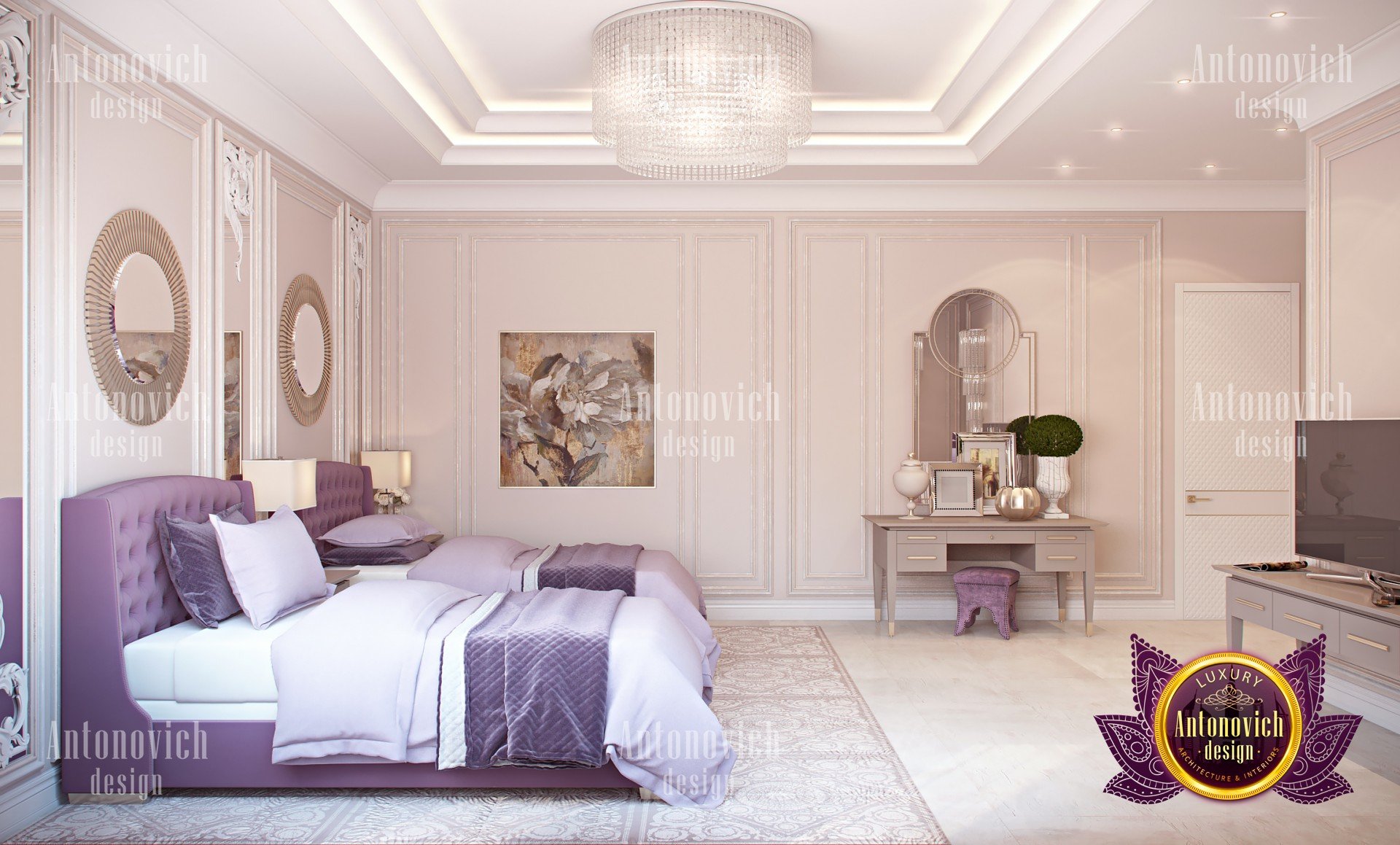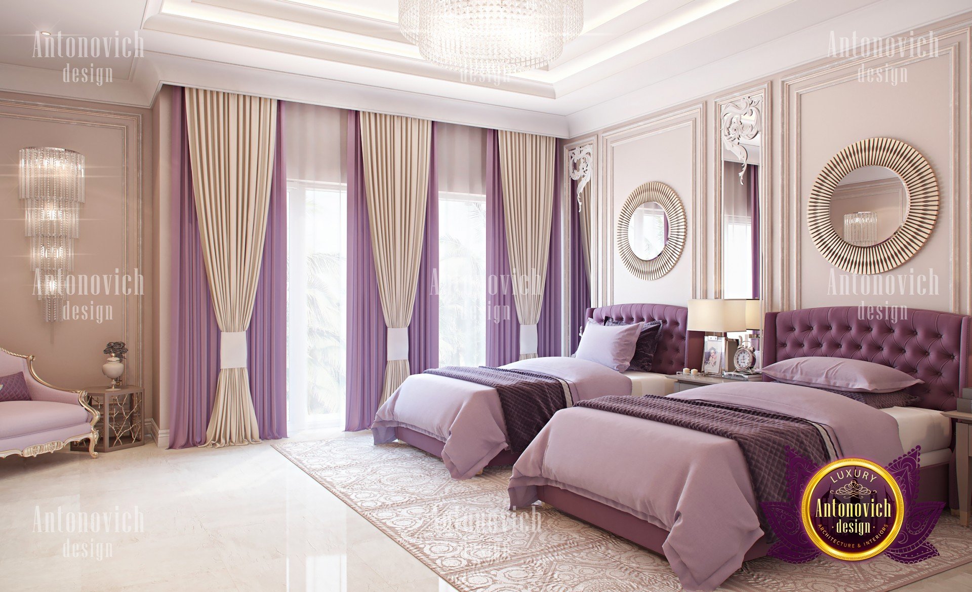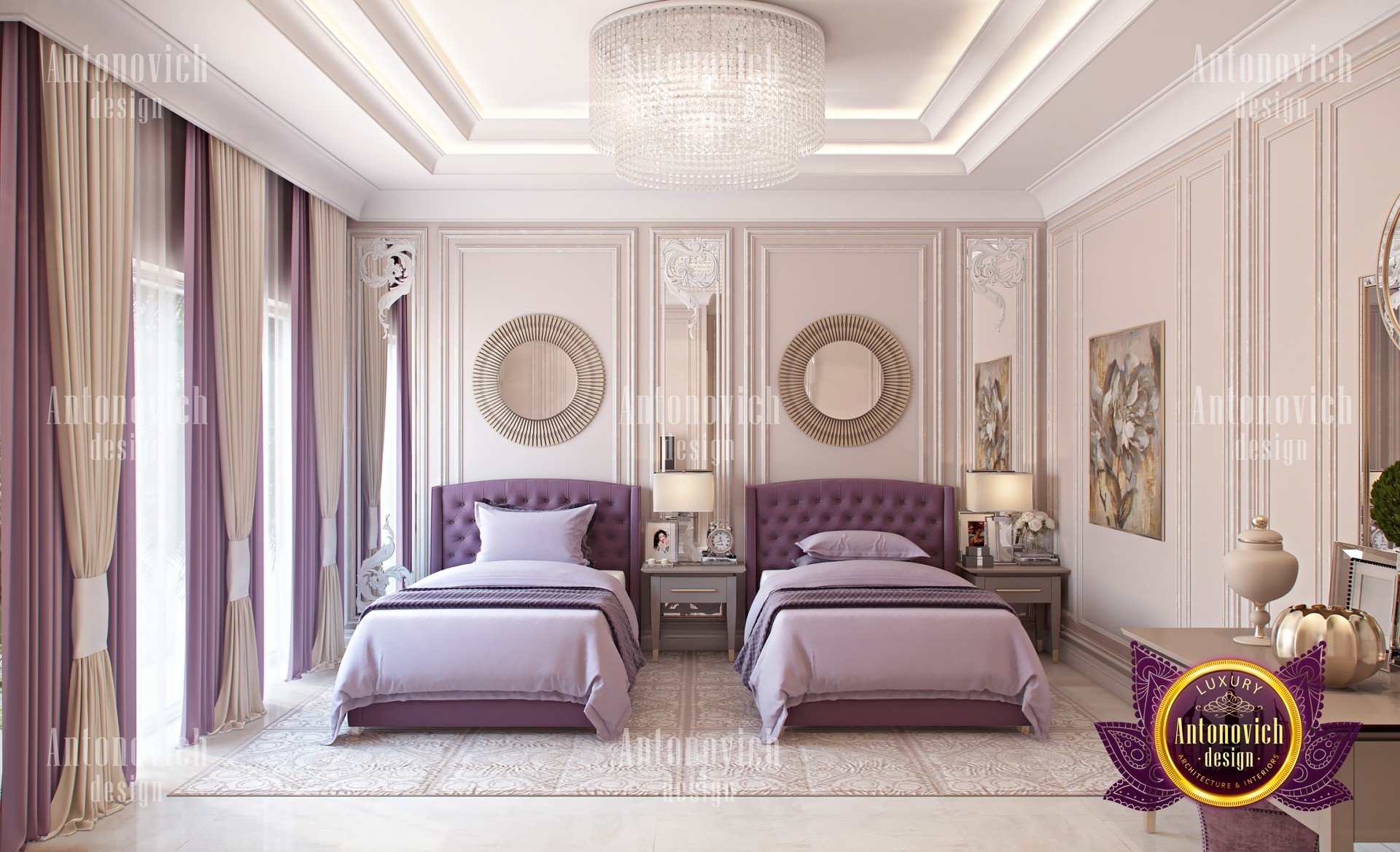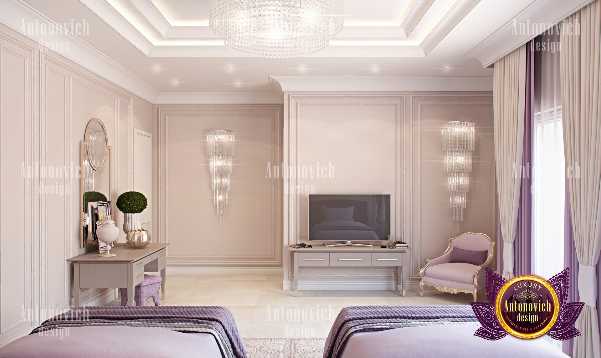 В проекте эксклюзивный дизайн гостевой спальни мы от Антонович Дизайн (Antonovich Design) выбрали сочетание бежевого (близкого к молочному шоколаду), светло‑коричневого и пурпурных акцентов. Эта палитра бежевого и коричневого прослеживается в шторах, постельном белье из натуральных тканей и мебели — кроватях с мягкими изголовьями, классических креслах с лёгким золотым акцентом и декоративных предметах: в оформлении зеркал и туалетного столика. Цвета не раздражают глаз и способствуют спокойствию; в таком оформлении уютный интерьер гостевой спальни воспринимается гармоничным и изящным.