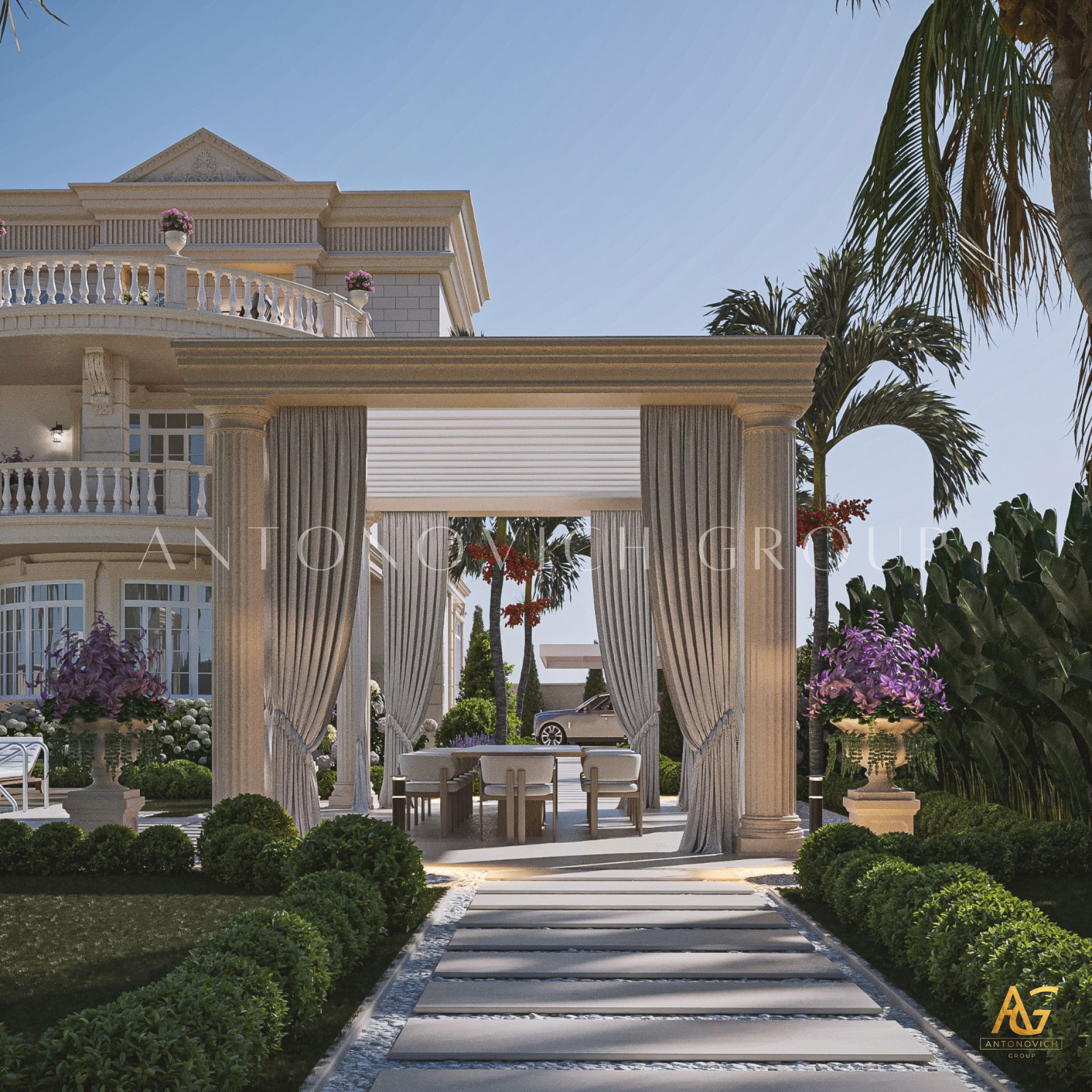 Как ведущая компания в области архитектуры и дизайна интерьера в ОАЭ, при создании экстерьерного дизайна мы всегда учитываем материалы с учётом климата. ОАЭ расположен в сердце пустыни и характеризуется двумя ярко выраженными сезонами — суровой зимой и жарким летом. В то же время города активно развивались, и сегодня в них представлены современные архитектурные решения. Luxury Антонович Дизайн (Antonovich Design) сохраняет уважение к местной культуре, внедряя арабские мотивы в премиальные внешние решения.
