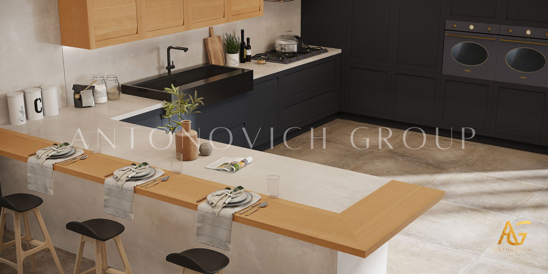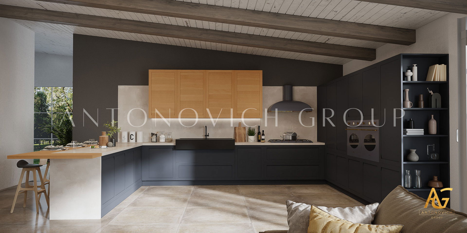 Дизайн кухни в Дубае дополнил оформление других помещений — шторы стали изящным акцентом интерьера, это премиум версия римских штор. Кухонный интерьер с римскими шторами подчёркивает статус помещения. Идеи кухонного интерьера от студии уникальны: кухонный интерьер премиум класса сочетает минимализм и выразительные детали. В итоге минималистичный премиум дизайн кухни делает пространство одновременно уютным и роскошным. Идеи дизайна кухни от Antonovich Group (Антонович Групп) всегда уникальны. Наша цель — сделать дизайн кухни не только комфортным и функциональным, но и максимально роскошным.