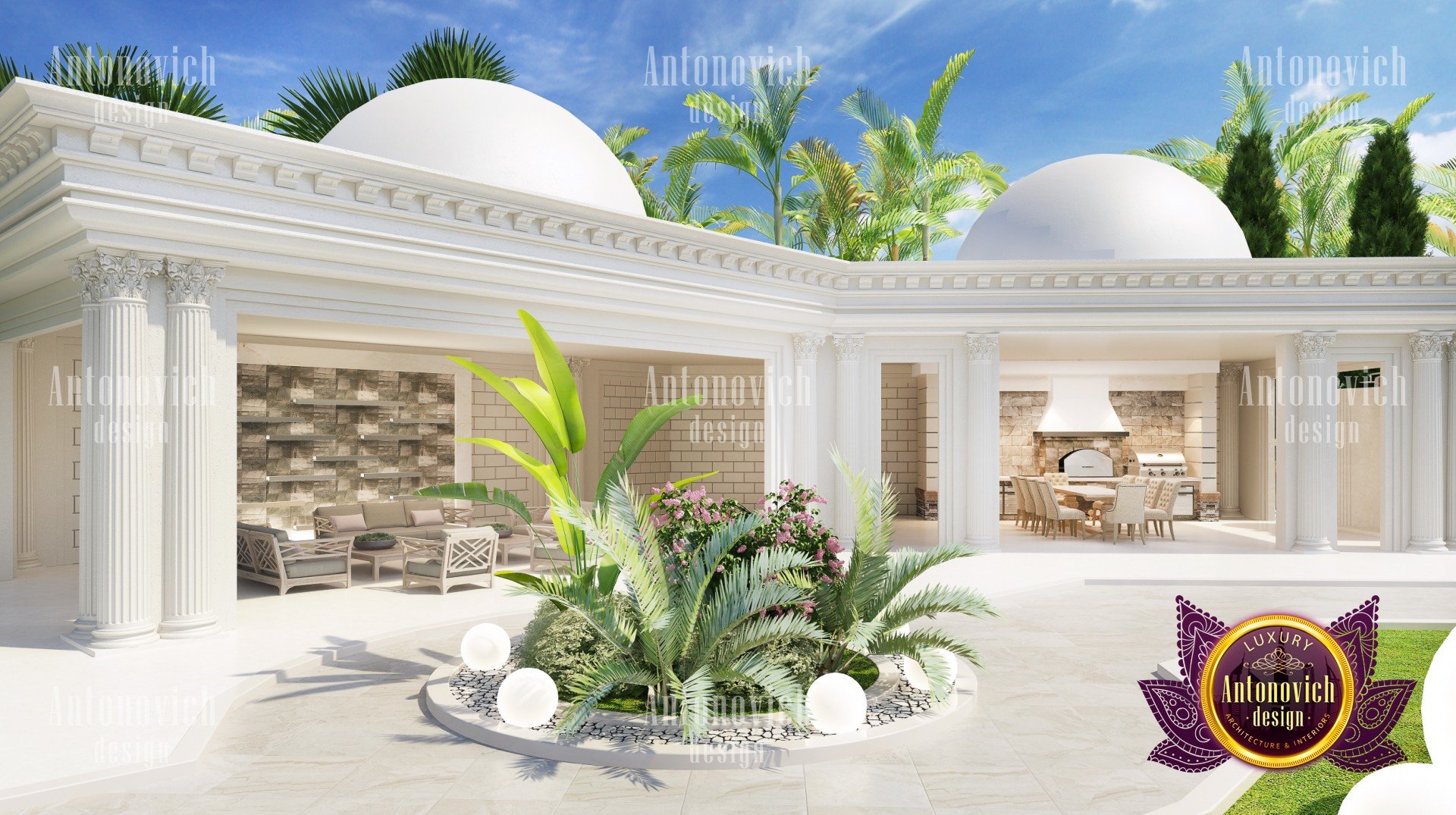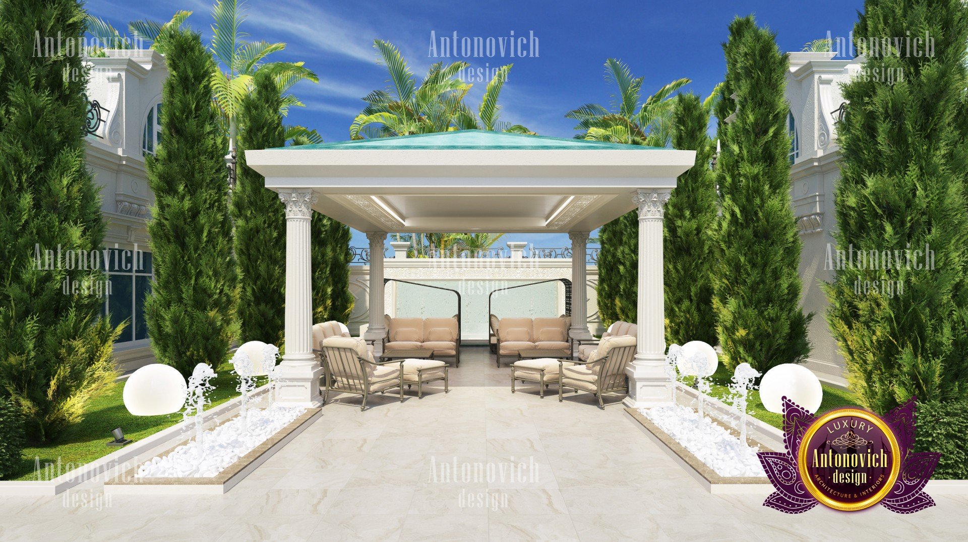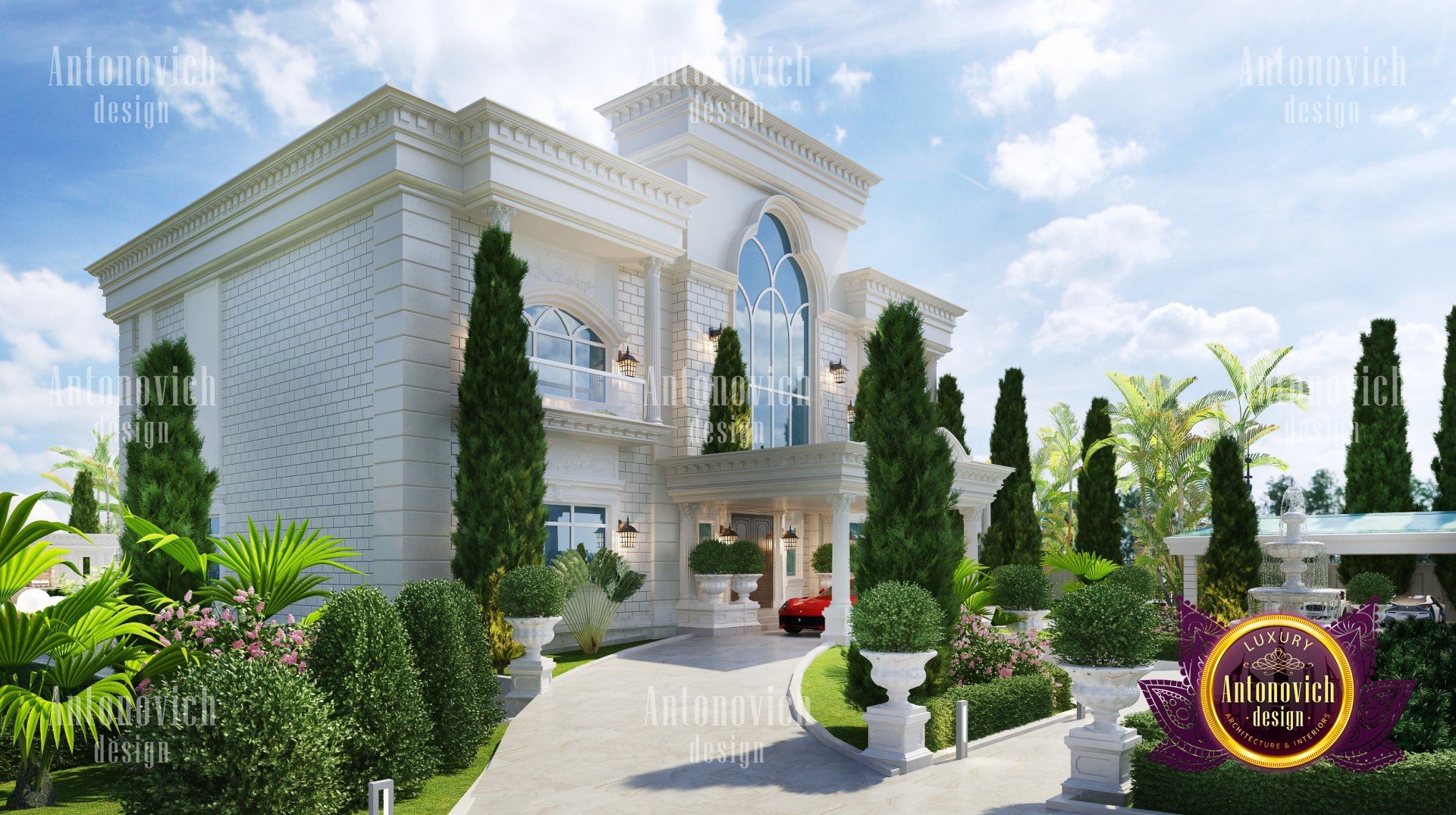 Фасад роскошной виллы вызывает эстетическое удовлетворение и гарантированно выделяет вас среди соседей. Великолепный облик этого дома, напоминающий замок, не менее роскошен и красив. Искусно сочетая цвета, текстуры, материалы, декоративные детали и приёмы освещения, архитекторы Антонович Дизайн (Antonovich Design) создали уникальную выразительность идеального дома. Внимательно спланированные и торжественные черты экстерьера подчёркивают статус проекта: продуманная наружная отделка фасада в Дубае служит как визуальным акцентом, так и практическим решением климатических задач. Входная группа с ландшафтом оформлена ценным тротуаром и композициями, которые приветствуют вас при подходе. Тёплый тон фасадного покрытия создаёт ощущение уюта, а общий образ соответствует концепции экстерьер виллы в современном классическом стиле. Тут органично представлены элементы, благодаря которым дизайн фасада роскошного дома выглядит гармонично и престижно, включая архитектурный декор фасада с резьбой, террасы и большие открытые пространства и продуманную функциональность. Проект жилья предлагает несколько наружных террас, просторные площади и решения для террас и больших открытых пространств, которые подчёркивают элитный фасад для особняка.