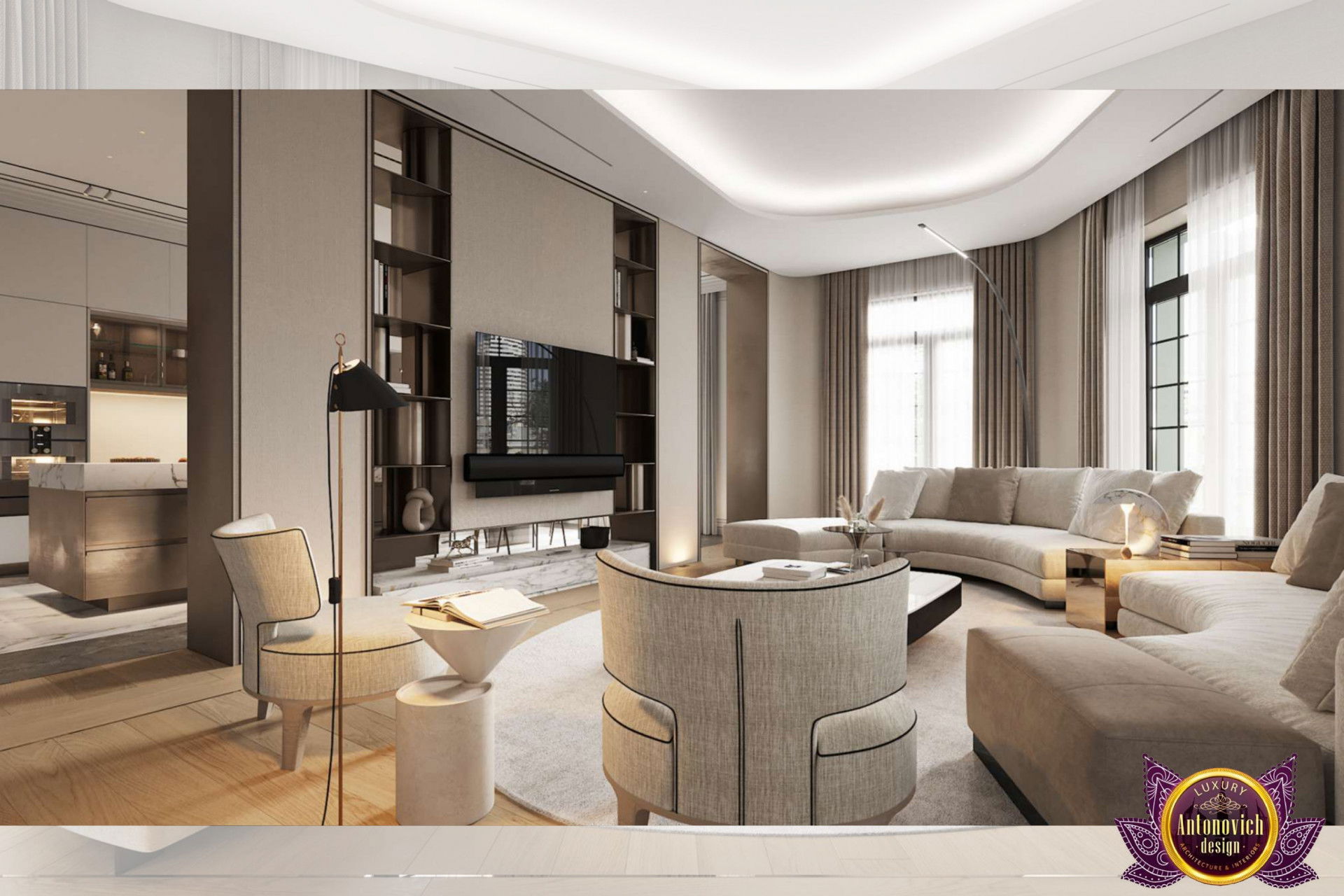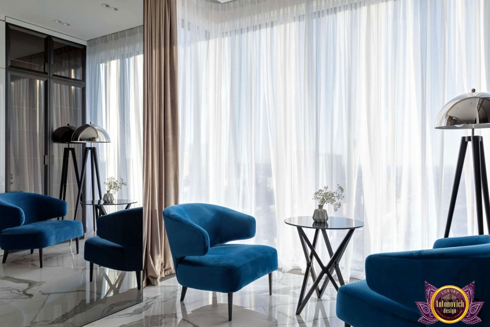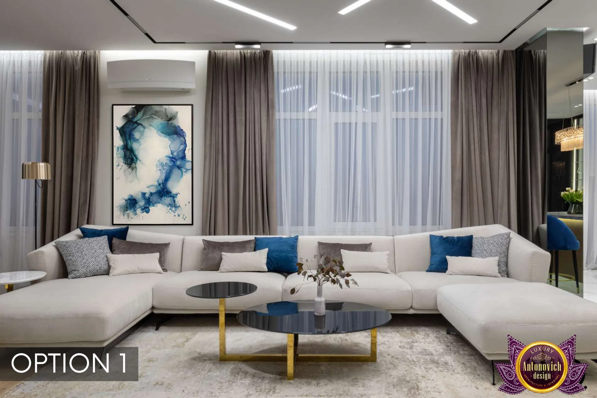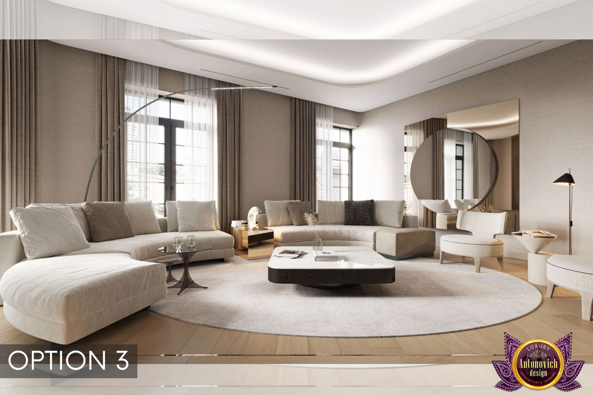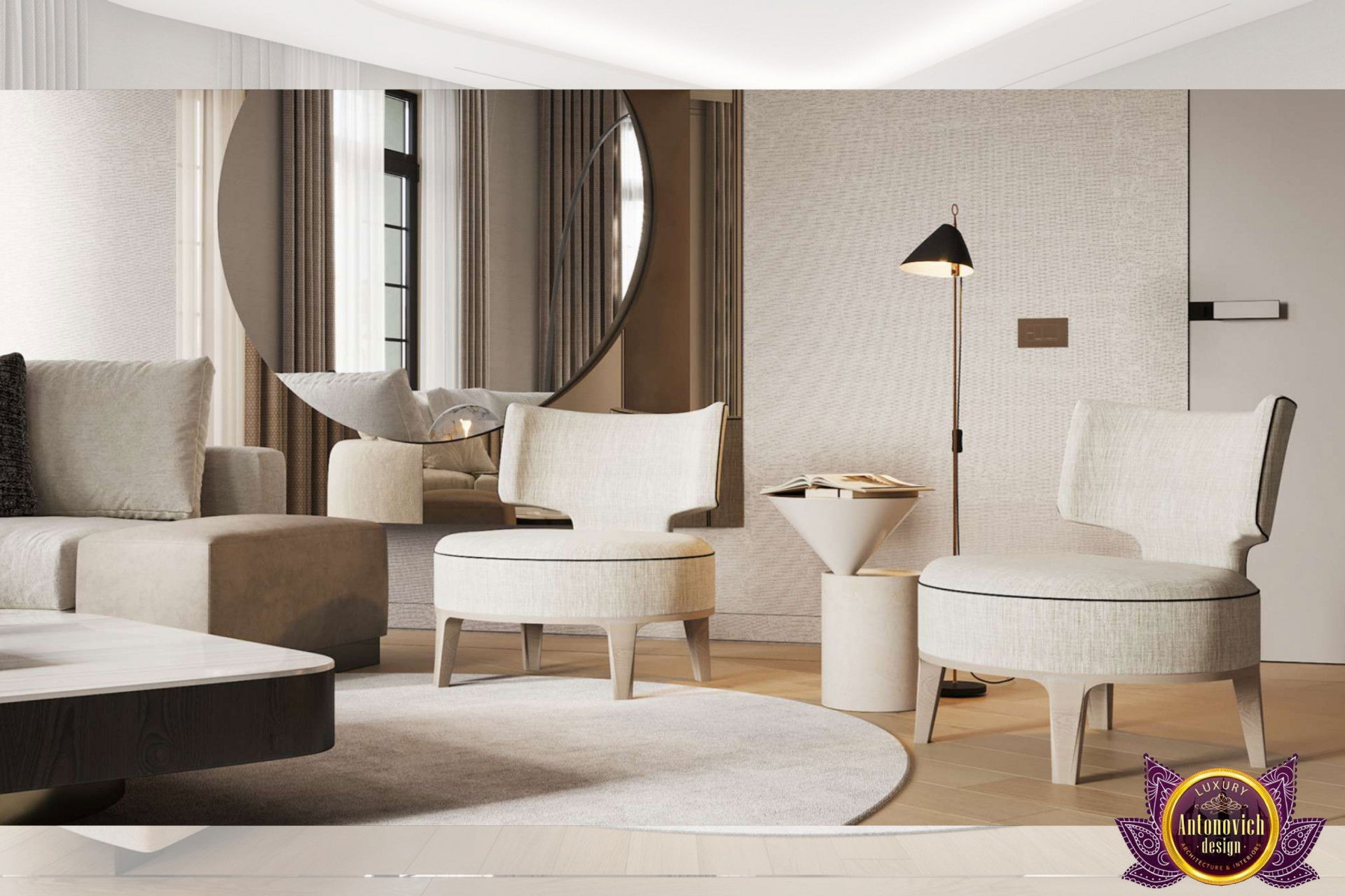 Готовая мебель из магазина порой не соответствует уровню такого интерьера — отделка и мебель под заказ помогают создать цельный образ. Разделение зон диванов и другой мебели обеспечивает более формальную планировку гостиной; уютные ниши и альковы дают возможность свободного размещения мест для отдыха. Полированная древесина и округлые формы сидений подчёркивают характер пространства, а грамотный подбор предметов усиливает ощущение гостеприимства и статуса.