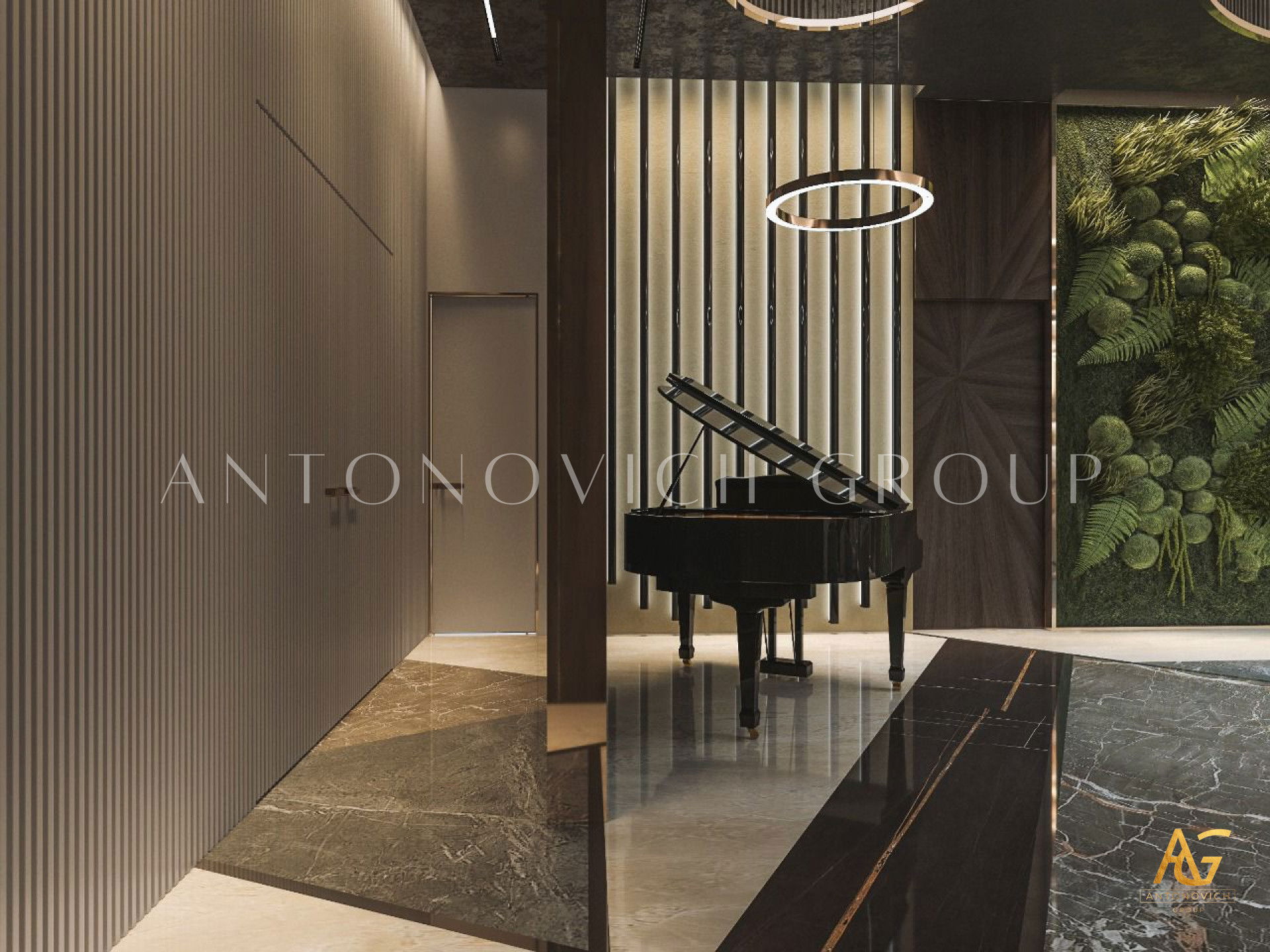 Мы выбрали тёмные и насыщенные оттенки для интерьера и использовали лучшие материалы и аксессуары, чтобы создать наиболее выразительное настроение салона. Художественная настенная роспись придаёт пространству драматичность, а индивидуальный ресепшн премиум для салона в Дубае приветствует каждого гостя. Мы остановили выбор на эффектной люстре и дополнительной настройке спотов для комфортной праздничной атмосферы — освещение и люстры для салона в Дубае формируют тон и глубину восприятия. Рояль как музыкальный инструмент усиливает гармоничное восприятие любого интерьера — это элемент акустического дизайна с роялем в салоне. Антонович Групп добилась спокойной и максимально классной интерьерной композиции в этом проекте. Чтобы избежать тесноты, наша команда тщательно спланировала планировку салона красоты в Дубае и организовала размещение декоративных и живых растений: декор с живыми растениями для салона уравновешивает роскошный интерьер салона в Дубае естественной притягательностью. В проекте использована мебель для салона красоты в Дубае высшего класса. Проект выполнен в духе VIP дизайн салона в Дубае, отвечающем ожиданиям взыскательных гостей.