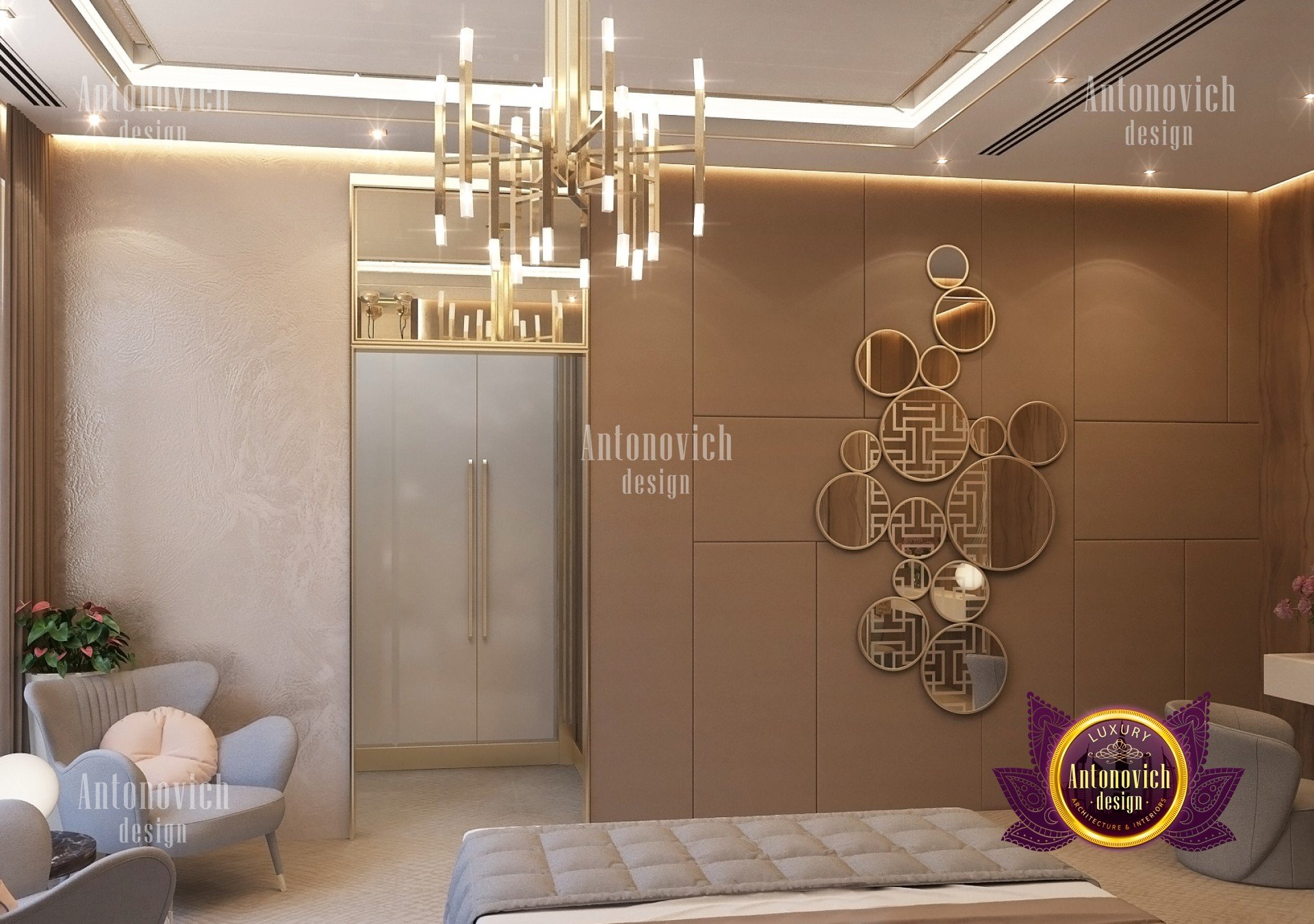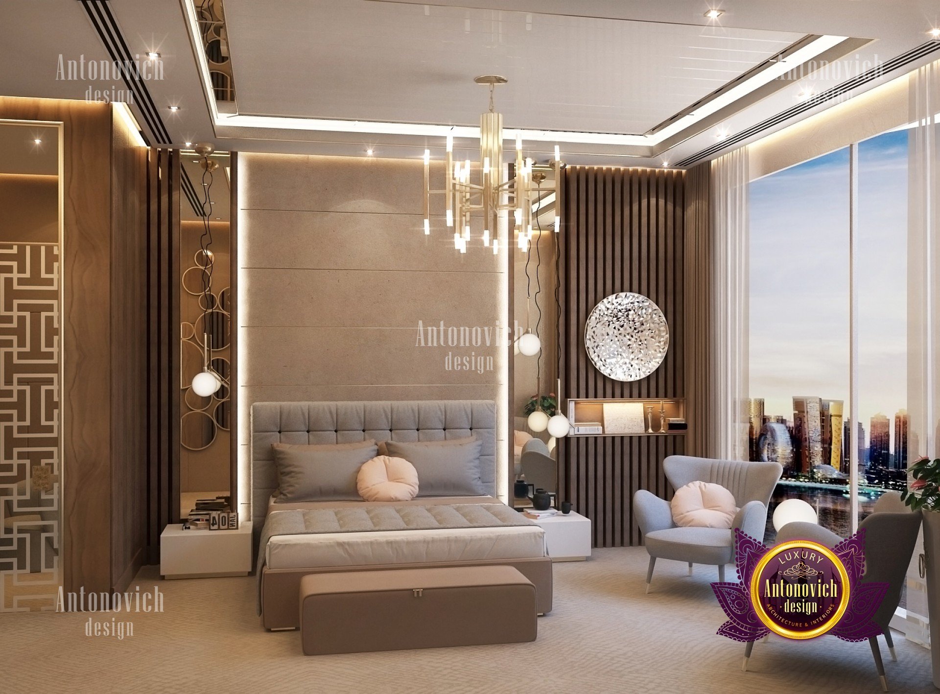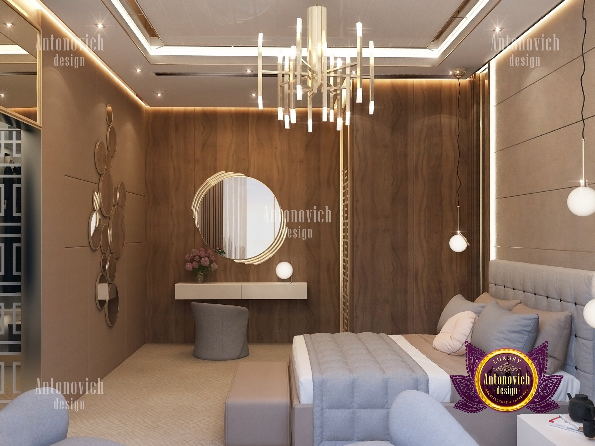 В спальне есть круглое зеркало для спальни, визуально увеличивающее пространство. Ключевым элементом стало роскошное освещение для спальни — люстра в гостиничном стиле и точечные решения, которые подчёркивают текстуры. Большая часть мебели была выполнена как индивидуальная мебель для спальни, а встроенное хранение в спальне сохранило чистые линии и лаконичный вид. Акцентная стена в спальне добавляет глубины и характер. Нейтральная палитра с тёмными акцентами, открытые металлы и простые аксессуары делают образ сбалансированным и притягательным. Эти решения служат идеями для спальни в стиле лофт в Москве и других городских проектов региона.