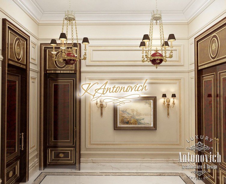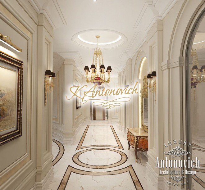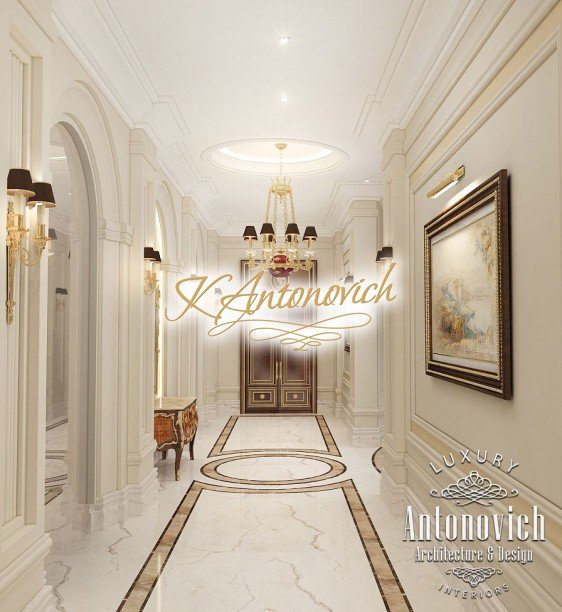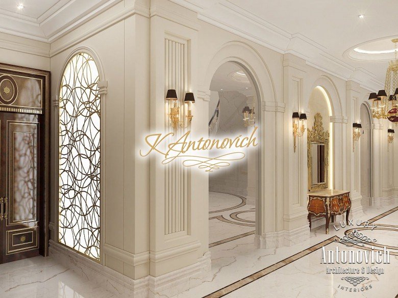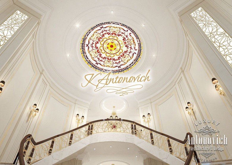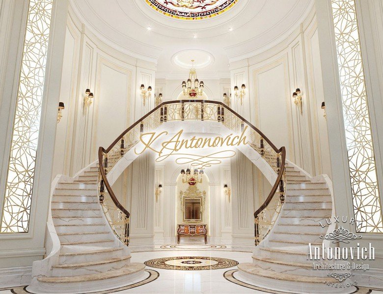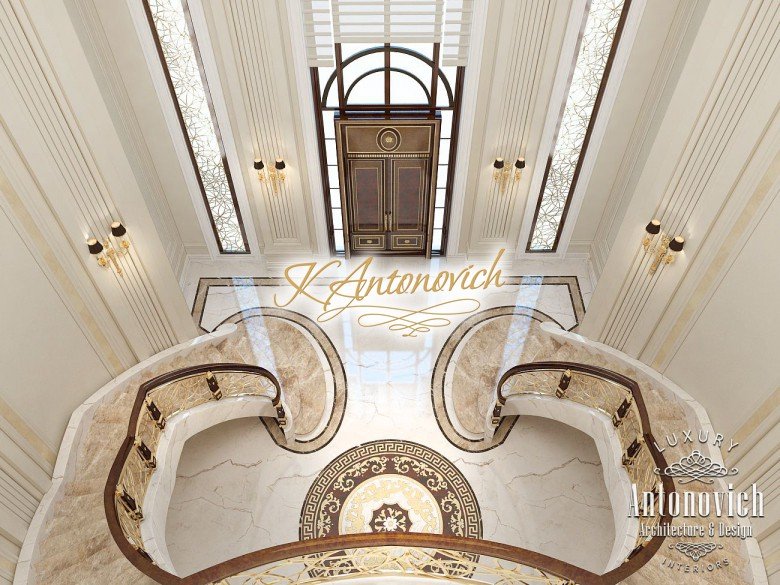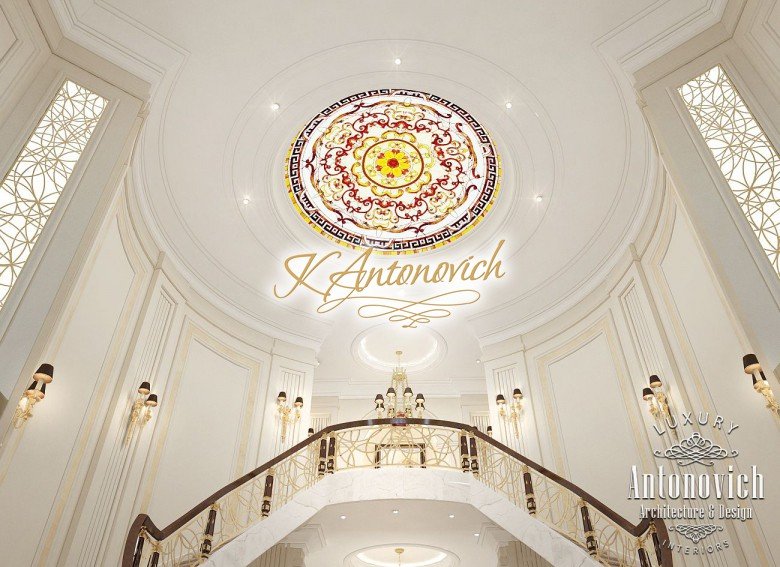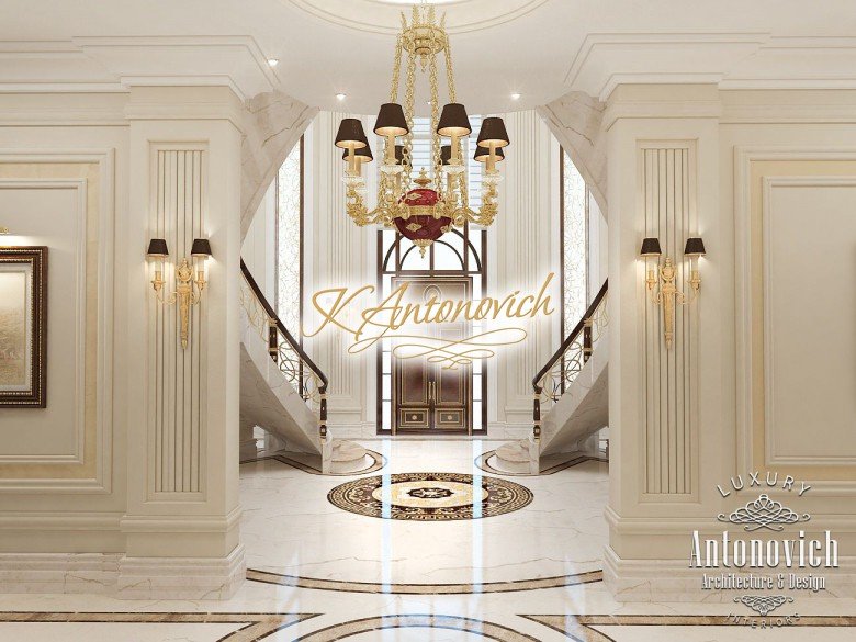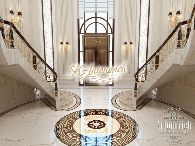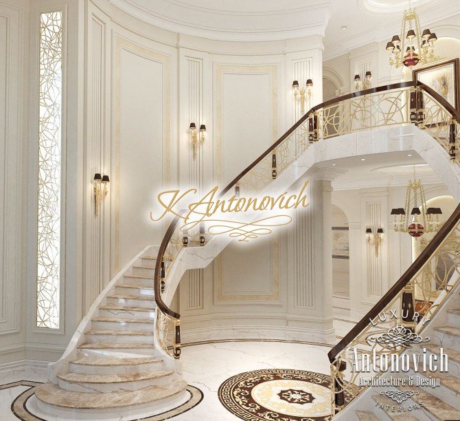 Эти решения сочетают знания древних традиций и возможности новейших технологий. Что такое интерьер сегодня? Это абсолютный комфорт с интеллектуальным содержанием. Дизайн холла мы выделяем как отдельную часть работы. Холл в роскошных виллах становится одним из главных отражений духа семьи, её традиций, высокого статуса и чувства прекрасного. Это проект виллы в ОАЭ в стиле современной классики. Холл, согласно архитектурному проекту, занимает большую часть центрального портала здания и простирается на всю его высоту. Главным украшением интерьера стала роскошная двухмаршевая лестница из мрамора. Белый мрамор в интерьере холла подчёркивает монументальность пространства. Чтобы разбавить пастельную палитру интерьера, дизайнеры использовали витражи в технике Тиффани. В проекте применены витражи техника Тиффани в интерьере для акцента на потолке. По бокам лестницы — узкие высокие окна с витражами, украшенные переплетёнными латунными полосами, визуально напоминающими машрабию. Резный мраморный рисунок пола стал элегантным отражением витража на потолке. Изысканный рисунок натурального мрамора коричневого оттенка делает интерьер очень ярким и выразительным. Кованая балюстрада с позолоченными поручнями из ценных пород дерева плавно переходит в верхнюю часть лестницы, делая портал лестницы завершённым и гармоничным. В проекте отражены: дизайн входной зоны виллы, холл в классическом стиле, вилла в ОАЭ в стиле современной классики, двухмаршевая лестница из мрамора, белый мрамор в интерьере холла, витражи техника Тиффани в интерьере, узкие высокие окна с витражами, резный мраморный рисунок пола, кованая балюстрада с позолоченными поручнями, идеи дизайна входной зоны виллы. Дизайн входной зоны виллы подчёркивает статус и эстетические предпочтения семьи. Холл в классическом стиле здесь сочетается с современными технологиями и материалами. Идеи дизайна входной зоны виллы показывают, как архитектура и интерьер смотрят в будущее.