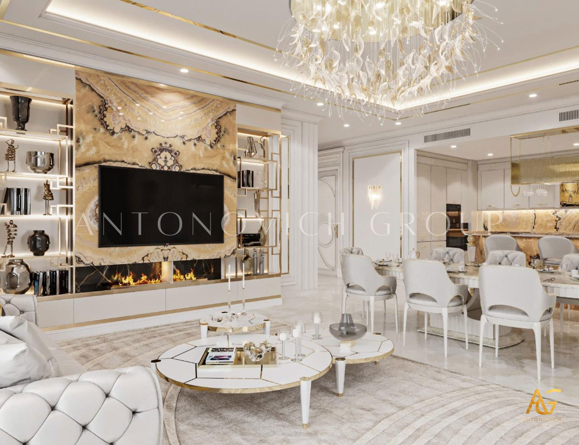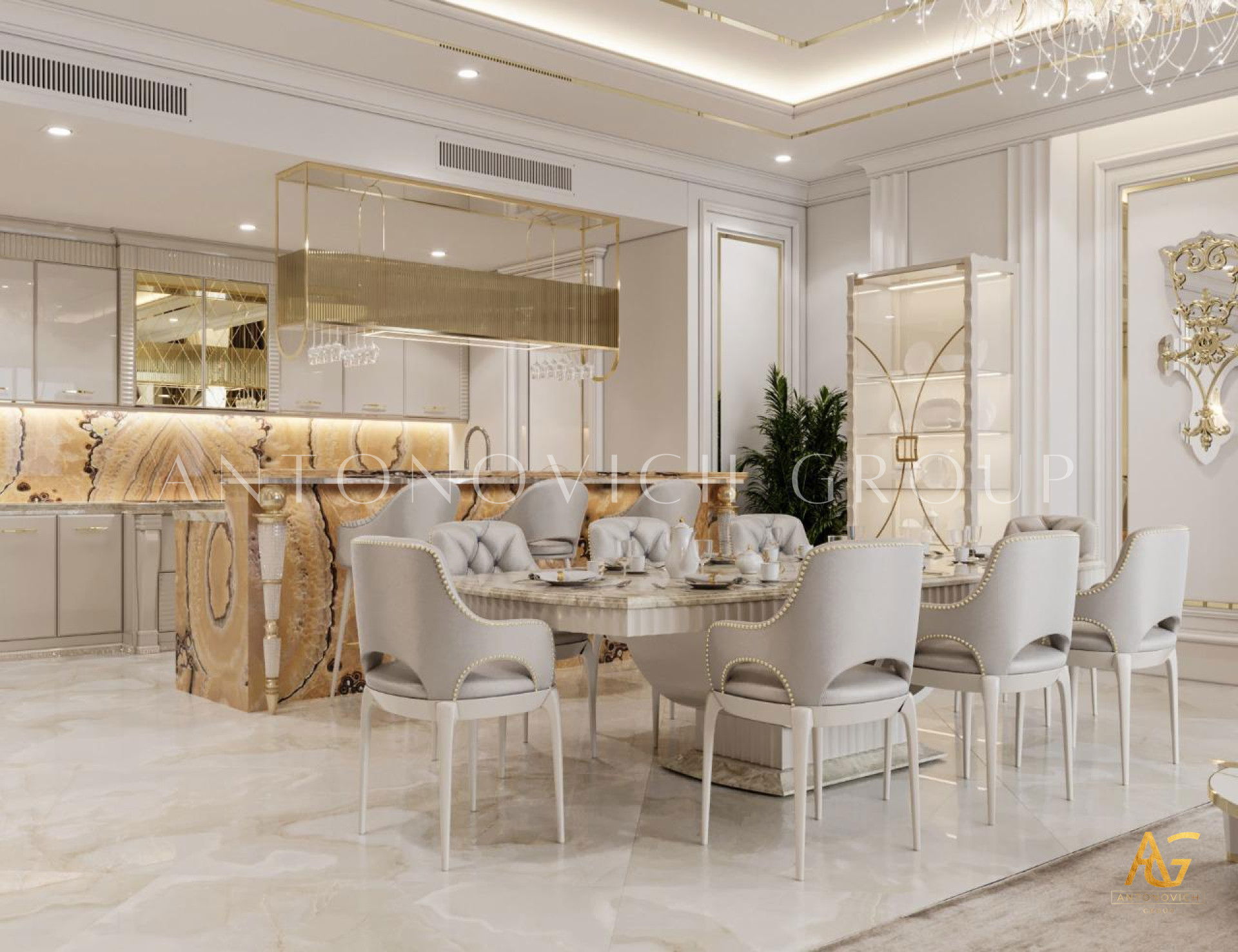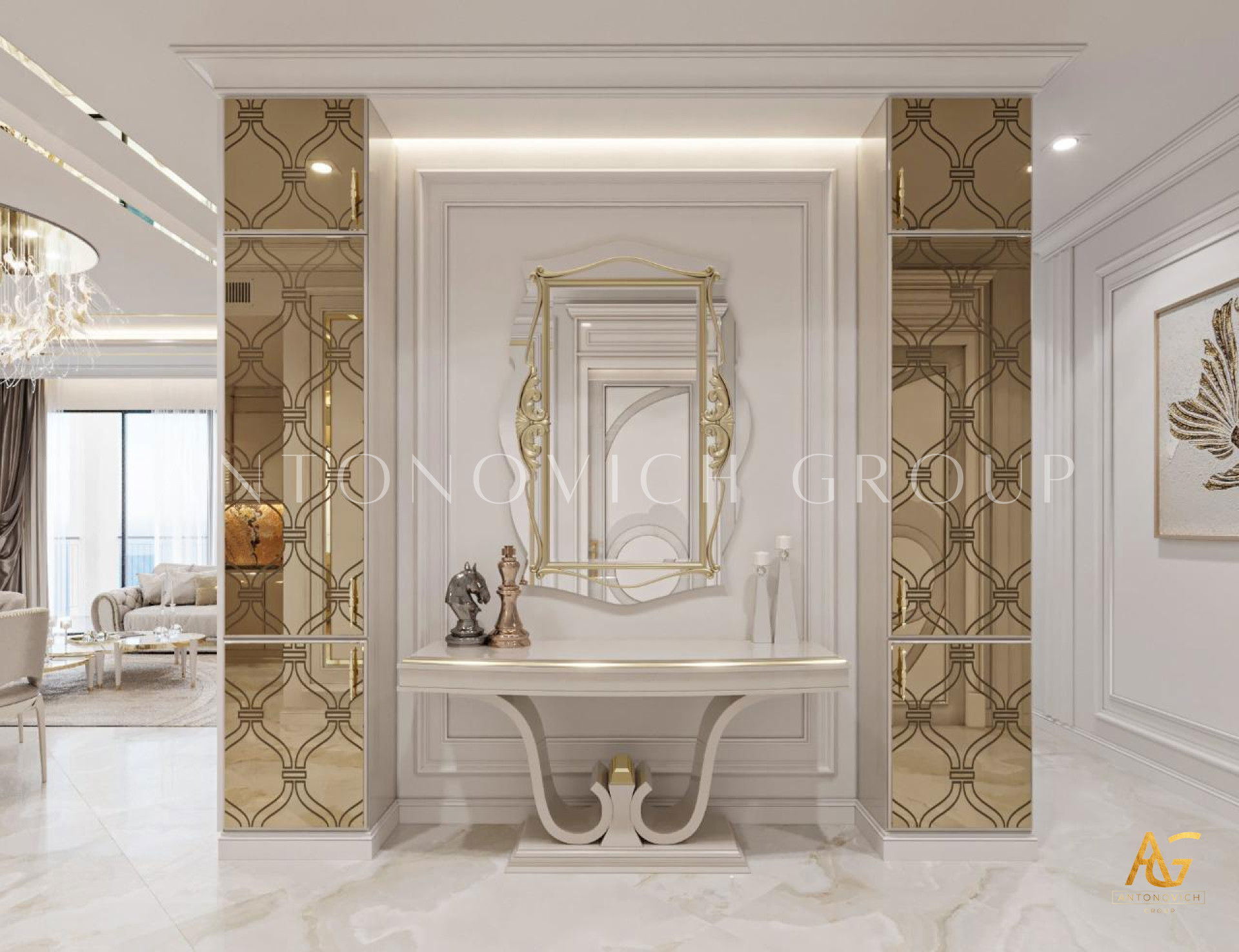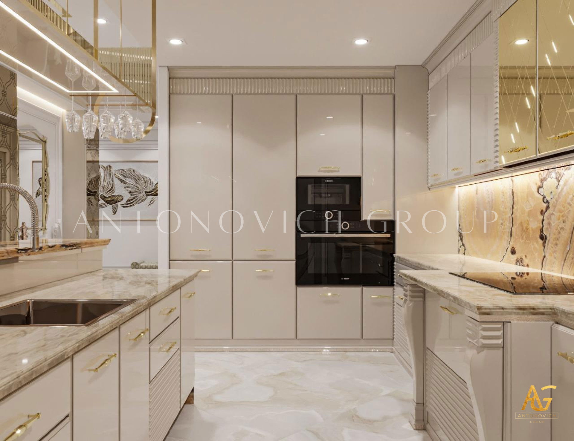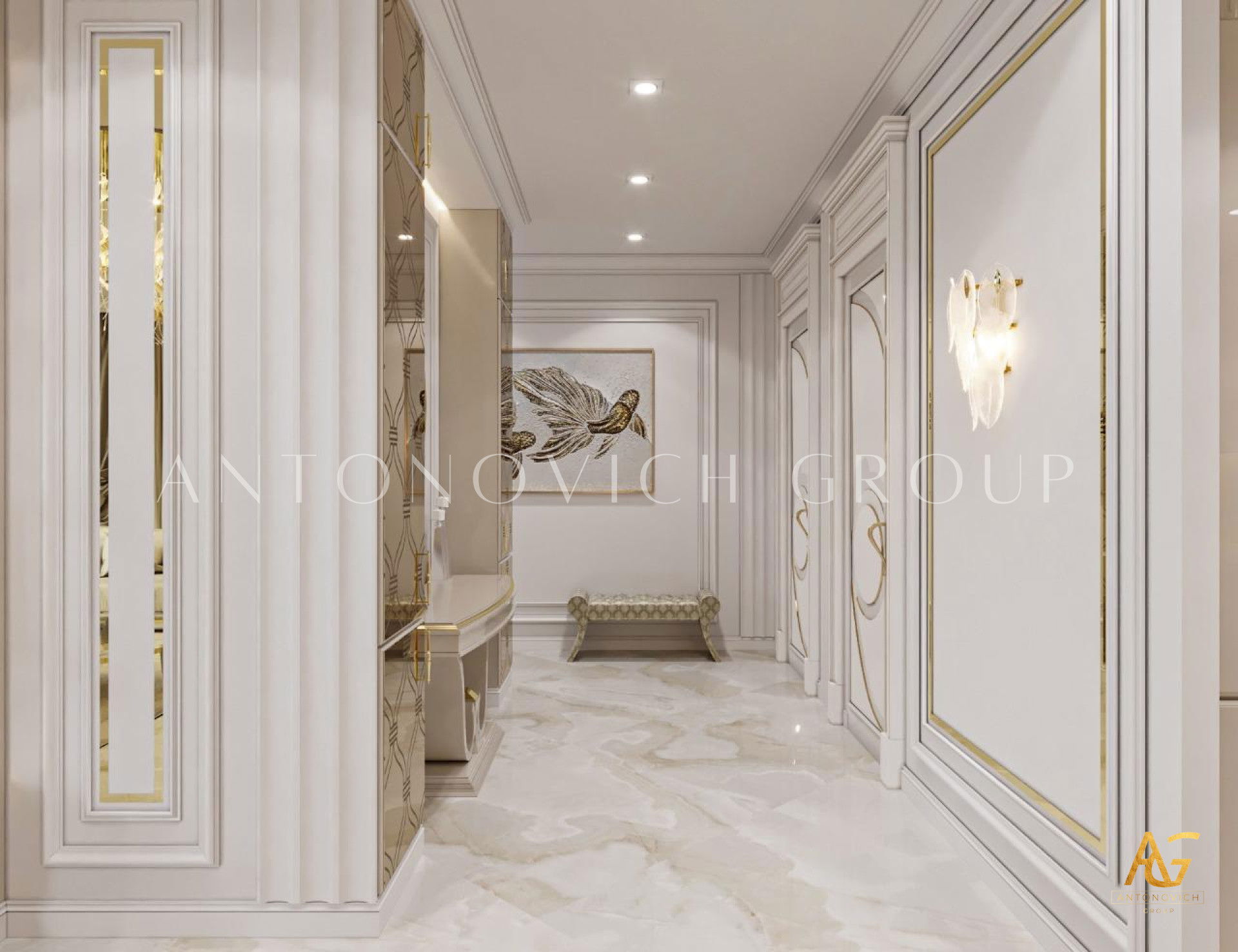 Элегантный интерьер квартиры, созданный дизайнерами студии Антонович Дизайн (Antonovich Design), подчёркивает высокий статус её владельцев. Авторы проекта наполнили каждую комнату и каждый уголок уютной и роскошной атмосферой. Интерьер квартиры в стиле современной классики доминирует в гостиной, где гостиная совмещенная с обеденной зоной выглядит мягко, комфортно и очень изысканно. В отделке использована светлая палитра с акцентами золота — интерьер квартиры с золотыми акцентами подчёркивает благородство материалов. В благородной классике современные гаджеты смотрятся гармонично, а помещения обогащены мебелью с резной позолотой. В центре белой потолочной поверхности размещён медальон из лепнины на потолке и элегантная классическая люстра. В гостиной большой круглый ковер и паркетная доска создают тёплую и приятную основу — круглый ковер и паркетная доска выглядят особенно уютно. Полукруглый диван в интерьере гостиной идеально вписывается в образ уютной роскоши. Дизайн спальни даёт эстетическое и чувственное удовольствие — роскошный интерьер спальни с резной мебелью, изящной отделкой окон и тщательно подобранными цветами. Чтобы усилить блеск интерьера, авторы использовали зеркальные панели в отделке стен — зеркальные панели визуально расширяют пространство и добавляют глубины. В этом авторском проекте дизайнеры уделили особое внимание дизайну кабинета для главы семьи, где продуманы рабочие зоны и эргономика.