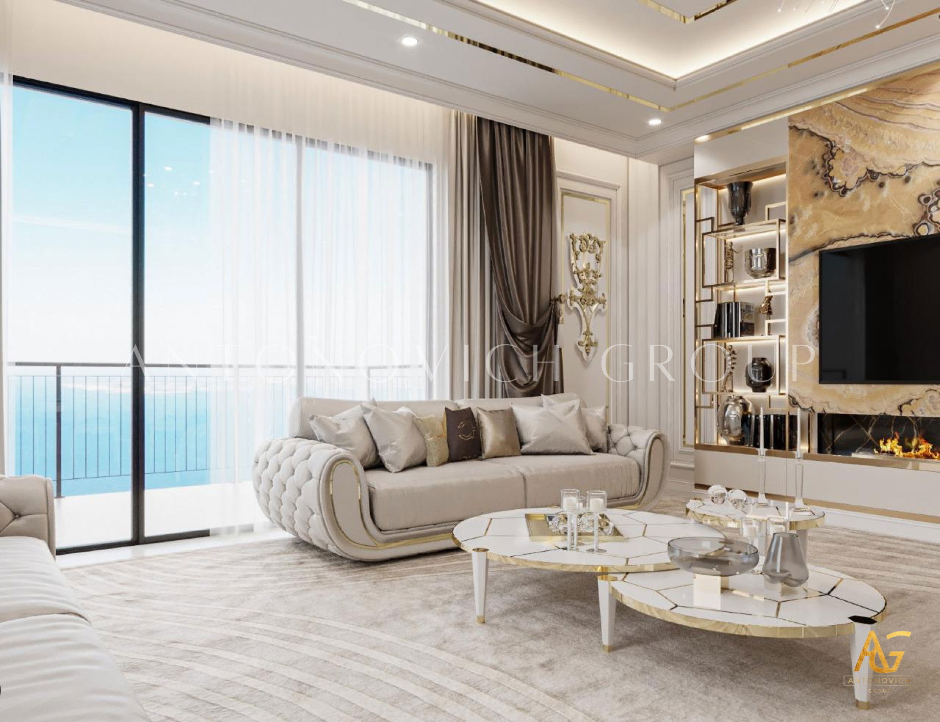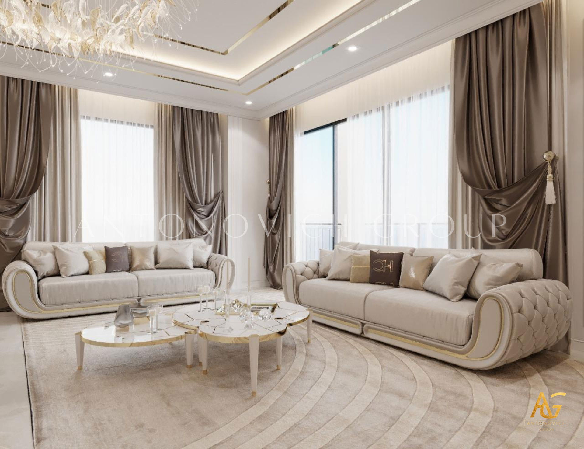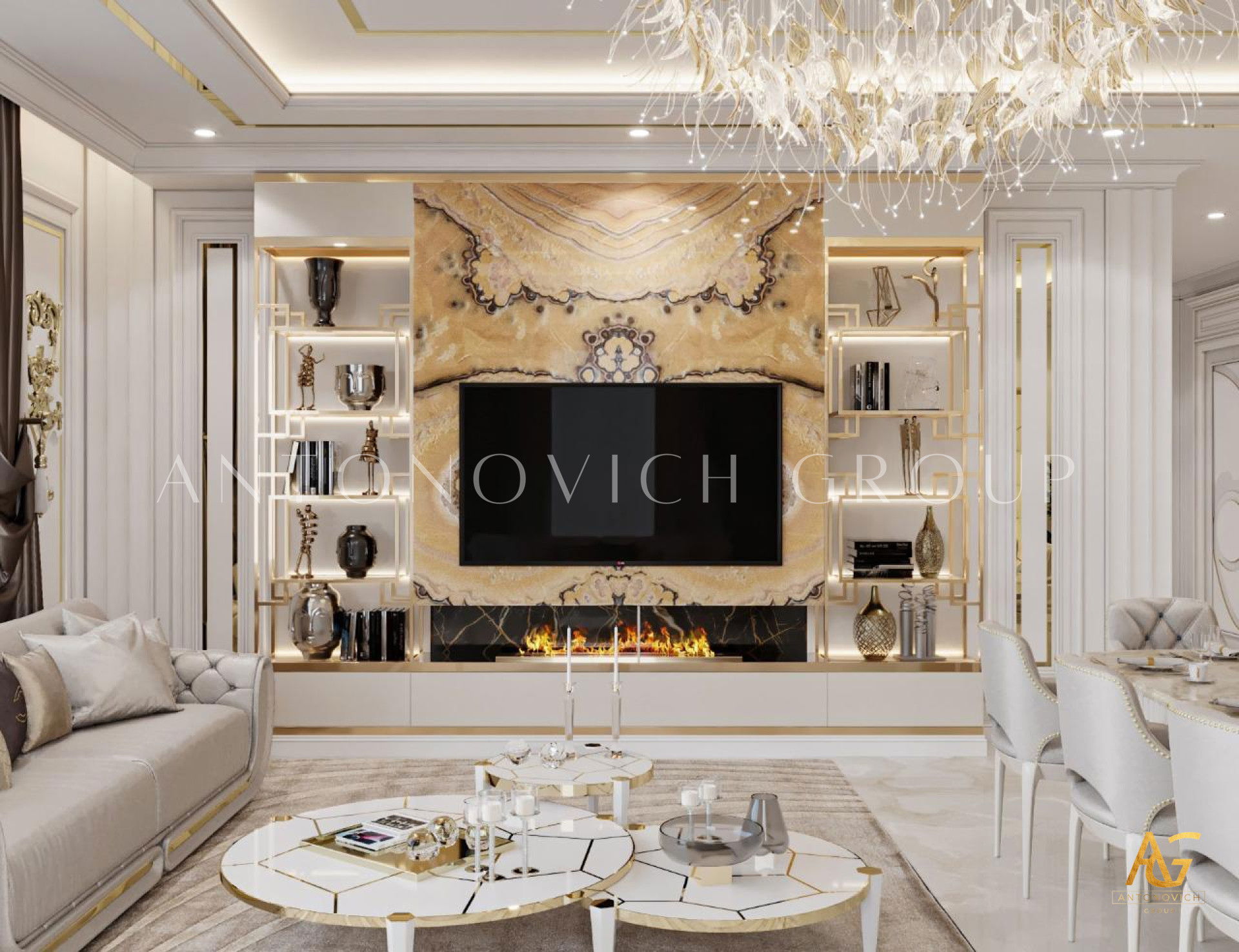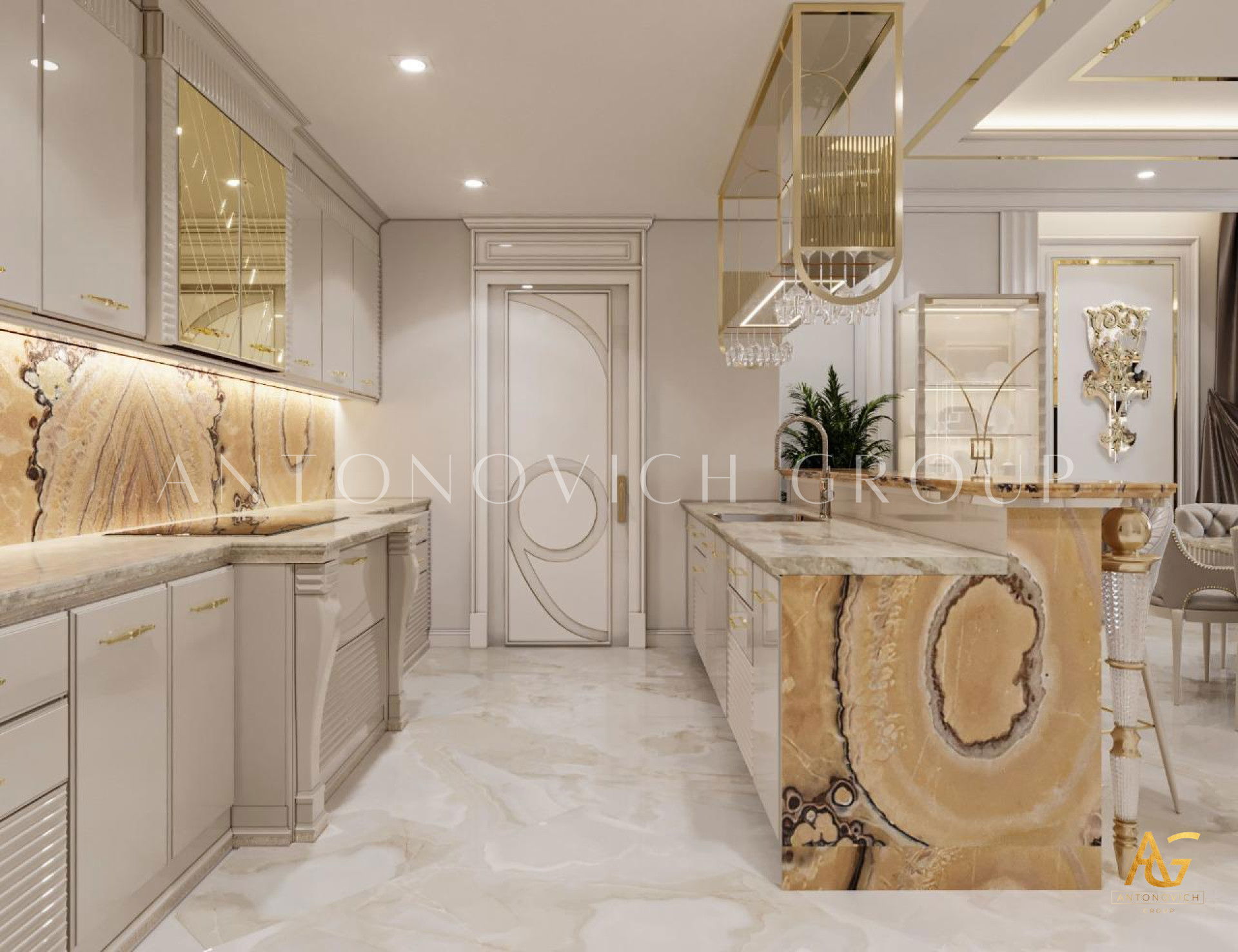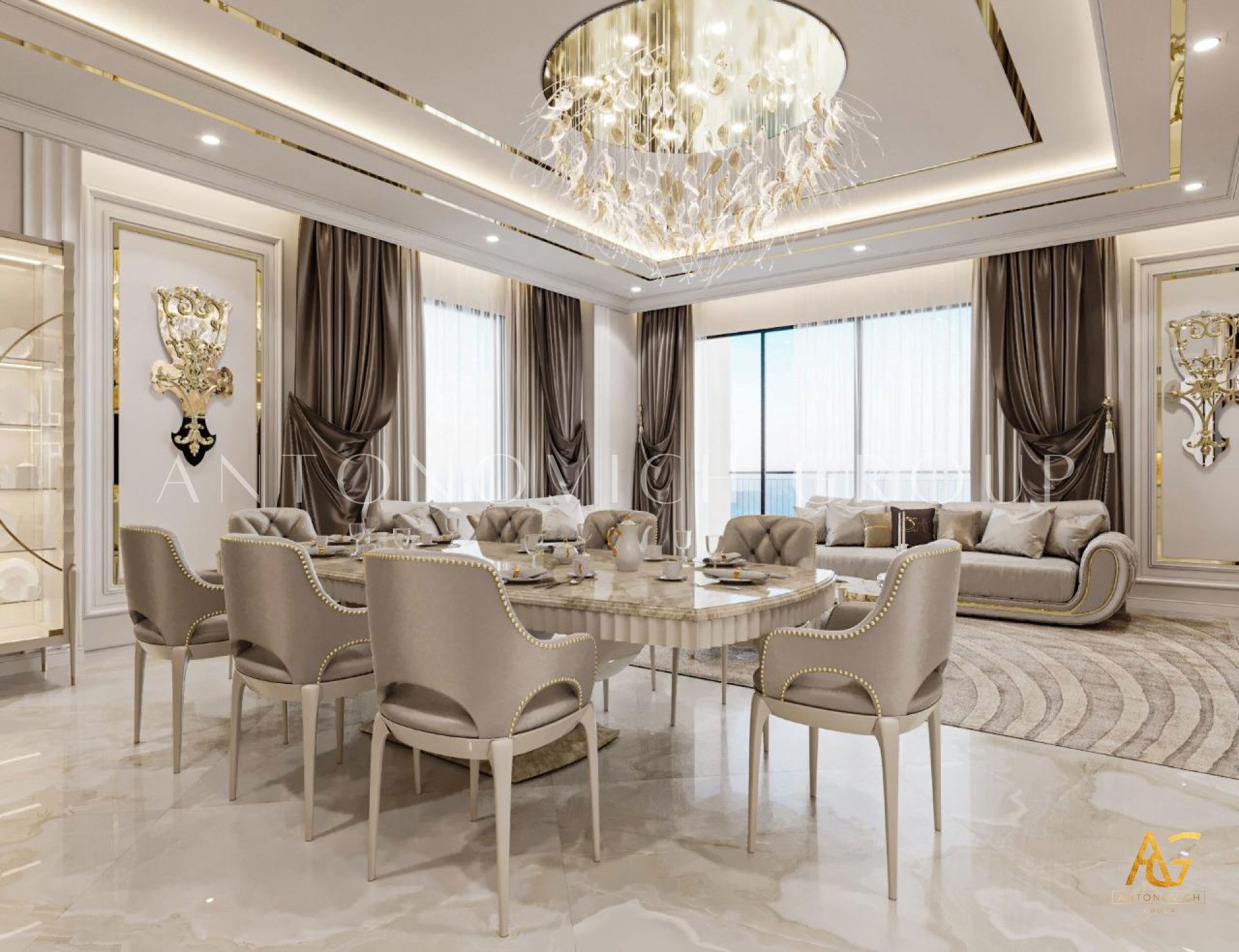Элегантный интерьер квартиры, созданный дизайнерами студии Антонович Дизайн (Antonovich Design), подчёркивает высокий статус её владельцев. Авторы проекта наполнили каждую комнату и каждый уголок уютной и роскошной атмосферой. Интерьер квартиры в стиле современной классики доминирует в гостиной, где гостиная совмещенная с обеденной зоной выглядит мягко, комфортно и очень изысканно. В отделке использована светлая палитра с акцентами золота — интерьер квартиры с золотыми акцентами подчёркивает благородство материалов. В благородной классике современные гаджеты смотрятся гармонично, а помещения обогащены мебелью с резной позолотой. В центре белой потолочной поверхности размещён медальон из лепнины на потолке и элегантная классическая люстра. В гостиной большой круглый ковер и паркетная доска создают тёплую и приятную основу — круглый ковер и паркетная доска выглядят особенно уютно. Полукруглый диван в интерьере гостиной идеально вписывается в образ уютной роскоши. Дизайн спальни даёт эстетическое и чувственное удовольствие — роскошный интерьер спальни с резной мебелью, изящной отделкой окон и тщательно подобранными цветами. Чтобы усилить блеск интерьера, авторы использовали зеркальные панели в отделке стен — зеркальные панели визуально расширяют пространство и добавляют глубины. В этом авторском проекте дизайнеры уделили особое внимание дизайну кабинета для главы семьи, где продуманы рабочие зоны и эргономика.
