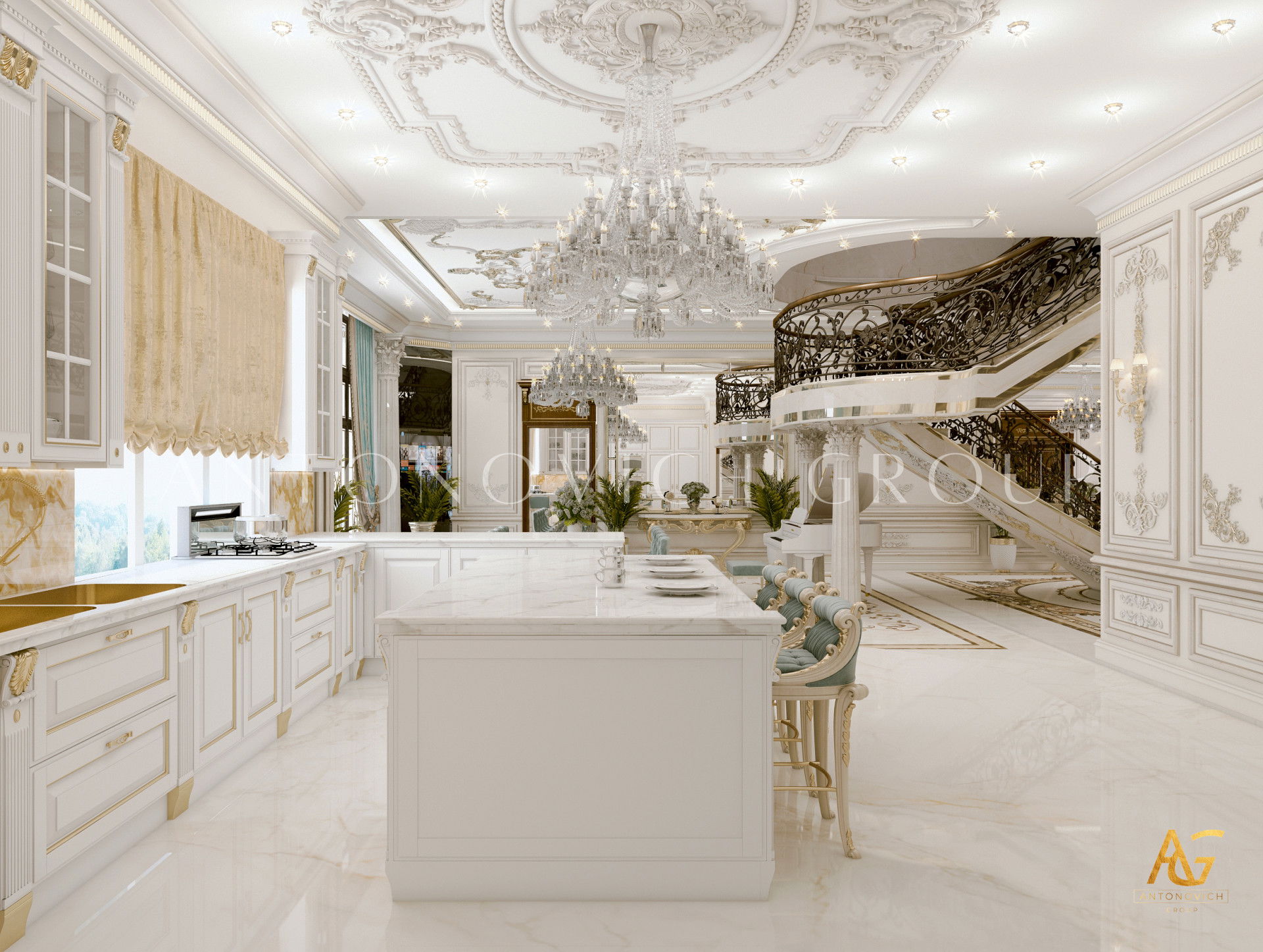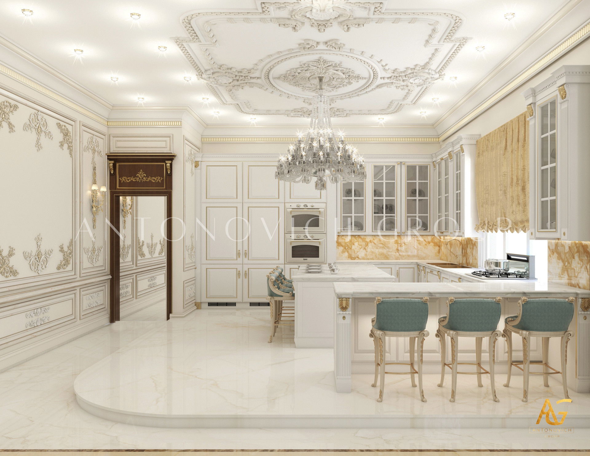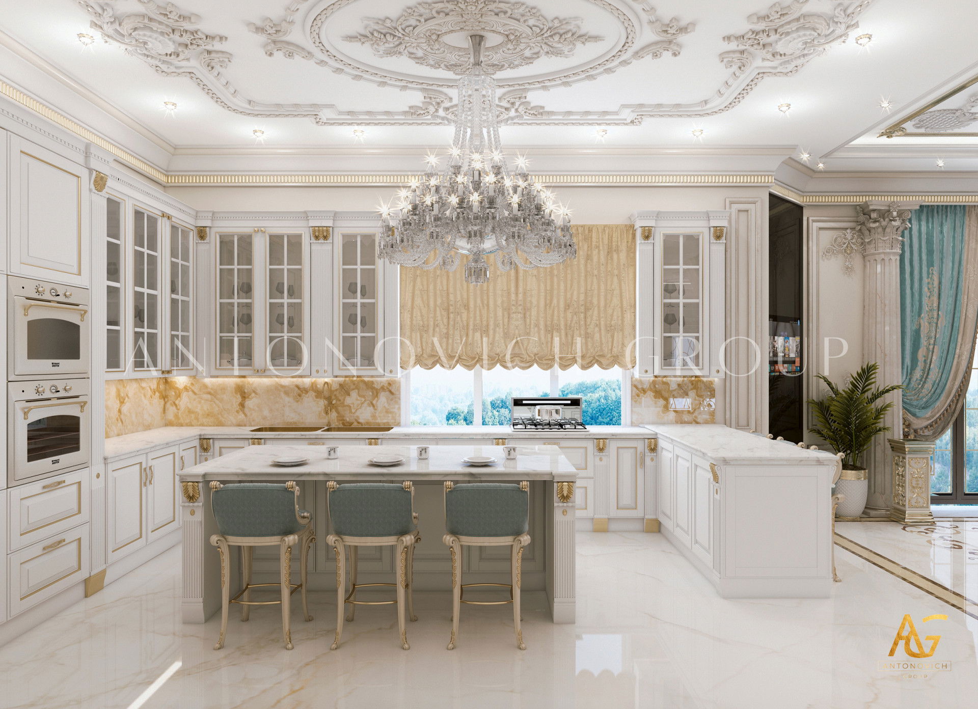 Всегда популярная и модная классика в работах студии Luxury Antonovich Design продолжает радовать и удивлять своей красотой, новизной и уникальностью. Этот интерьер дома в Абу-Даби стал отличным воплощением пожеланий его владельцев. Их основное желание заключалось в том, чтобы получить роскошь дворцовой резиденции в пределах городской квартиры. И с этой задачей дизайнеры студии Antonovich Design справились блестяще. Респектабельная гостиная была украшена красивым потолком с лепными украшениями, элитным паркетным полом из светлого дерева в английском стиле, роскошной мебелью и красивыми шторами. Сдержанная палитра оттенков в интерьере стала моментом элегантности и уютного настроения. Великолепный и элегантный декор стен с лепниной, позолотой, шелковыми обоями, картинами и классическими бра прекрасно вписался в интерьер и стал роскошной рамкой для других деталей и элементов декора. Шторы из шелкового бархата с приятным лиловым оттенком перекликаются с обивкой мебели. Обеденная зона расположена у окна и занимает почти половину комнаты, что прекрасно подчеркивает гостеприимный характер владельцев квартиры. Красивая белая кухня продолжает мотивы классического стиля. В общей белой гамме перламутровых оттенков мягкие стулья из шелка мятного оттенка и роскошные шторы в тех же тонах с золотыми орнаментами выглядят ярко. Самым романтичным и нежным уголком квартиры является красивая спальня с роскошным оформлением стен. И только для детской комнаты дизайнеры интерьера применили совершенно другую концепцию современного стиля. Ведь основная задача — создать идеальную среду обитания для каждого члена семьи.