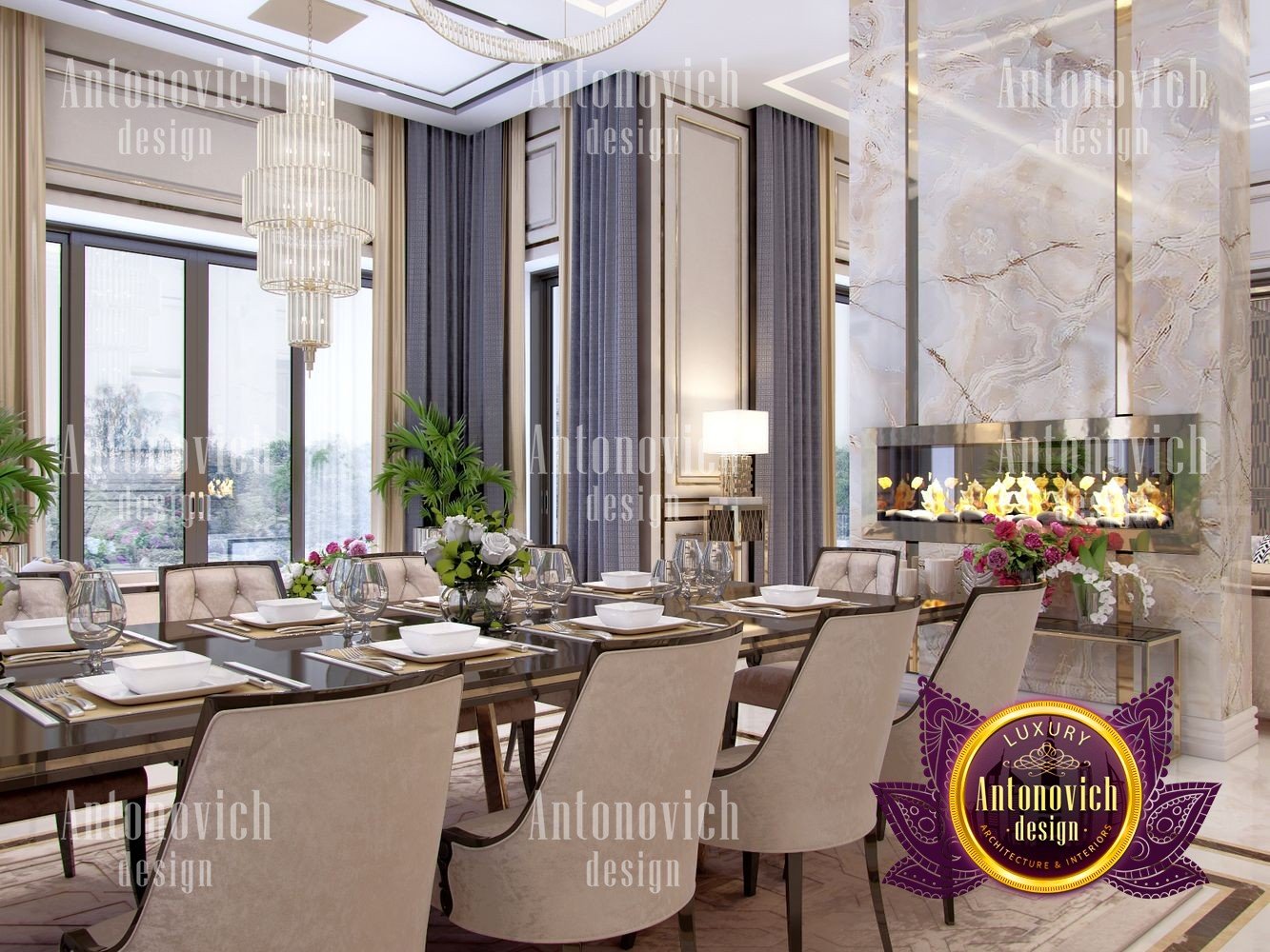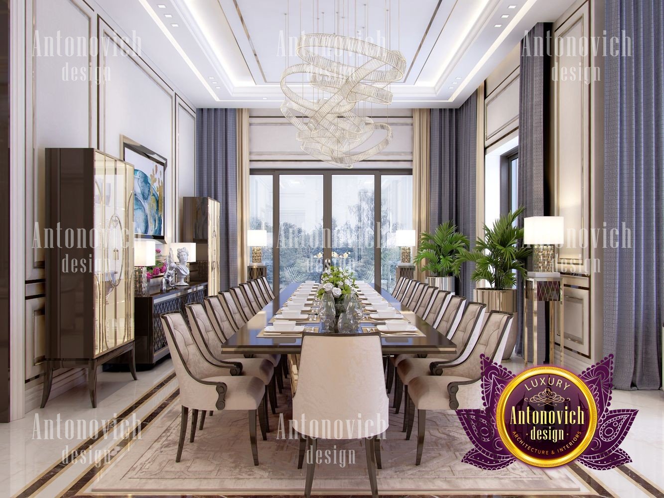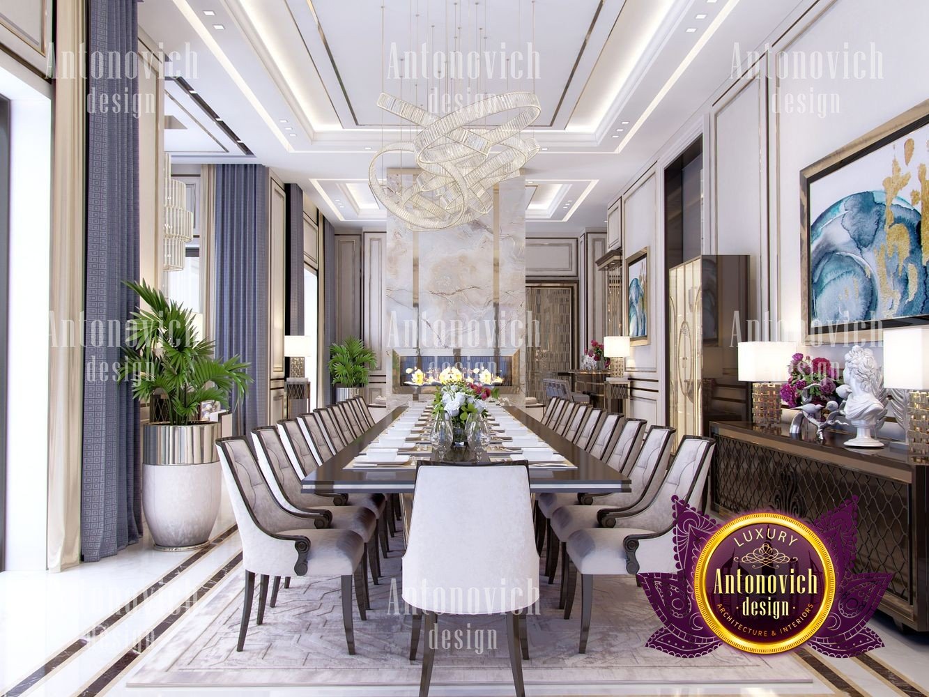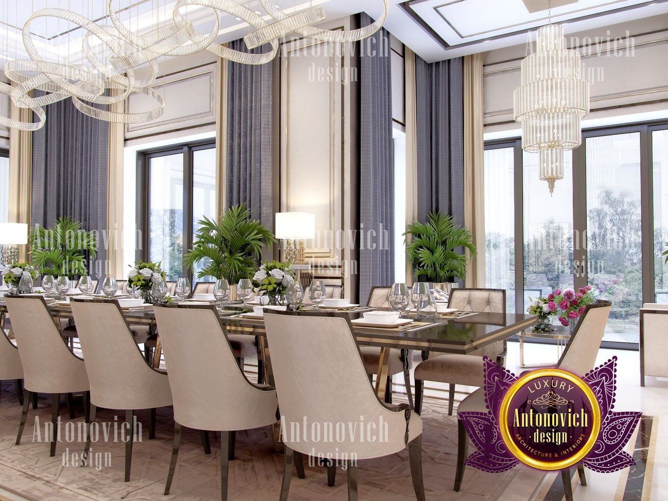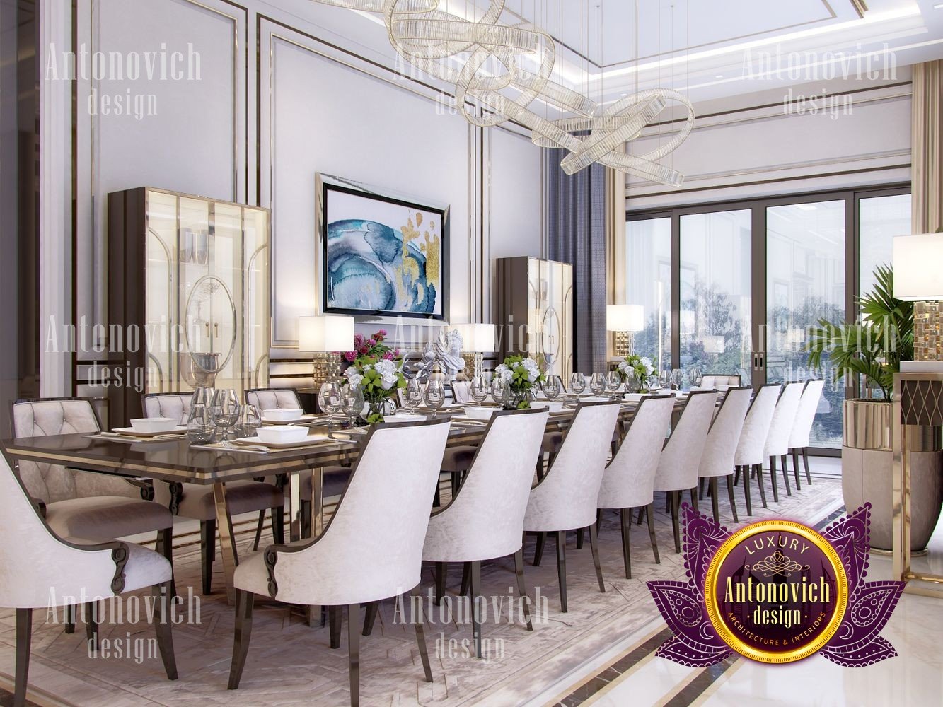 Этот обеденный зал напоминает сцены из голливудских фильмов. Здесь центральный элемент — большой обеденный стол. Наслаждайтесь моментом с вашей большой семьёй за аккуратно отделанной поверхностью. Стулья выдержаны в единой стилистике, что придаёт комнате утонченность и изящество. Красота и роскошь на высшем уровне.