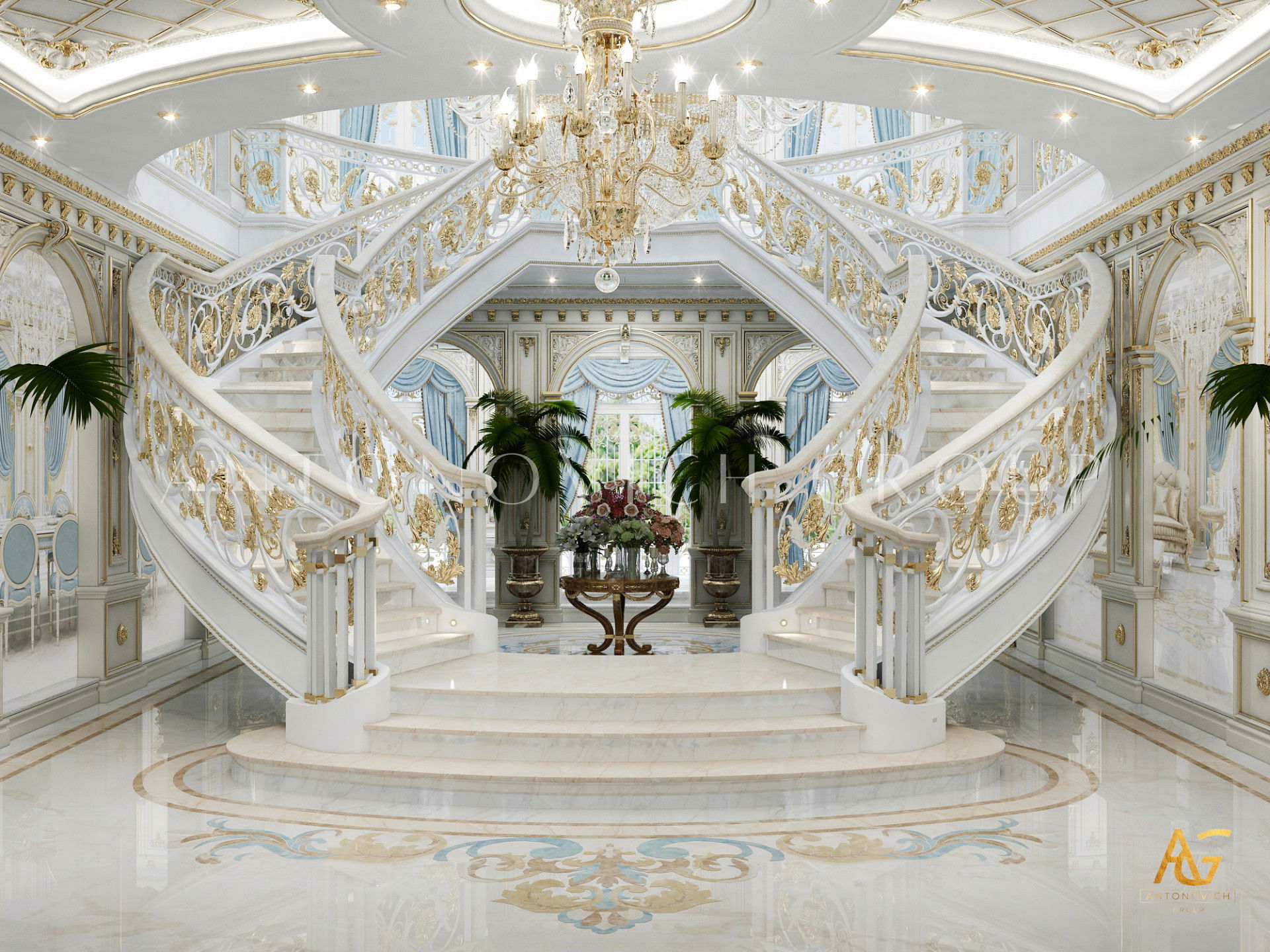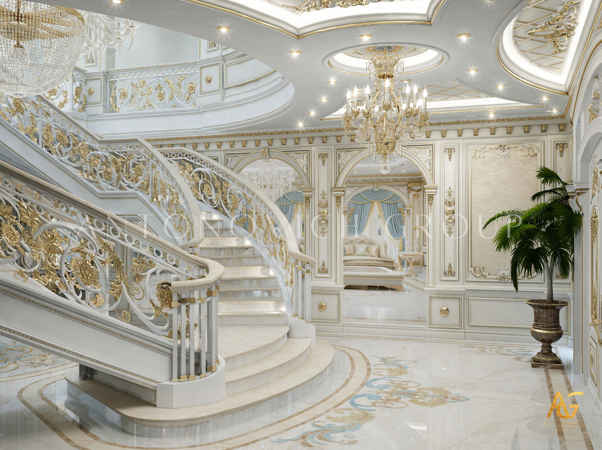 Ключевой аспект проекта — дизайн интерьера виллы, который учитывает пропорции, материалы и свет. Для создания роскошного образа часто применяют элементы, характерные для роскошный дизайн виллы в Саудовской Аравии и для элитный интерьер виллы в Саудовской Аравии: изысканные отделки, богатые текстуры и художественные светильники. Отдельное внимание уделяется деталям, таким как дизайн лестницы для особняка — эффектная лестница становится центральным акцентом, дополненным люстрами и встроенным освещением. В нашем подходе мы используем тщательно подобранные люстры и освещение для вилл, чтобы подчеркнуть архитектуру и интерьер.
