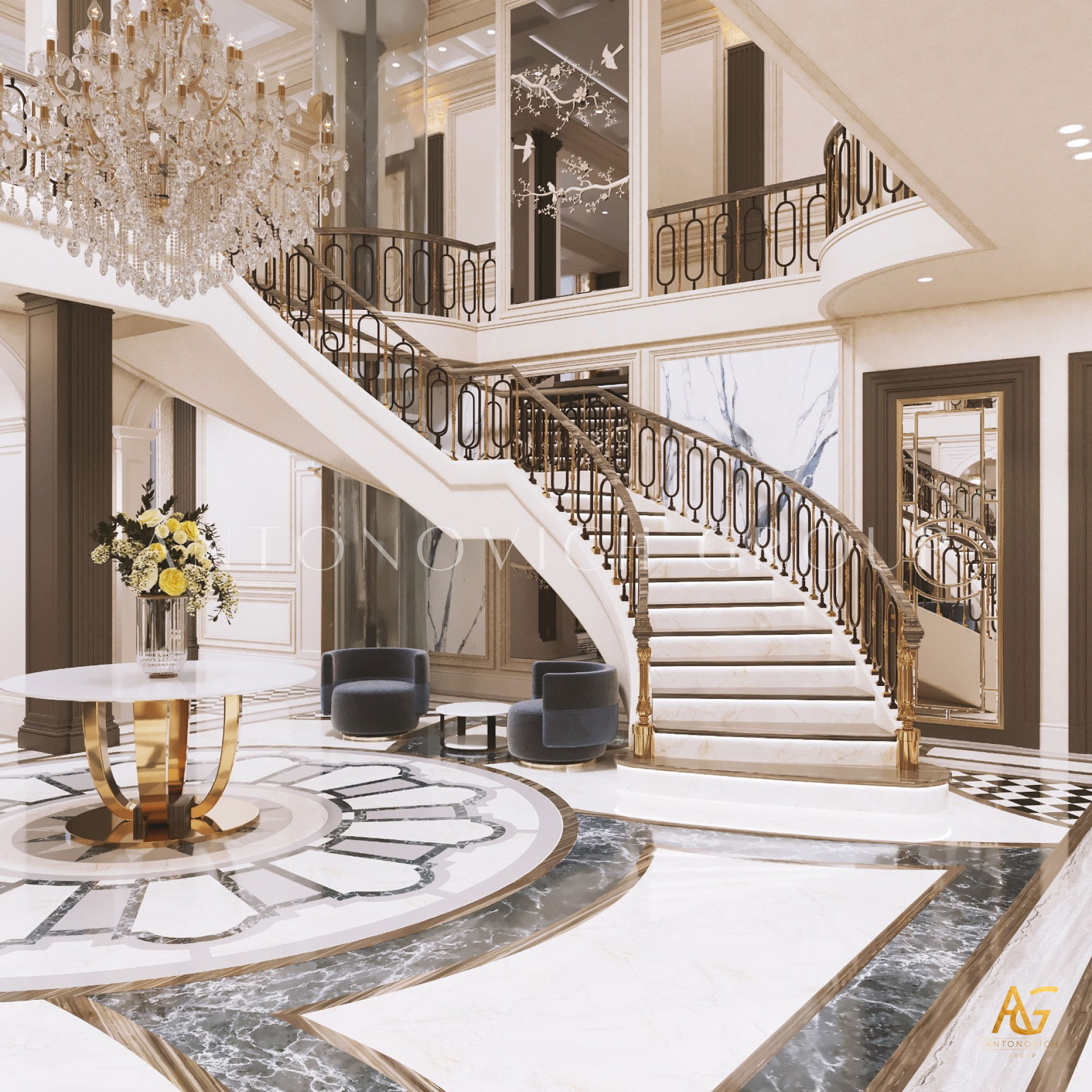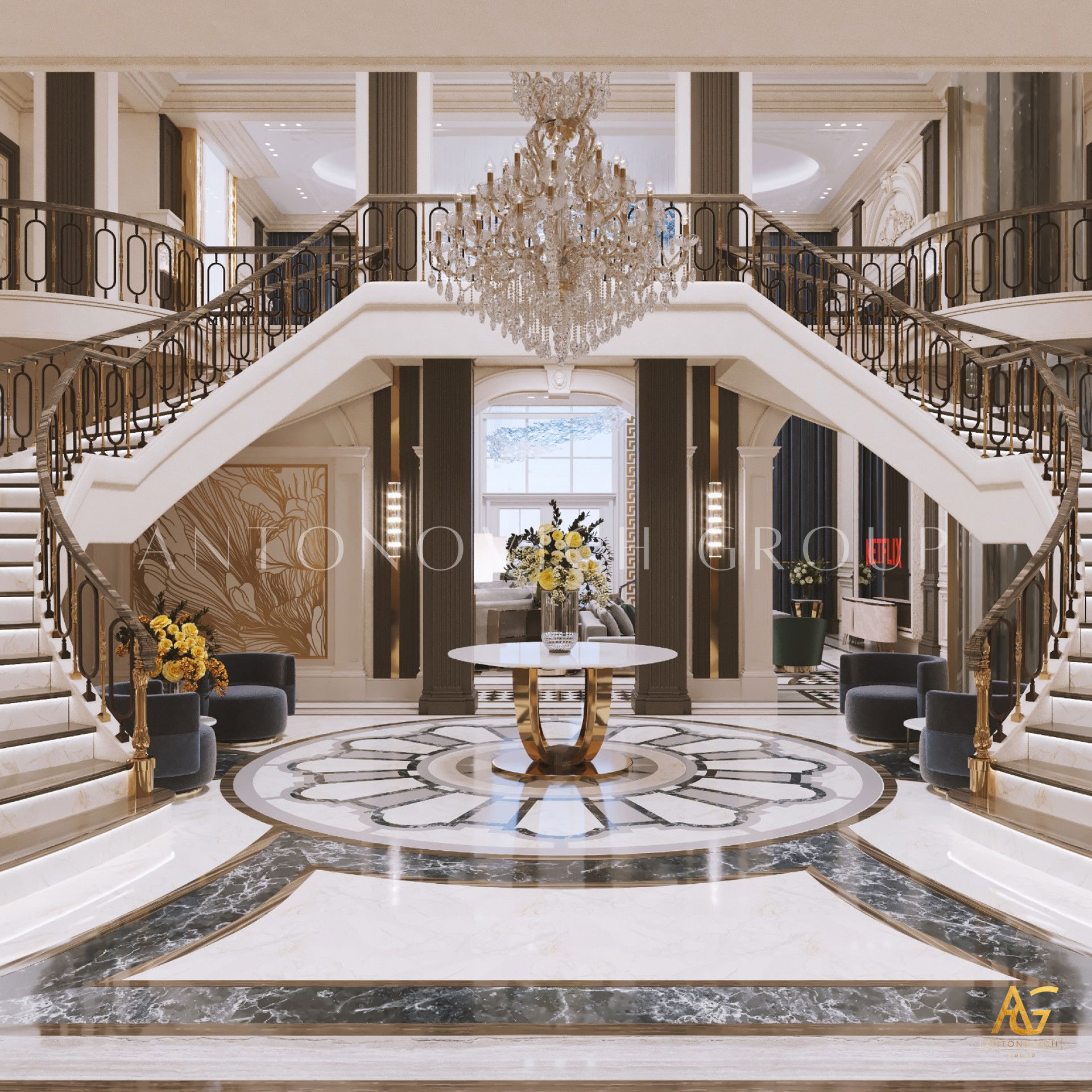 Когда речь идет о лучших дизайнерах интерьеров в Эр-Рияде, Luxury Antonovich Design всегда является первым выбором любого клиента, поскольку она постоянно предлагает только лучшие реализации дизайна. В самых престижных и лучших декорациях и стилях используются самые выдающиеся и качественные материалы. Роскошный особняк никогда не будет завершен без самого интригующего дизайна лестницы. И, как компания по дизайну интерьеров в Саудовской Аравии, команда разработала самую драматическую атмосферу и стиль для лестницы. Она была идеально освещена индивидуальными люстрами, изготовленными из премиум-кристаллов и стекла.