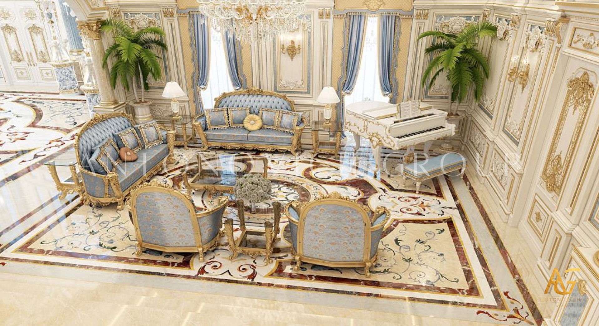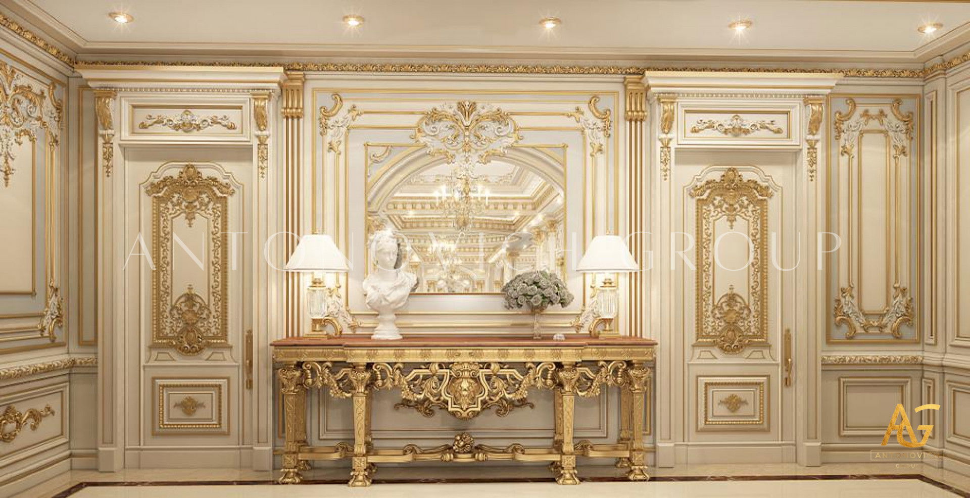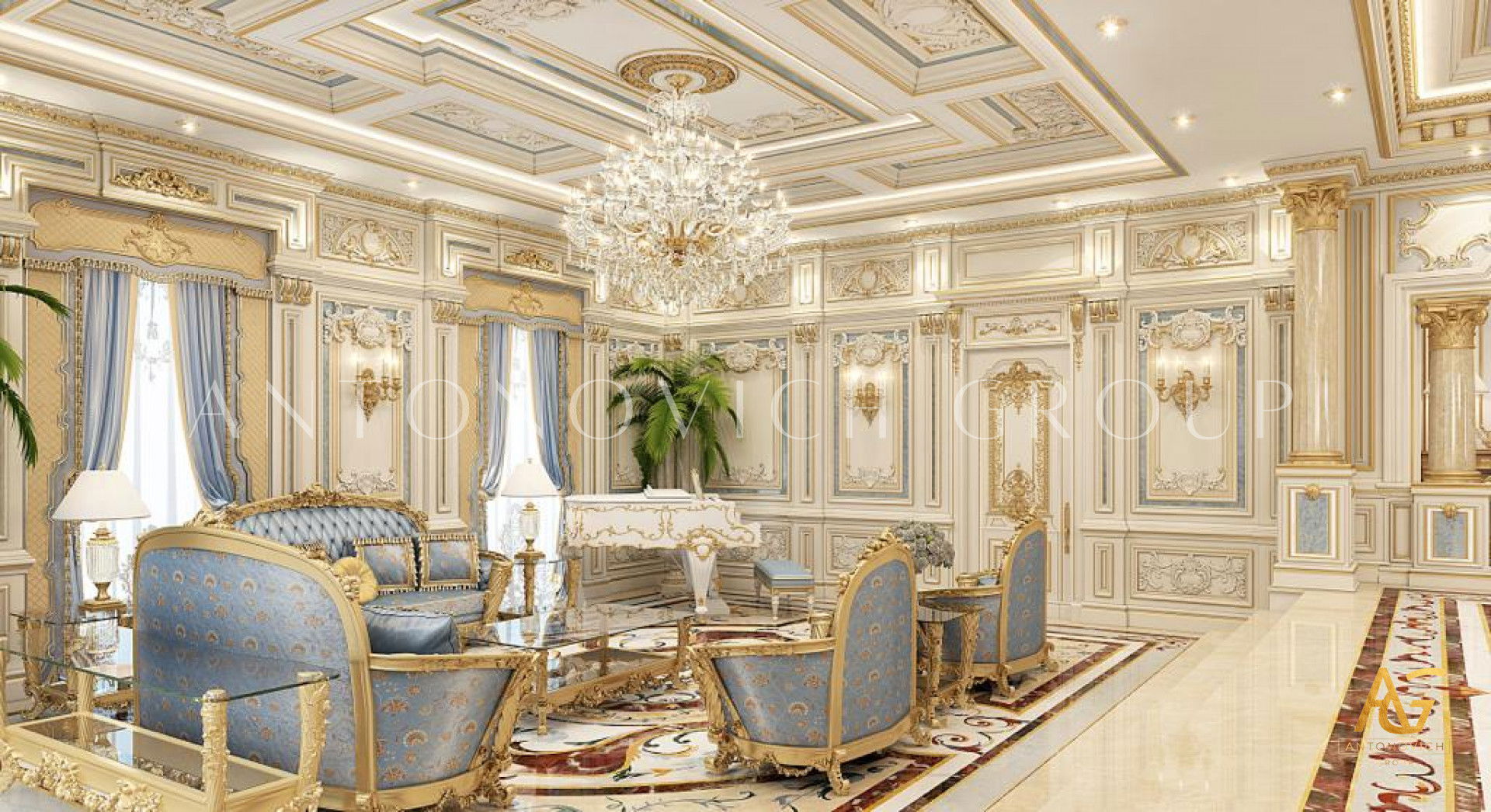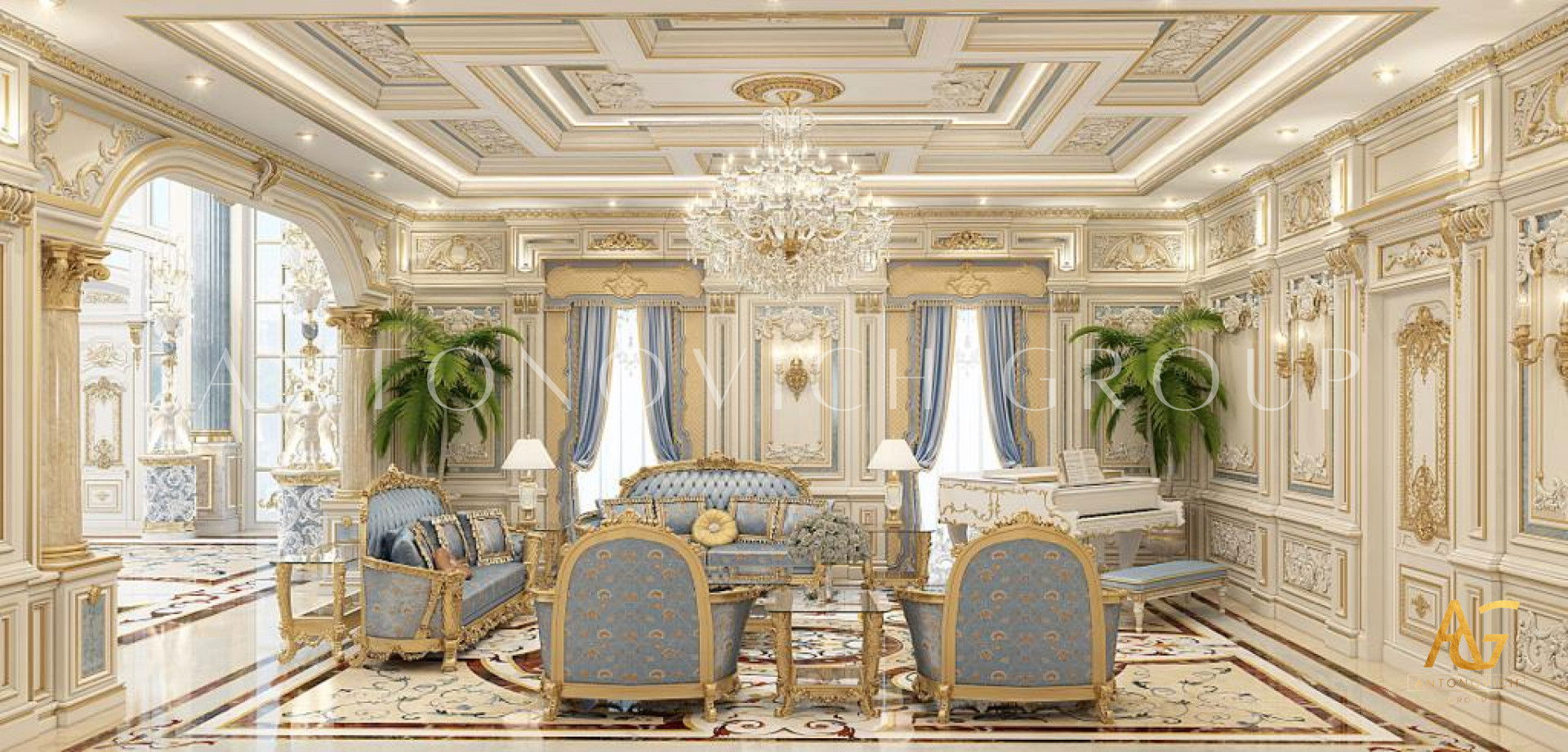 Со всех сторон этой роскошной гостиной проект дизайн интерьера в Китае включает широкий набор изысканной мебели. Шанхайские студии дизайна и Антонович Дизайн (Antonovich Design), авторы этого шедевра, создали впечатляющий проект: роскошный дизайн гостиной в Китае, большой и эффектный. В потолке размещена впечатляющая композиция, усиливающая величие интерьера. Холодная и благородная концепция выполнена в сильно абстрактной форме, добавляя пространству интригу. Каждая деталь, даже редко заметная, выполнена с тщательной проработкой, что видно по изящным формам и планировке. Для люксовой дизайн в Китае удачно сочетаются золотые и серые тона. Для придания интерьеру тёплой роскоши использован коричневый цвет. Каждая часть комнаты обладает точно выверенной харизмой и притягательностью; сочетание кремового и коричневого критично для создания приятной атмосферы.