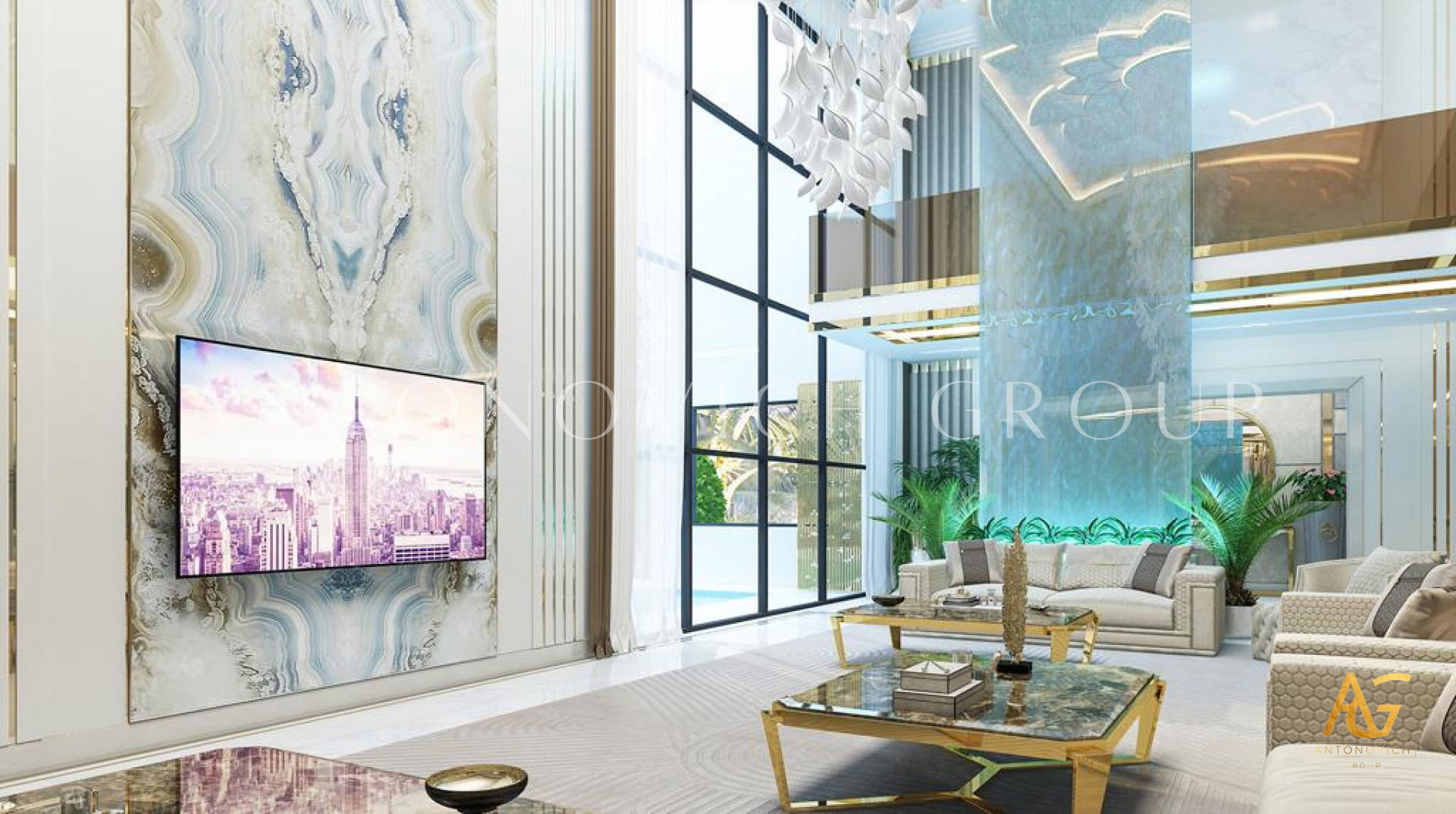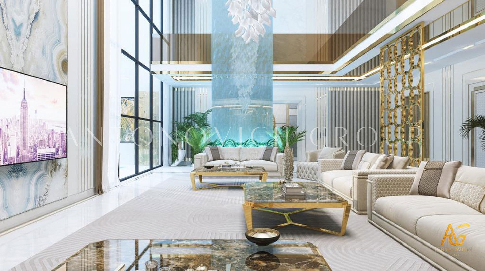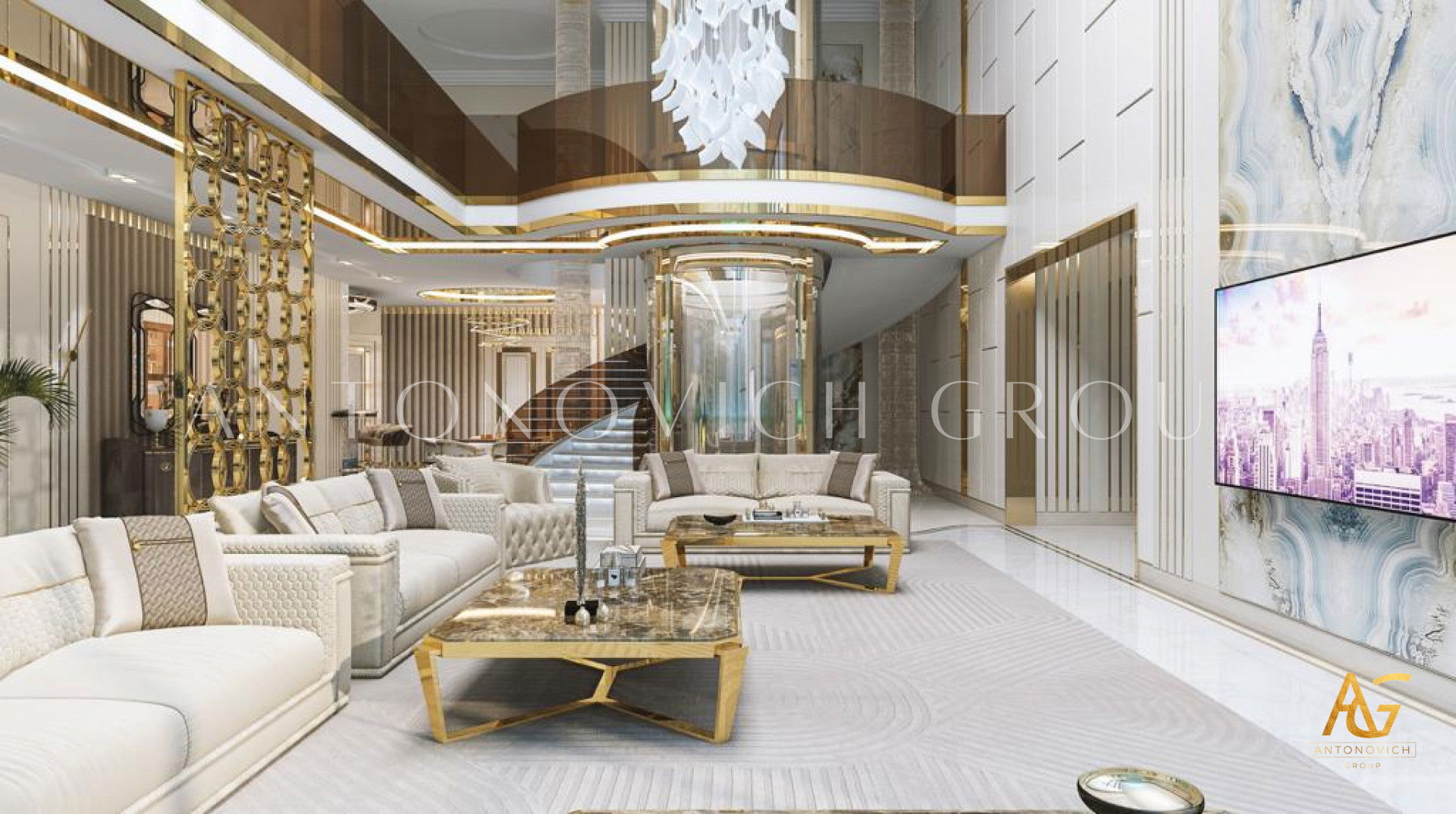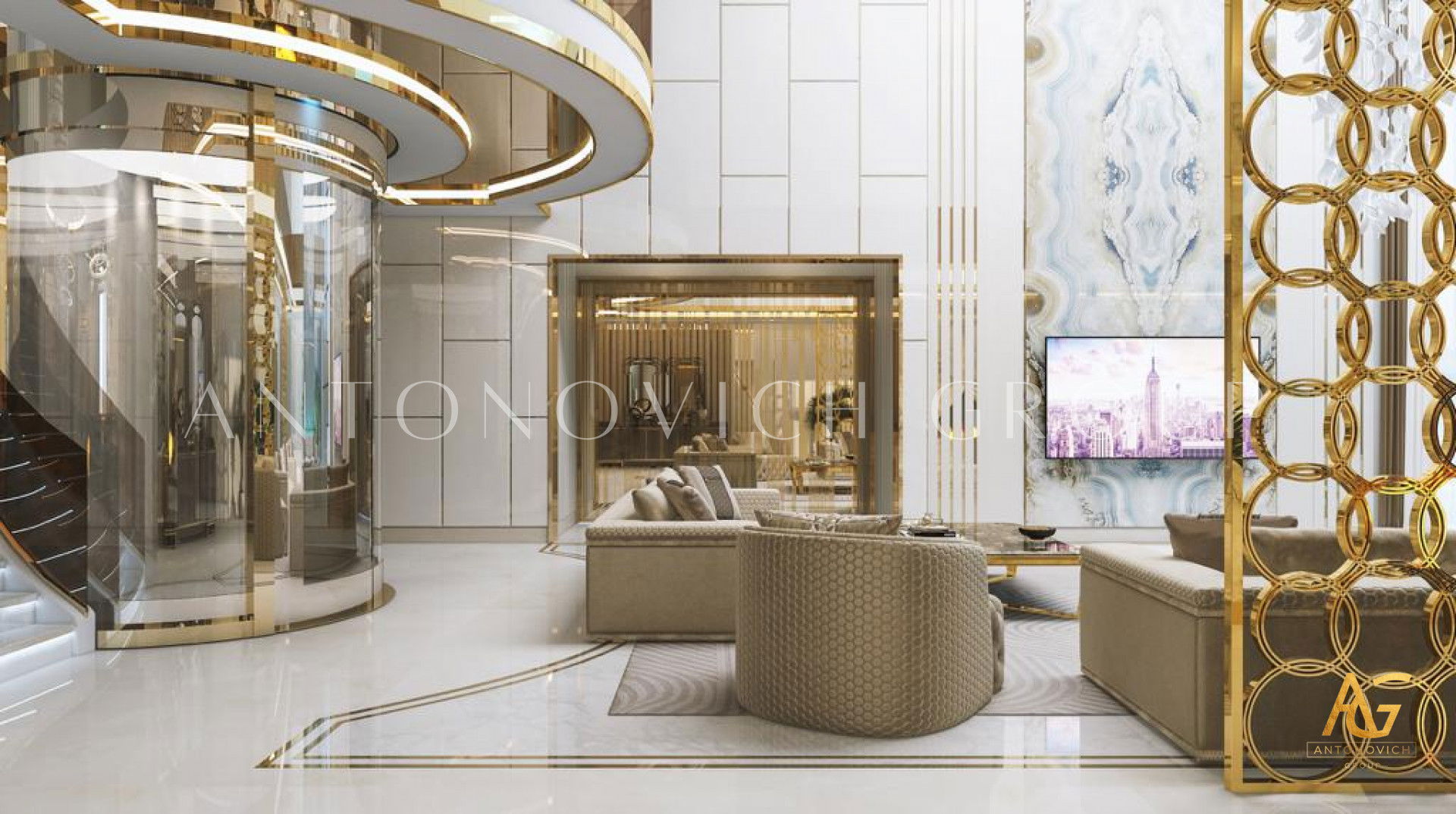 Ежедневно высокий потолок с большим стеклянным окном формирует умиротворяющую атмосферу. При создании роскошной гостиной важна продуманная планировка и расстановка мебели в гостиной; это определяет функциональность и визуальную гармонию. Шаблон и компоновка этого помещения от Антонович Дизайн подходят для любого вкуса и представляют собой идеальную основу для самых взыскательных жителей города. Изящные линии, направленные в разных направлениях, и блеск золотых акцентов в интерьере составляют поразительную деталировку. Этот творческий интерьер гостиной в бразильском доме включает все необходимые элементы для комфортного и роскошного отдыха.