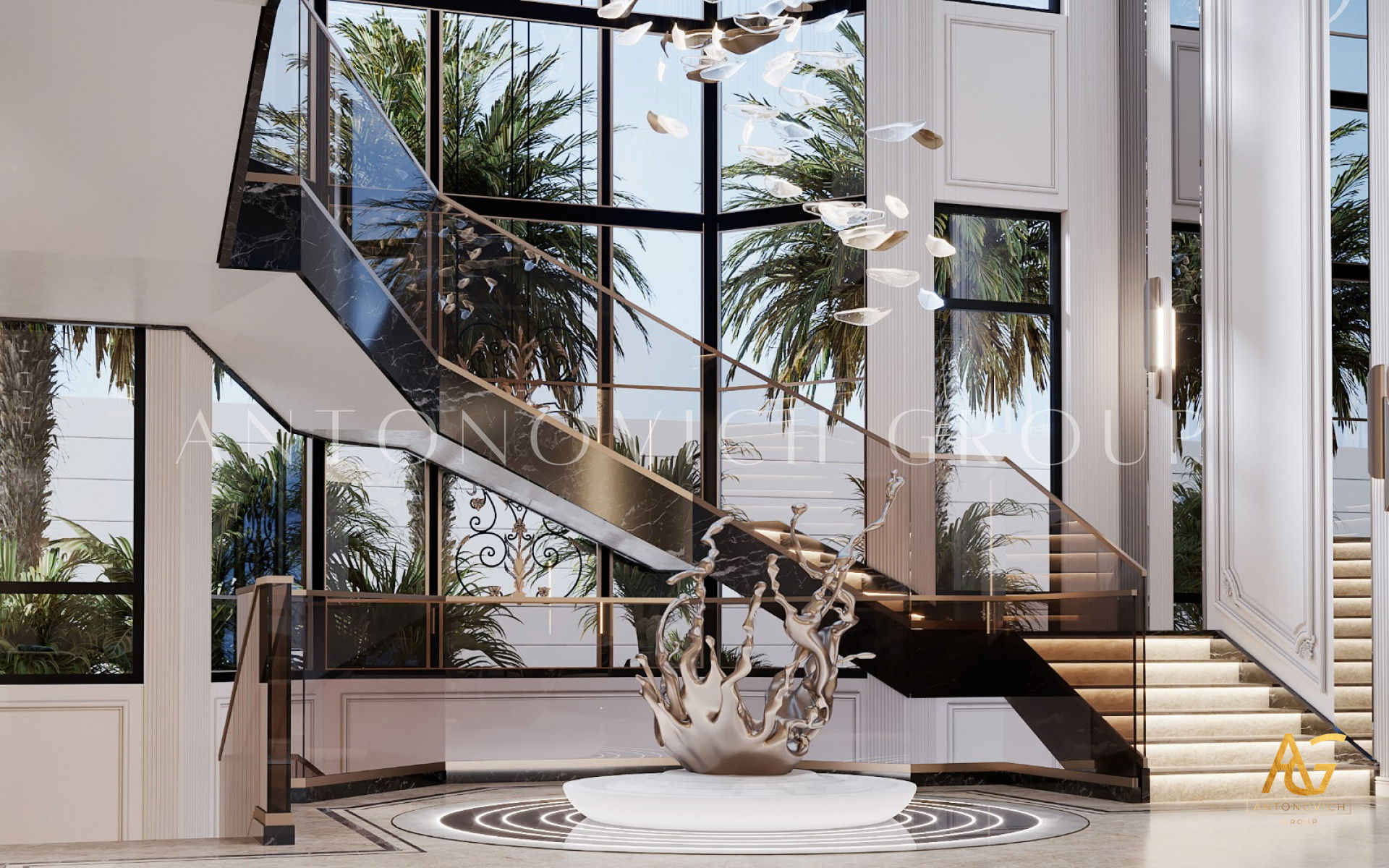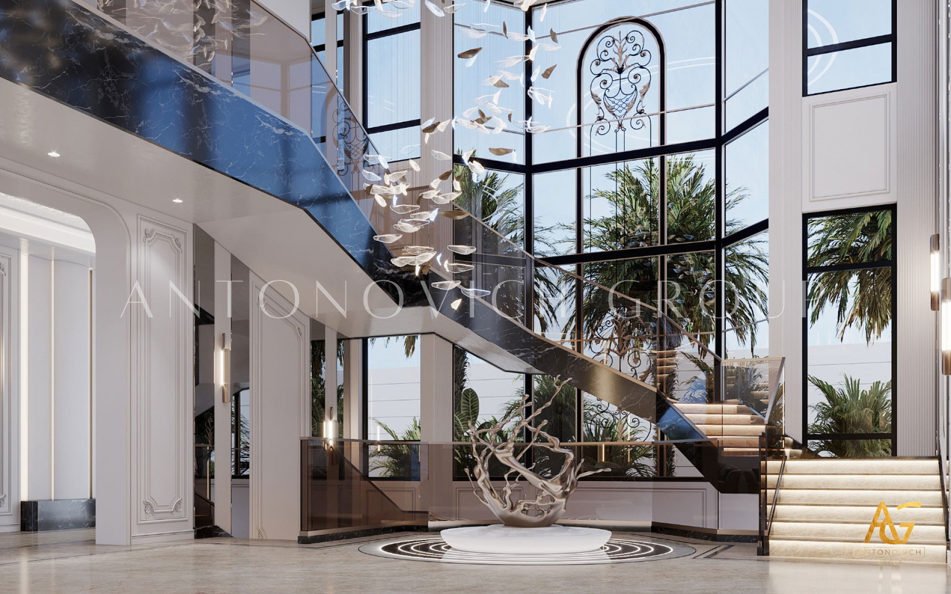 Антонович Дизайн понимает, что прихожая — больше чем проход: это определяющий элемент роскошного жилья. Команда реализует роскошный дизайн прихожей виллы с авторской мебелью и продуманной палитрой, предлагая индивидуальный дизайн фойе для виллы, который подчёркивает характер владельца.