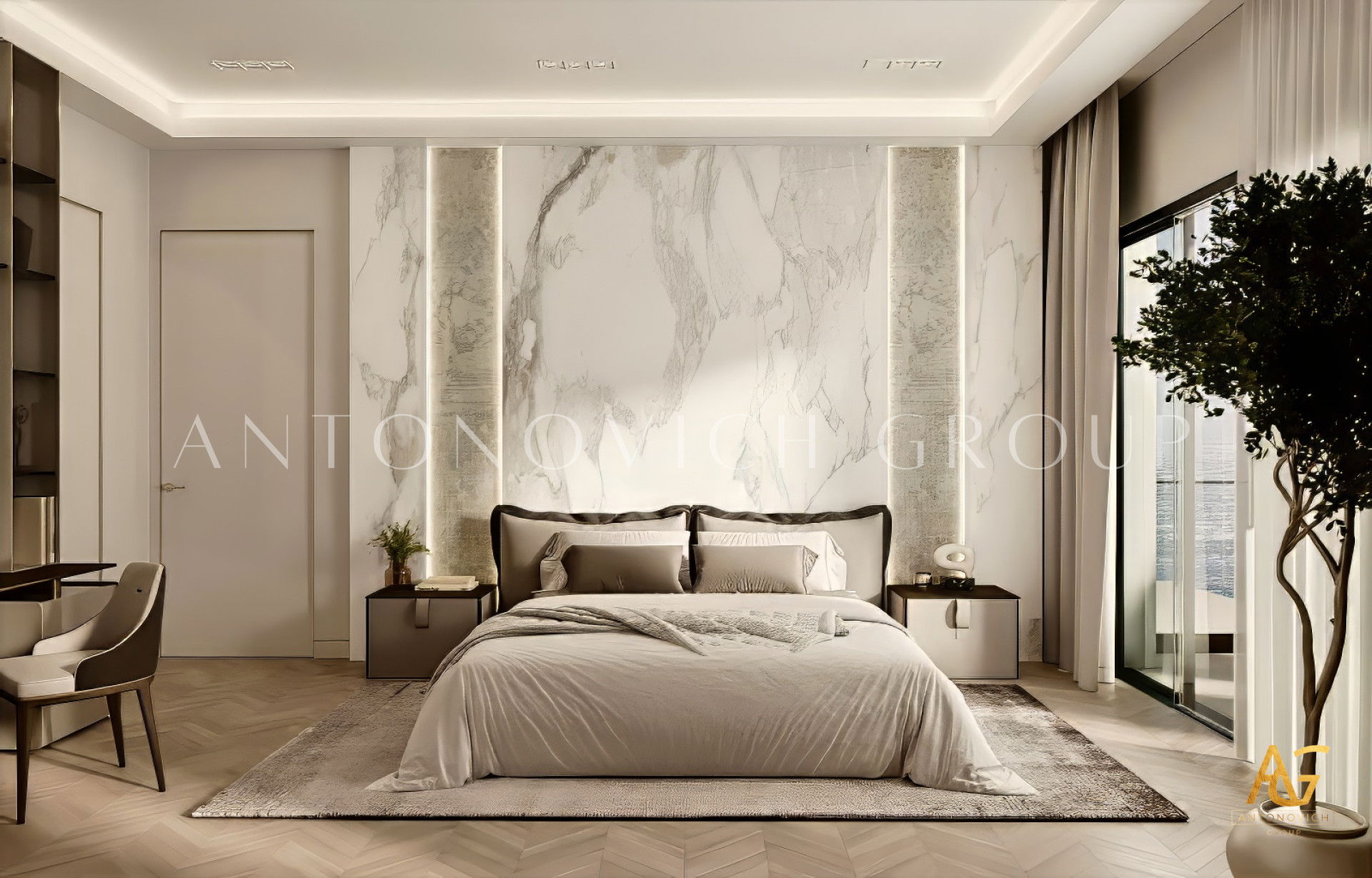 Отделка стен в роскошной спальне должна быть тщательной — штукатурка, декоративные панели или тканевые обои. Для пола выбирайте натуральные материалы: отделка пола для люксовой спальни часто предусматривает инкрустации или каменную плитку.