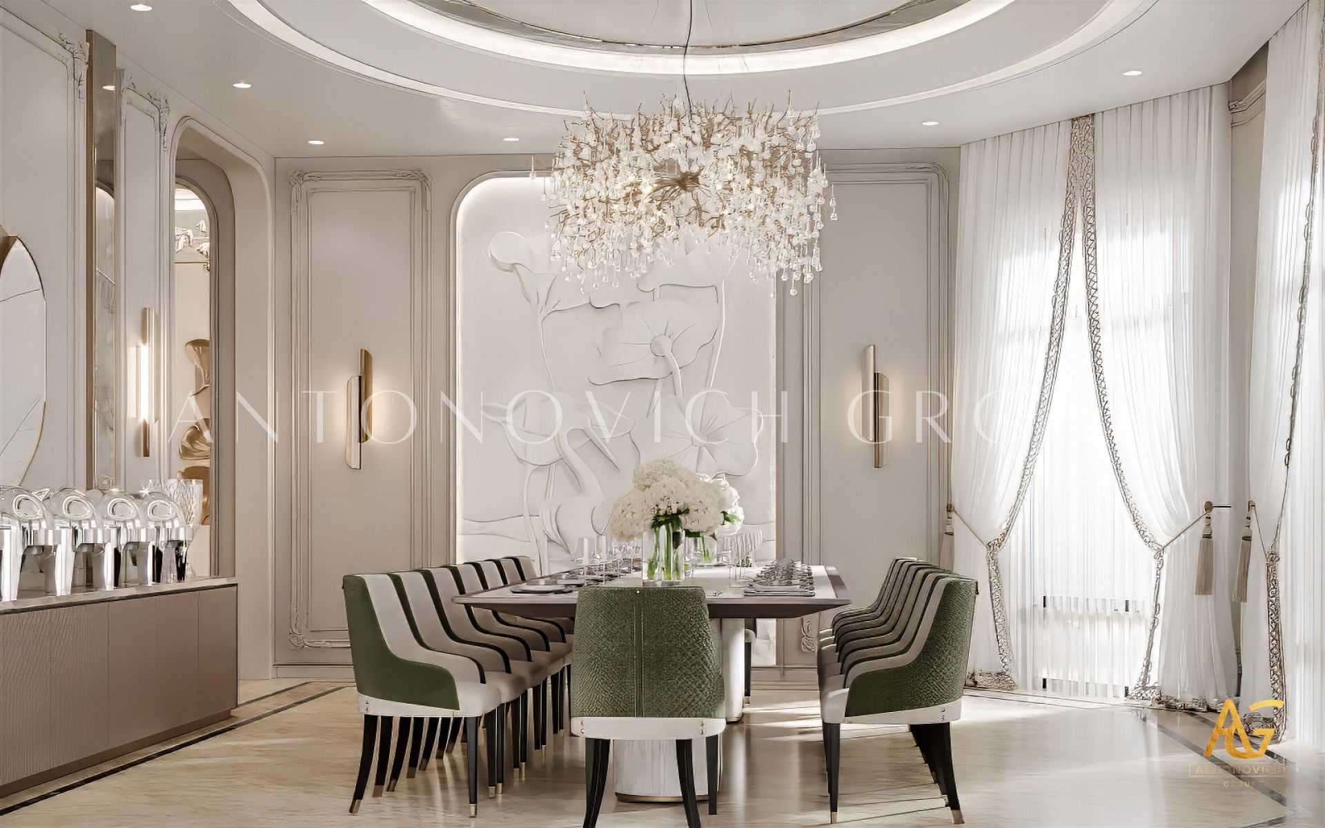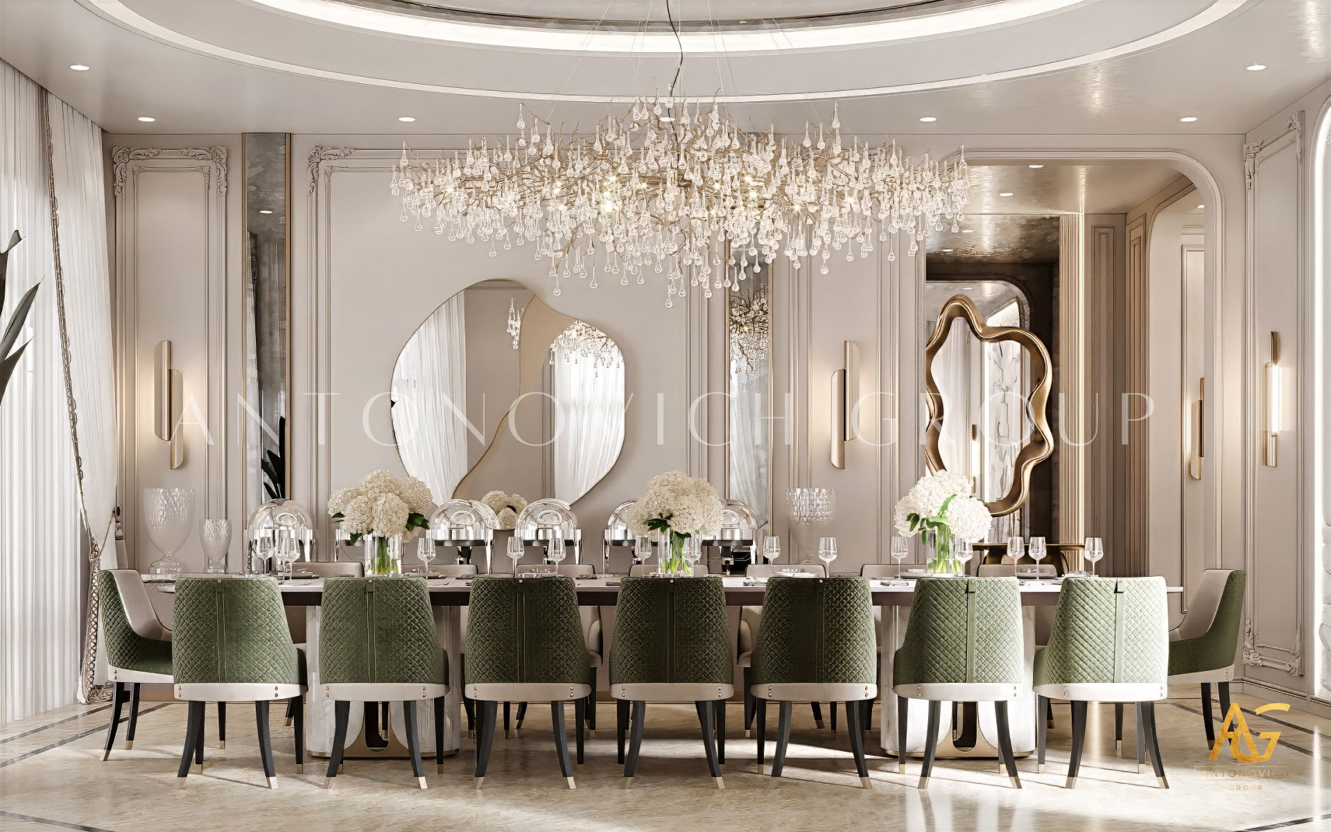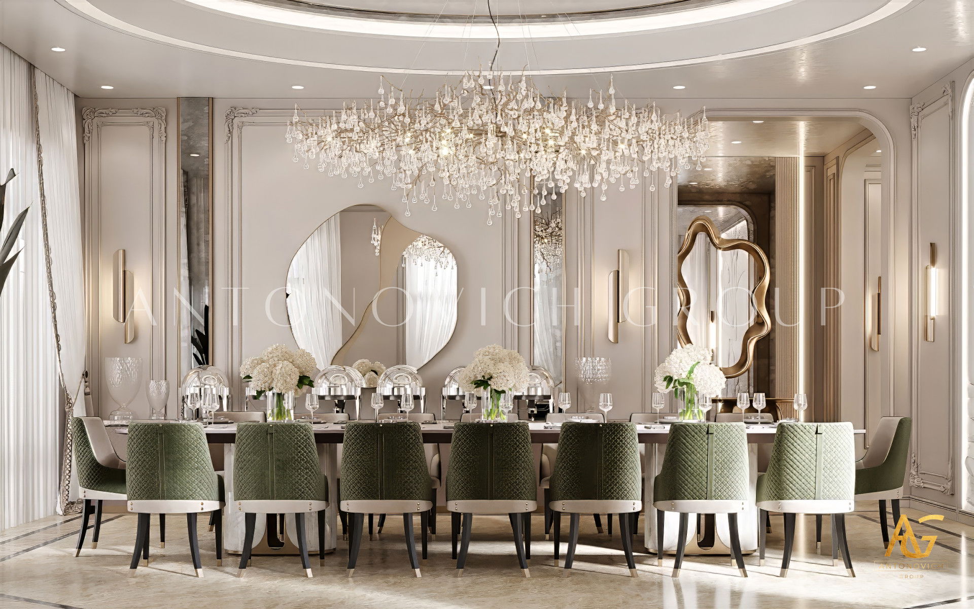 Каждый проект отражает характер его клиента. Архитектурно‑дизайнерская компания Антонович Дизайн (Antonovich Design) создаёт проекты со вкусом и желанием, формирует комфорт и наполняет их жизнью. Частичка души дизайнера присутствует в каждом интерьере. Для создания высокоуровневого дизайна — арабская столовая в стиле люкс — высококлассные специалисты студии используют только натуральные материалы: дерево, металл, мрамор. Натуральные материалы в интерьере столовой подчёркивают тепло и статус пространства. Весь проект выполнен в современном стиле, при этом всё выглядит элегантно, гармонично и красиво. Современные идеи для столовой и гармоничные цветовые сочетания интерьера превращают обеденную комнату в прекрасное место для отдыха и расслабления. В результате появляется комфортная обеденная зона для дома, где можно не только наслаждаться трапезой, но и провести время за чашкой чая или кофе. Дизайн-студии в Дубае предлагают только самые модные решения, которыми можно гордиться. Самые известные и опытные профессионалы студии Антонович Дизайн уделили особое внимание оформлению стен. Викторианская лепнина в интерьере столовой и французская лепнина в столовой невероятно украшают помещение — это придаёт столовой особое очарование и элегантность. Текучие линии узоров подчёркивают утончённый вкус владельцев. Мраморный пол в столовой, как завершающий штрих, подчёркивает солидность и статус хозяев дома. Обеспечен абсолютный комфорт и превосходная гармония. Настоящие профессионалы знают, как превратить ваши мечты в реальность. Запросы на элитный интерьер столовой в Москве подтверждают востребованность таких решений.