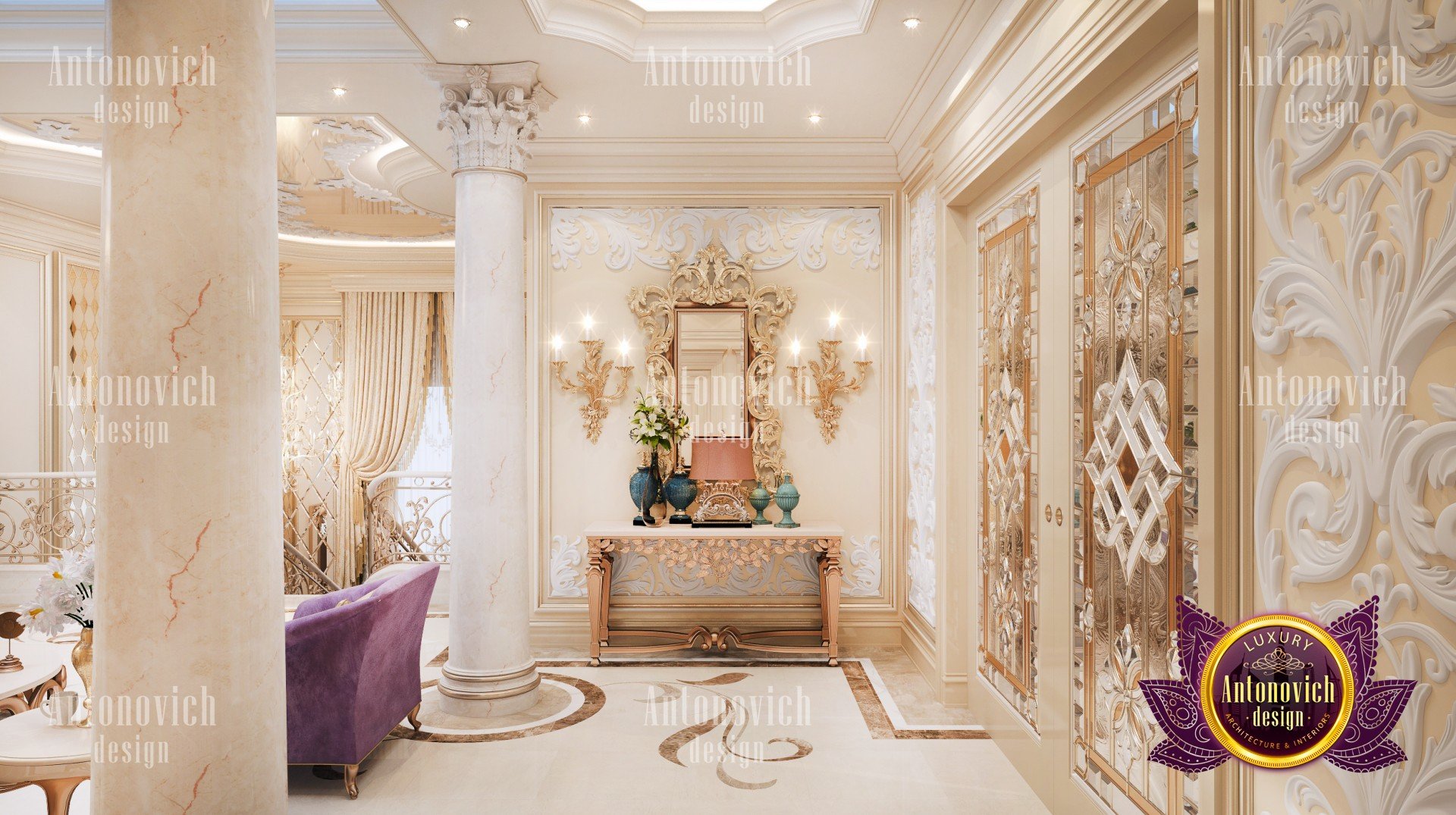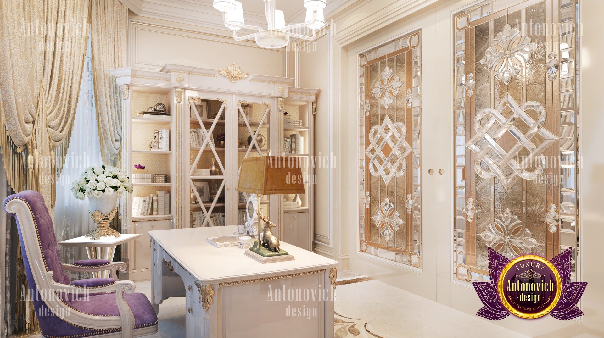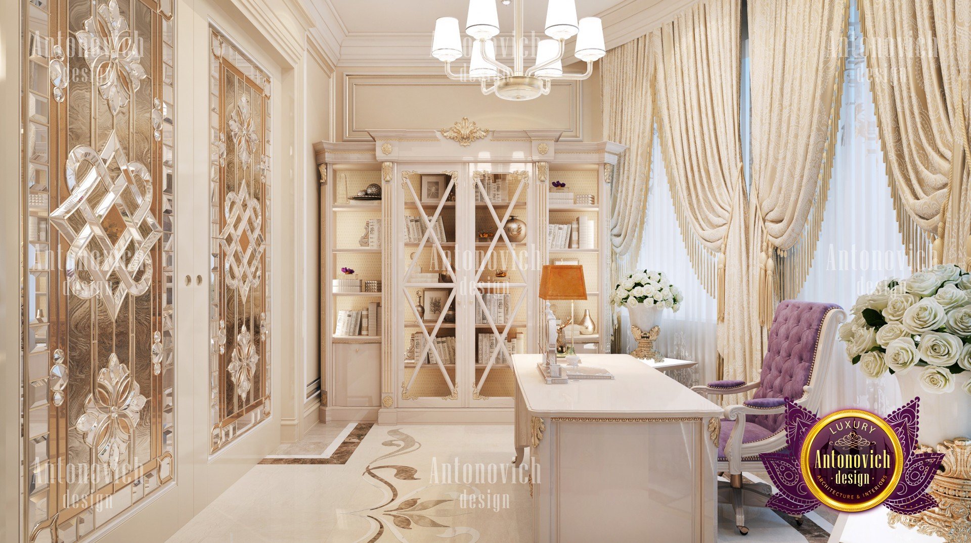 Всегда приятно иметь много пространства при создании интерьера, особенно когда речь идёт о роскошном кабинете. Проект демонстрирует роскошный кабинет как символ статуса. Этот аристократичный и элегантный кабинет в классическом стиле был создан ведущим дизайнером и архитектором Катрина Антонович (Katrina Antonovich) для проекта элитной виллы в Дубае. Владелец дома добился выдающихся успехов в бизнесе и посвящает любимому делу практически всё время, поэтому для него была спроектирована функциональная и уютная рабочая зона — домашний кабинет для работы. В основе красоты интерьера лежит натуральное темного дерева, которое оформляет стены по периметру: кабинет из ценных пород дерева органично сочетается с инкрустациями и резным декором. Автор проекта использует инкрустации и резной декор в виде мотивов Ампира, и именно такой подход — декор в стиле Ампир для кабинета — подчёркивает успех и достижения владельца. Отделка пола и потолка задаёт домашние акценты: паркет и мягкий ковёр в кабинете сочетаются с потолочной лепниной и небольшой нишевой конфигурацией. Традиционная люстра даёт основное освещение, дополняемое настольными лампами и бра — это и есть домашний рабочий кабинет с люстрой. Натуральный паркет прекрасно дополняет мягкие текстуры, а шторы из шелка для кабинета и мебель в изумрудной обивке создают глубокую и роскошную палитру. Такой интерьер роскошного кабинета гармоничен и сосредоточен на комфорте владельца, сочетая классику и высокий статус. Предложенный дизайн кабинета в Дубае демонстрирует, как дизайн кабинета из темного дерева выглядит в интерьере элитной виллы: интерьер элитной виллы в Дубае получает завершённый и представительный вид.