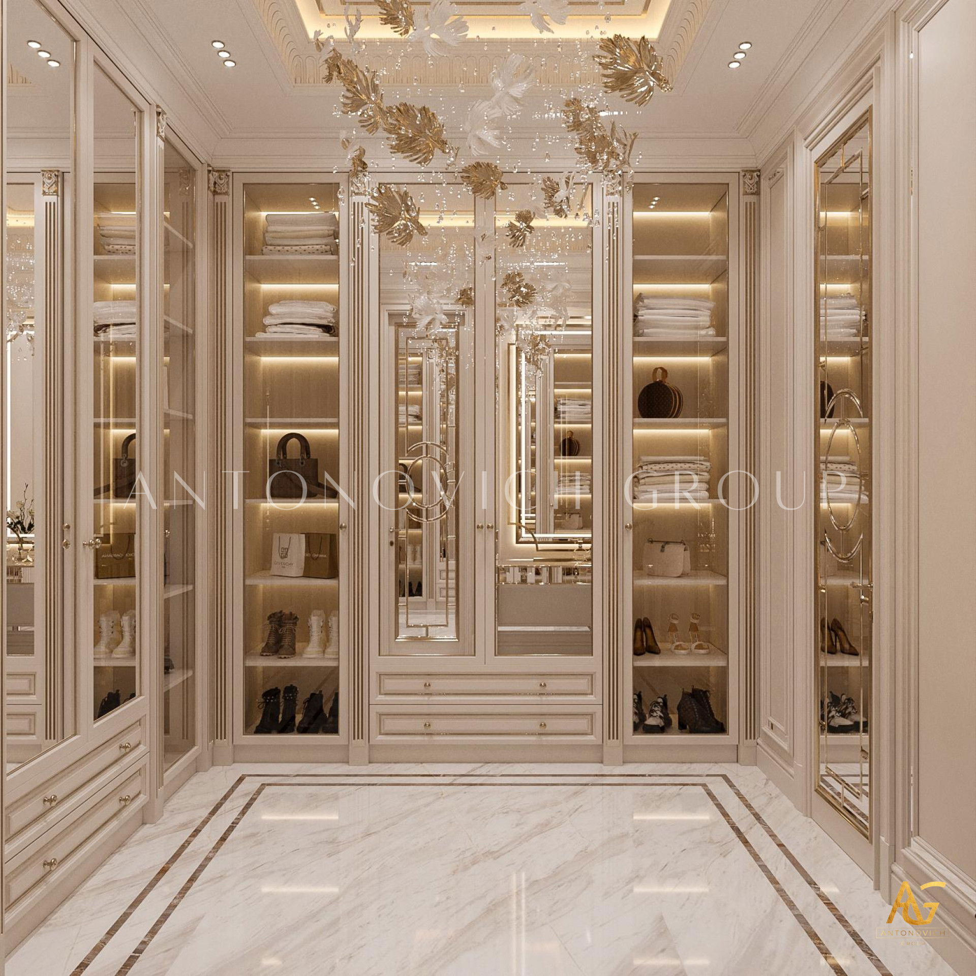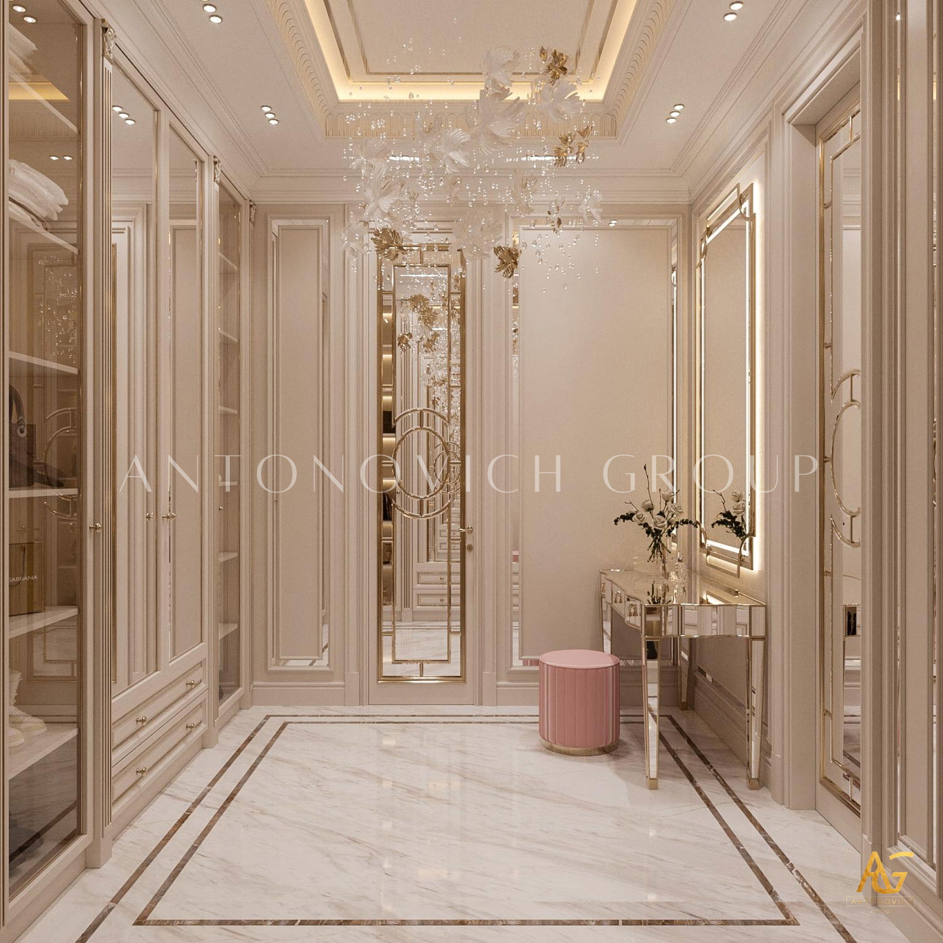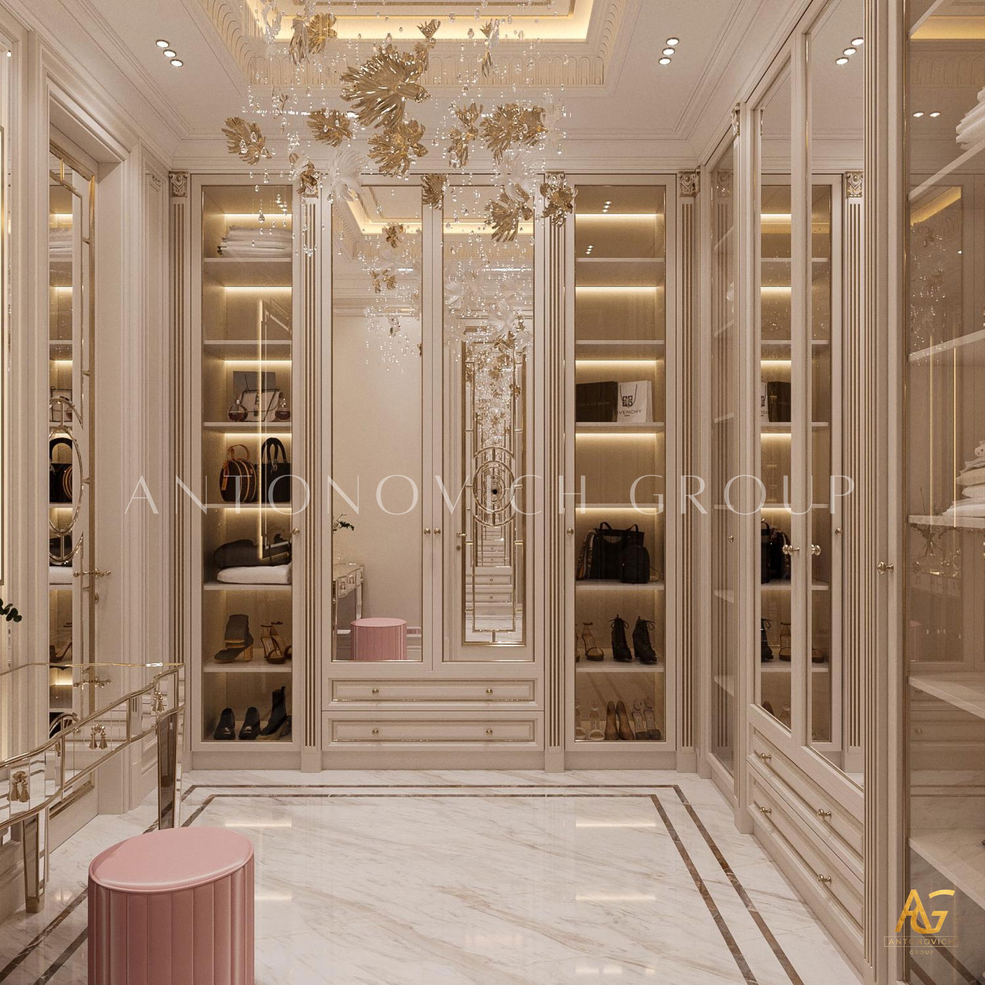 Яркий и стильный интерьер гардеробной в квартире подчёркивает вкус владельцев. Их утончённое чувство стиля и сотрудничество с дизайнерами интерьера из Дубая тонко перенесено в роскошный интерьер жилья. Для гардеробной выделено довольно большое пространство — гардеробная с большим окном. Окно декорировано шелковыми шторами фиолетового оттенка из мягчайшего бархата. Дизайн гардеробной отличается ярким характером с уютными акцентами — уютная гардеробная ощущается как продолжение дома. Деревянный пол в гардеробной из ценных пород древесины со специальной пропиткой поддерживает атмосферу домашнего тепла. Потолок украшен люстрами и элегантной лепниной — люстры и лепнина в интерьере задают торжественный тон. Для хранения мелких аксессуаров и украшений дизайнеры интерьера из Дубая предложили удобное решение — гардеробная с островом, оснащённая разнообразными ящиками и витриной для украшений. Такая роскошная гардеробная отвечает требованиям функциональности и эстетики. Подобные приёмы легко адаптировать для гардеробной в Москве. В оформлении использована деталь для демонстрации — комнаты, подчёркивающая акцент на материале и текстуре.