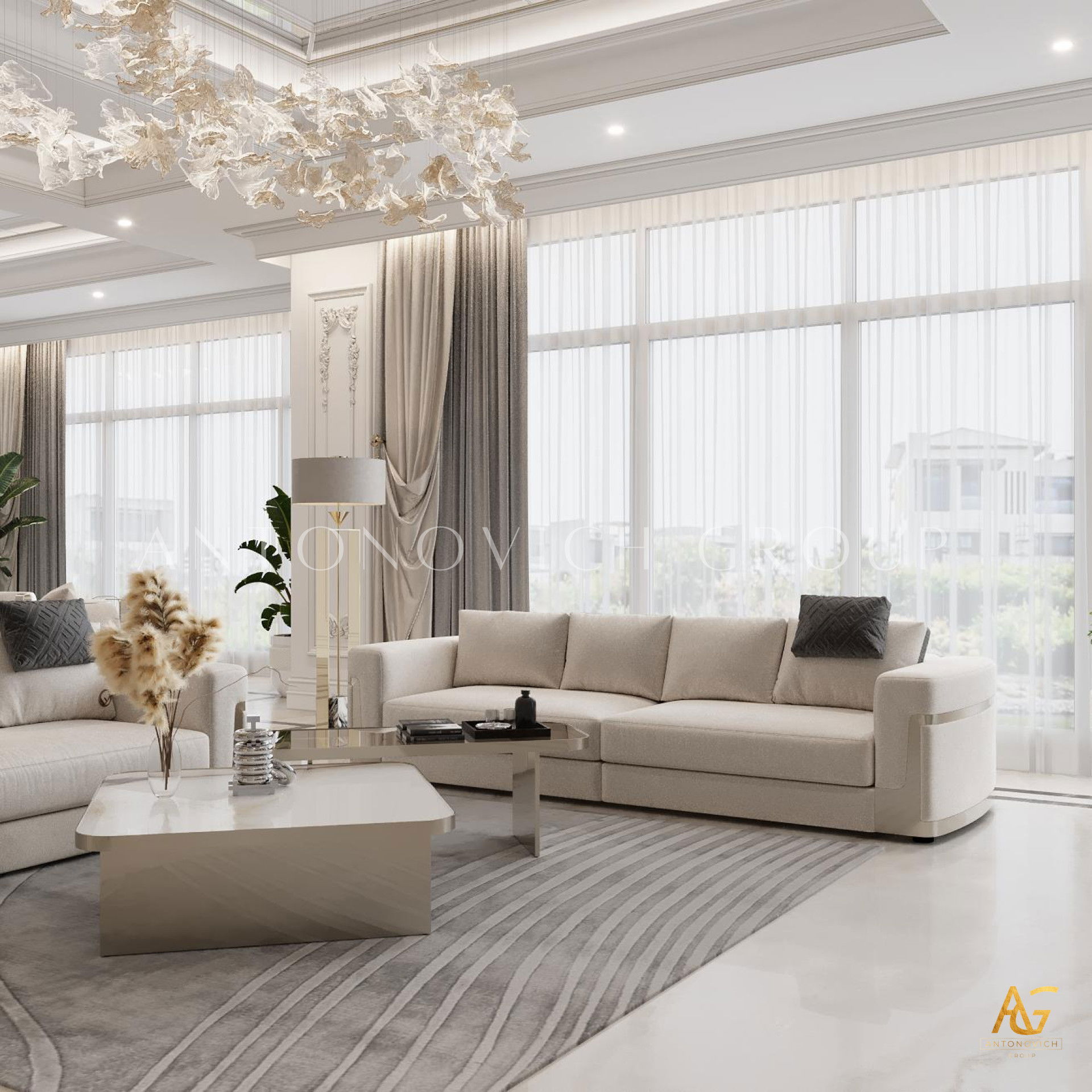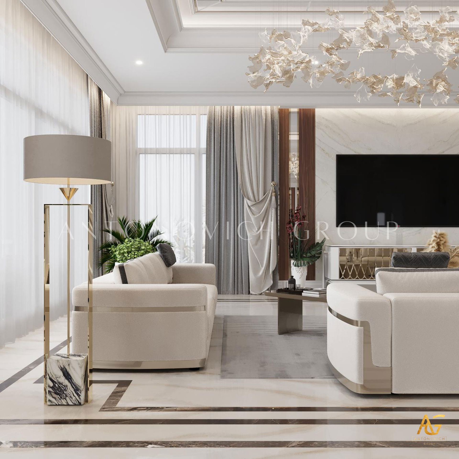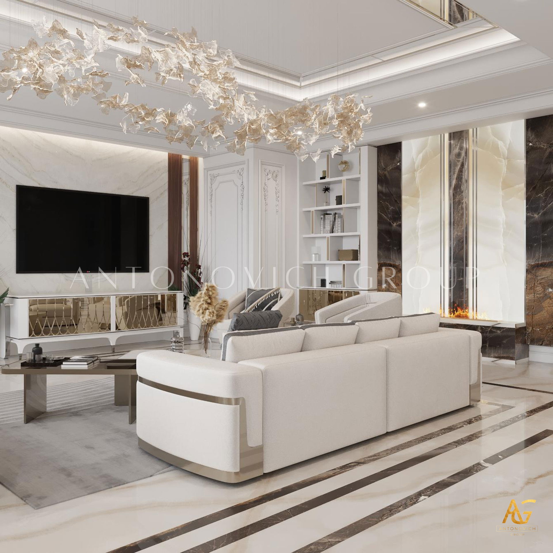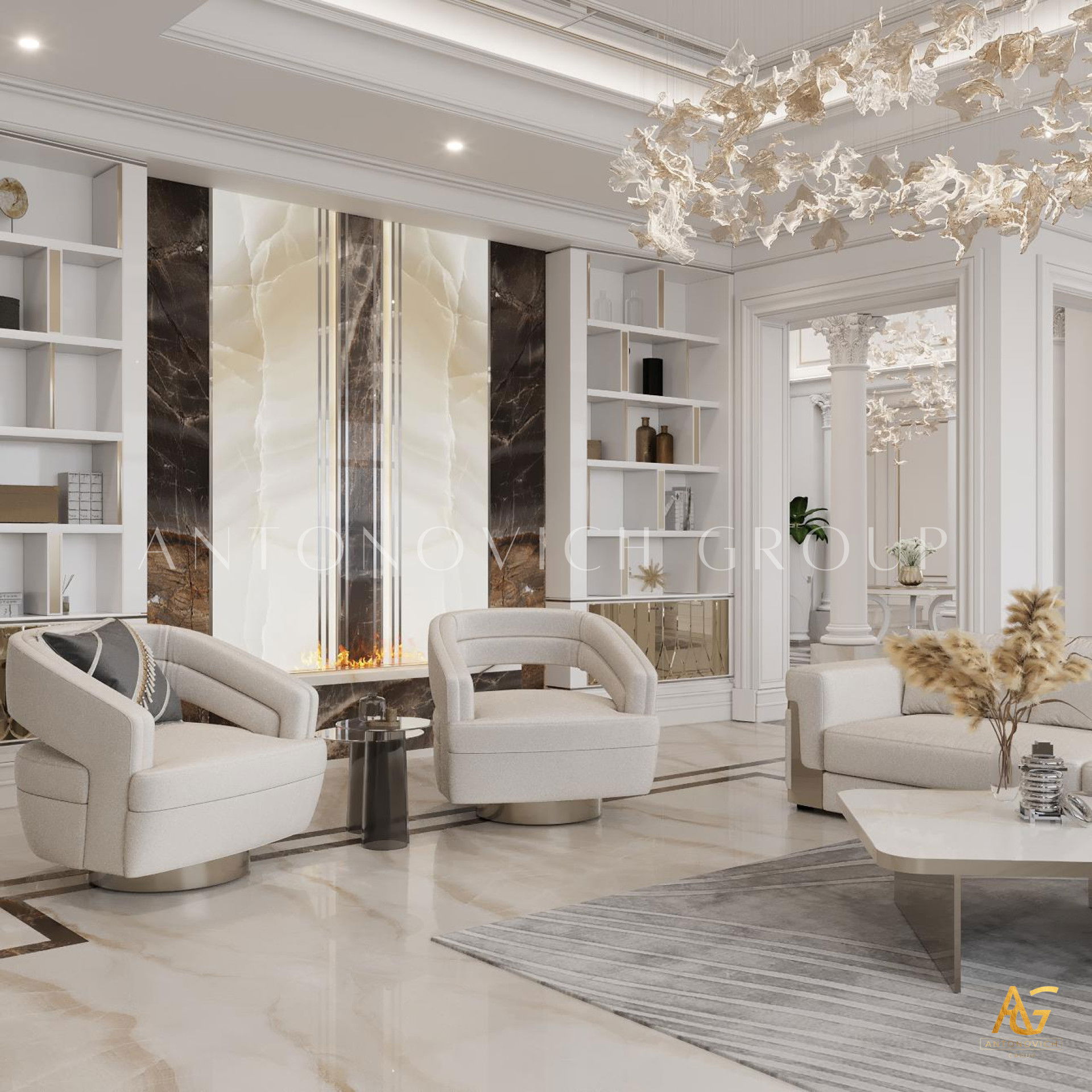 Идеи оформления гостиной в доме высшего класса точно отражают статус её владельца. Клиенты мечтали о семейном гнезде, которым можно гордиться не одному поколению. Современные интерьеры предполагают открытое пространство. Для этого дома дизайнеры студии Антонович Дизайн (Antonovich Design) предложили объединить зал и гостиную на первом этаже — решение, подчёркивающее открытый характер хозяев, их доброжелательность и гостеприимство. Это интерьер гостиной для приёма гостей. Достойно и благородно выглядит каждый квадратный сантиметр интерьера: гостиная с текстильной галереей оформления стала самым ярким акцентом. Шторы для гостиной из бархата благородного бордового оттенка декорируют большое окно и отсылают к великой традиции классического стиля; именно такие решения характерны для дизайн гостиной в классическом стиле. В оформлении окна использован мягкий ламбрекен и золотая бахрома в интерьере, а также декоративные подхваты. Отделка пола натуральным мрамором и мраморные панели для гостиной создают живописные панно из камня, к которым дизайнеры обращаются при разработке каждого проекта. Стены отделаны роскошной декоративной штукатуркой с матовым эффектом — декоративная штукатурка для гостиной выгодно подчёркивает мебель с резной отделкой для гостиной, обитую изысканными тканями с вышивкой. Потолок с нишей и лепниной в точной гармонии с зоной отдыха: очертания круглой ниши и лепнина перекликаются с резными мотивами на полу. Каждый элемент встраивается в общее настроение — праздничное, тёплое и приглашающее. Результат — роскошный дизайн гостиной, где роскошь сочетается с домашним комфортом, и в итоге получается уютная роскошная гостиная, готовая к самым торжественным встречам.