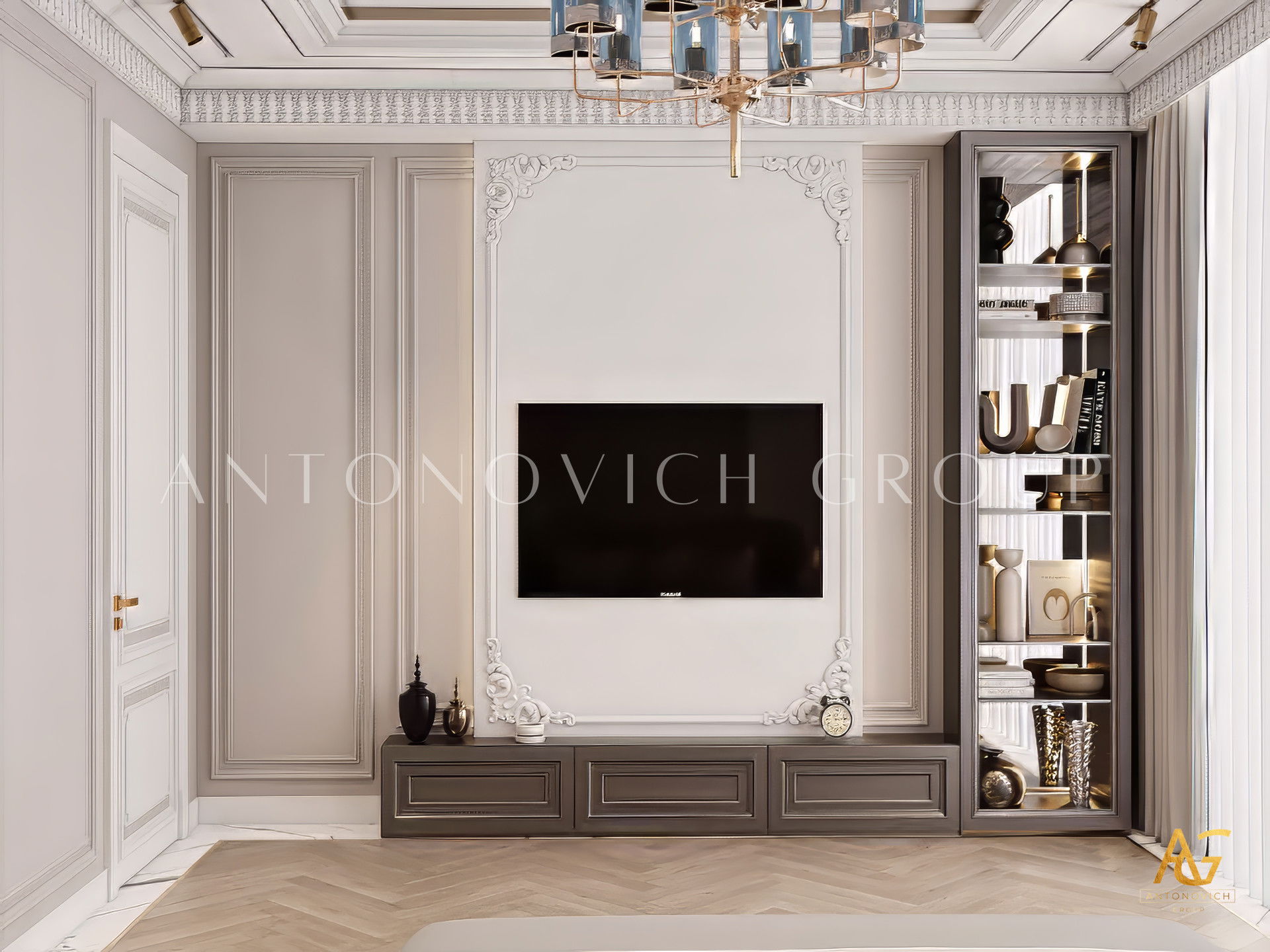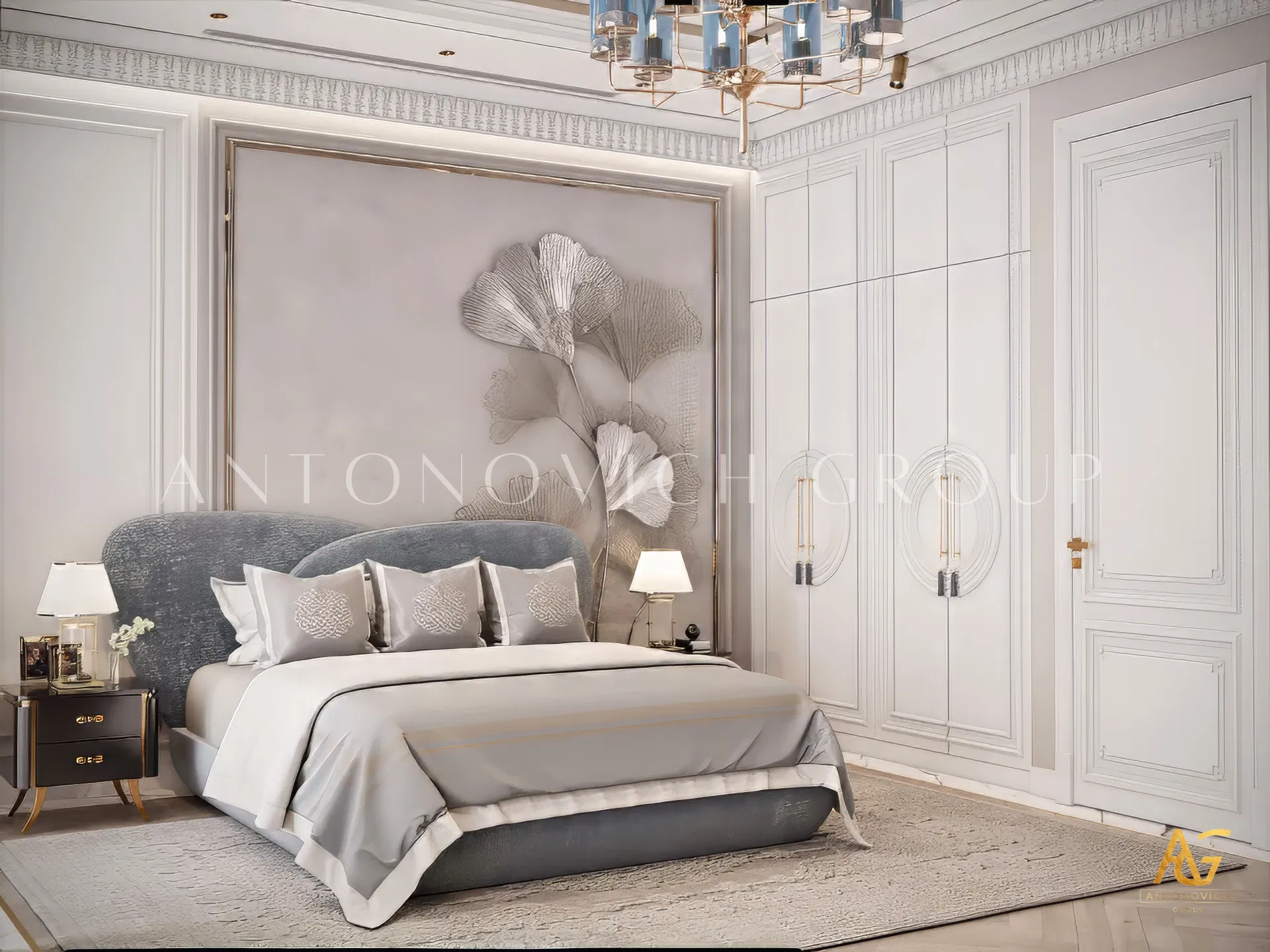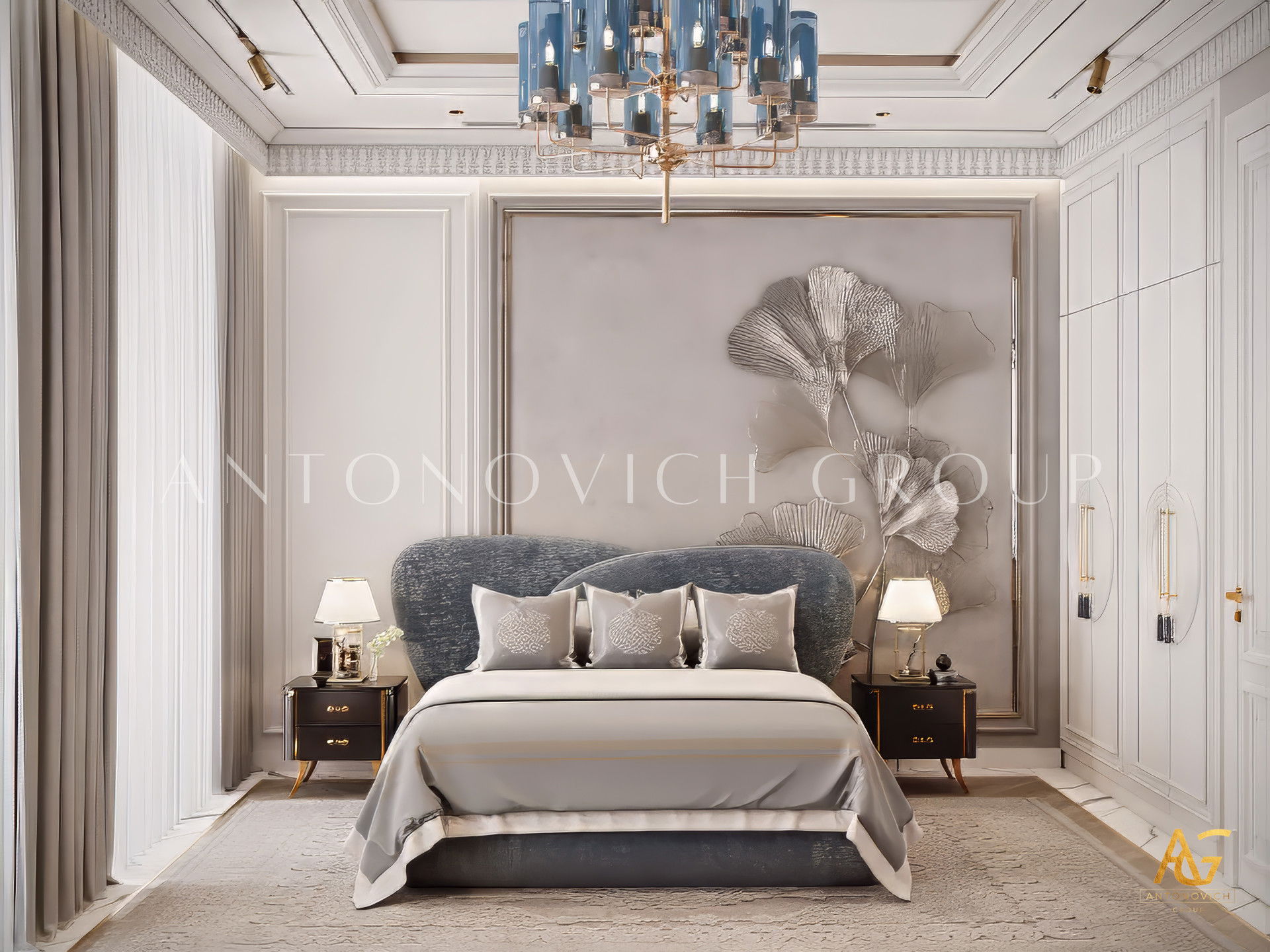 Дизайн спальни стал частью проекта элитного дома с тремя спальнями. Роскошная спальня с камином предназначена для владельцев дома. Интерьер спальни в пастельных тонах визуально расширил и без того просторную комнату, пастельная гамма светлых оттенков придаёт интерьеру ощущение уюта и тепла. Современный интерьер спальни дополнен аккуратными арт-деко акцентами; самым ярким элементом стала роскошная кровать с мягким высоким изголовьем, изголовье и подножие оформлены панелью из натуральной кожи кремового цвета. Большие ромбы придают особый шарм мебели спальни. дизайн спальни дарит приятные эмоции от чистых линий и идеальной геометрии пространства. Высокий снежно-белый потолок с нишей и хрусталем украшен большой хрустальной люстрой, и дизайнеры таким образом достигают объёмного эффекта и ощущения бесконечности роскошного пространства. В отделке стен доминирует элитная отделка стен с подсветкой и декоративные панели с латунным узором. Интерьер спальни в частном доме открывает большие возможности для творческой работы дизайнеров, ведь в таких домах площадь спальни обычно позволяет реализовать смелые идеи. Современный дизайн спальни для дома здесь включает технологичные решения, аккуратные декоративные панели и люксовую мягкую мебель. В проекте использованы: дизайн спальни, интерьер главной спальни, роскошная спальня с камином, интерьер спальни в пастельных тонах, мягкое высокое изголовье кровати, панель из натуральной кожи, элитная отделка стен с подсветкой, потолок с нишей и хрусталем, арт-деко акценты в спальне, современный дизайн спальни для дома, дизайн спальни в частном доме, люксовая мебель для спальни.