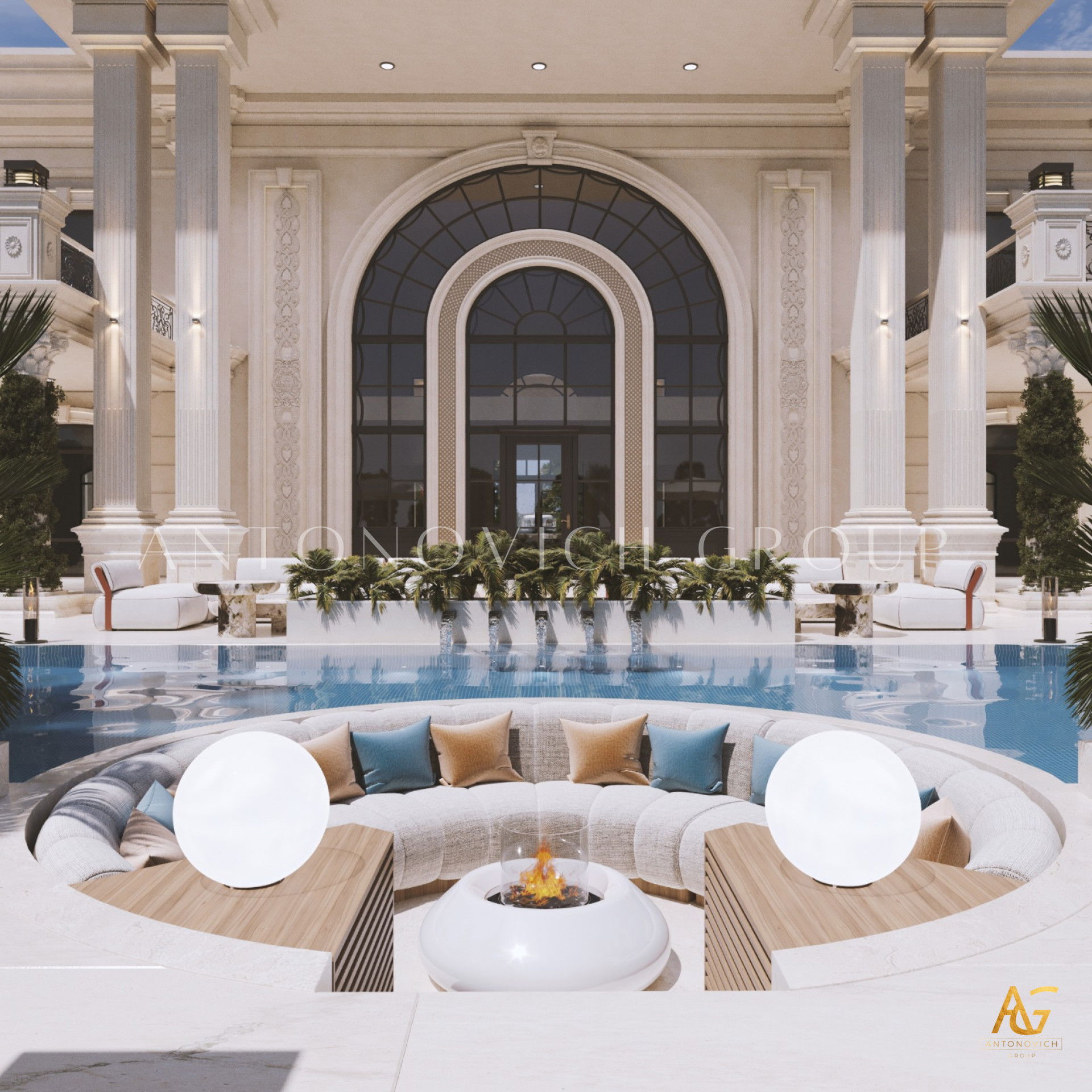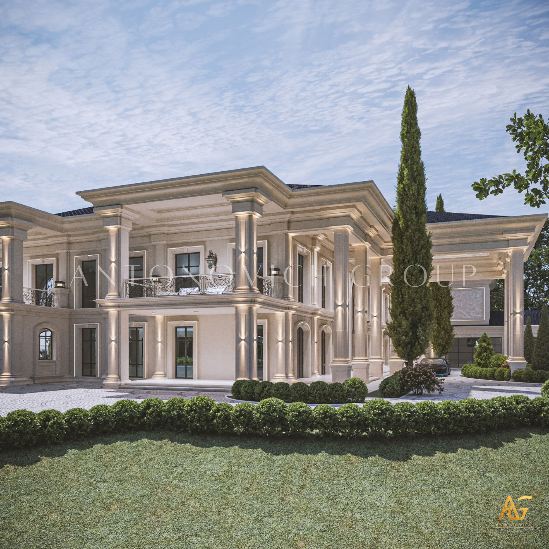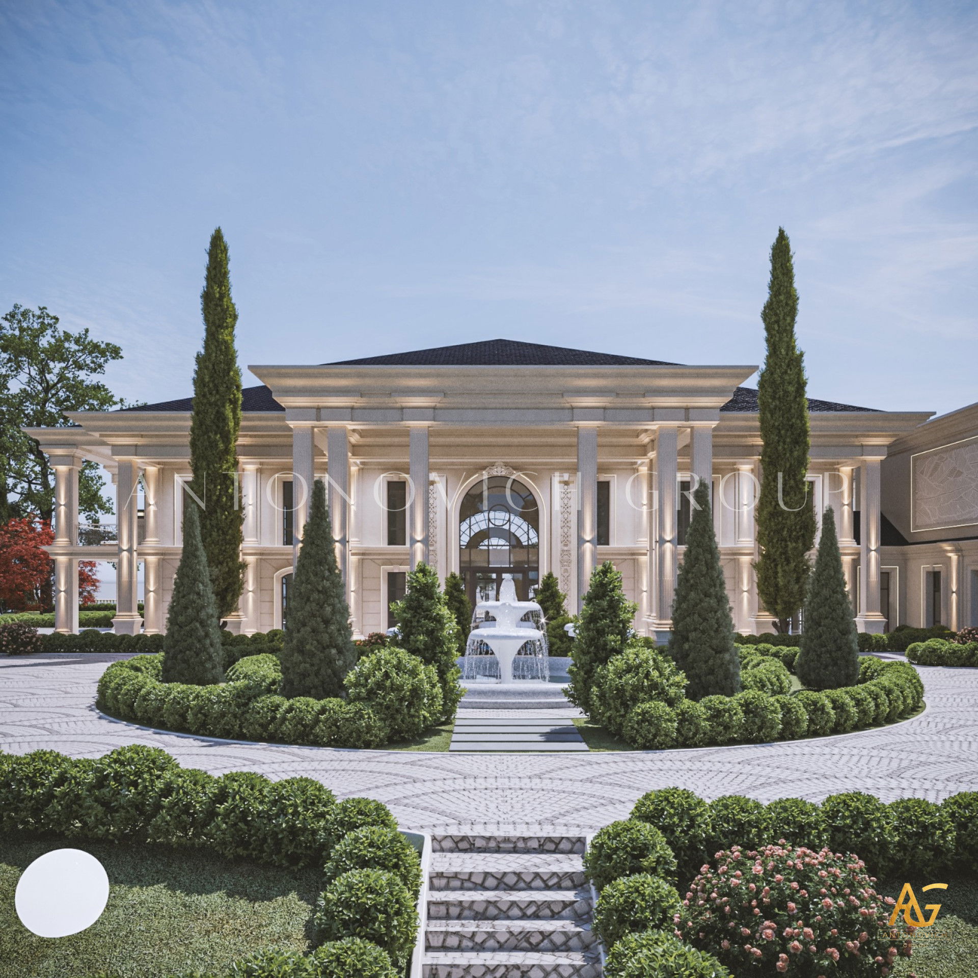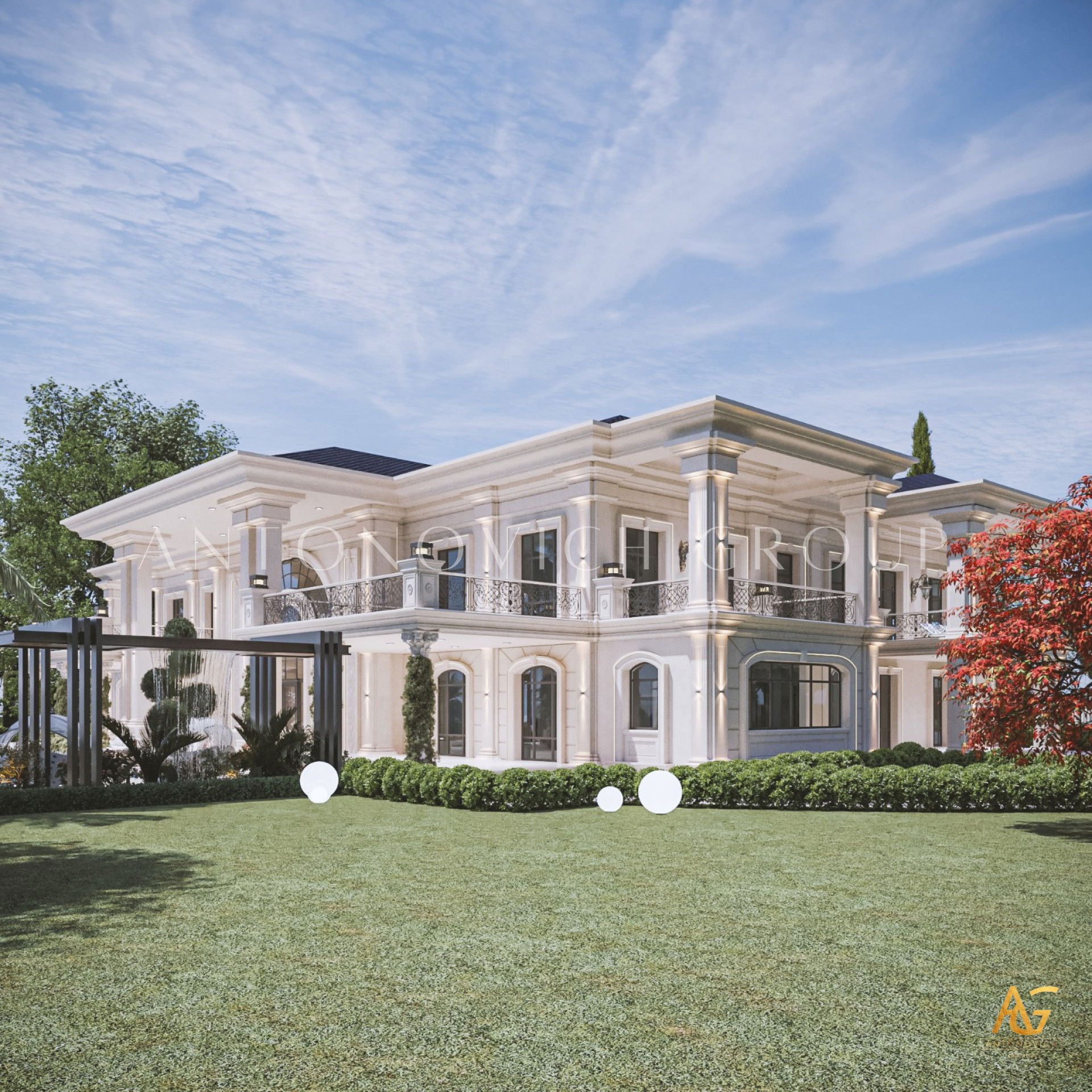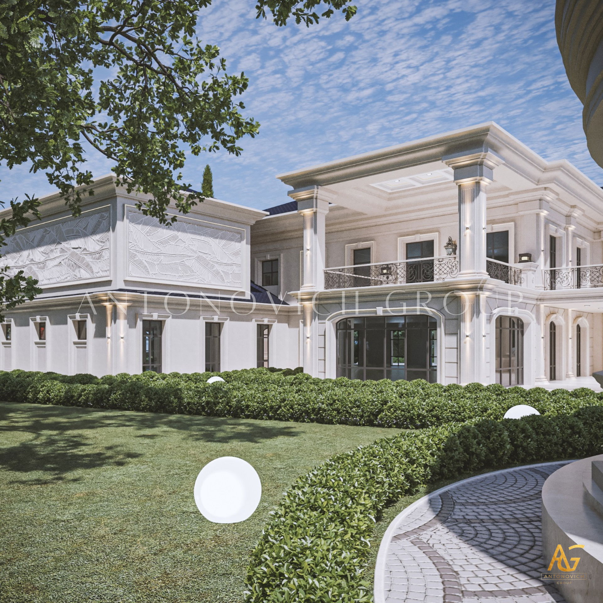 Планировочные решения дома от Антонович Дизайн (Antonovich Design) — идеальный баланс между внешним обликом и интерьером. Дизайн экстерьера в классическом стиле — многоаспектный процесс, включающий несколько этапов. Первое, что привлекает внимание в этом проекте — великолепные въездные ворота. Ворота украшены позолоченными коваными элементами, это кованые ворота с гербом. Семейный герб стал частью декора ворот: создание такого семейного знака всё чаще встречается в элитных проектах. Оформление фасада и ворот выполнено в едином решении: яркие фасады домов в классическом стиле элегантно контрастируют с тёмно‑зелёными многощипцовыми крышами. В лучших традициях классики дом украшен изящными колоннами с лепниной, пилястрами, формованными карнизами и фронтонами — здесь проявлен фасадный декор с лепниной и пилястрами. Ландшафтный дизайн для виллы продолжает образ элегантного строения: проект экстерьера загородного дома включает продуманное озеленение. Озеленение участка многолетниками и хвойными подчеркнуто в планировке, а проектирование экстерьера и ландшафта учитывает зоны для отдыха. Очаровательным элементом для комфортного отдыха на открытом воздухе стала круглая беседка с купольной крышей и колоннами. Внутри предусмотрена большая терраса с панорамными окнами во всю высоту стен. Роскошный и благородный облик дома — идеальное воплощение классического стиля, при этом это пример индивидуального экстерьера для виллы.