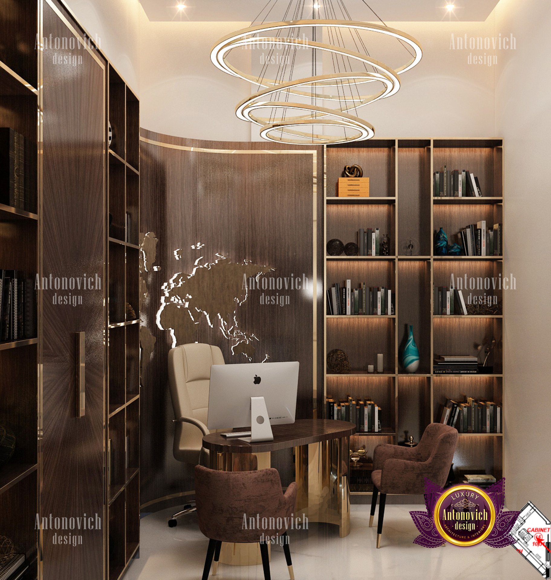 Ключевые характеристики: дизайнерский домашний кабинет, роскошный домашний кабинет, современный рабочий кабинет дома, домашний офис в коричневых тонах, мебель для домашнего кабинета, освещение для рабочего кабинета, эргономичный офисный стул, полки и стеллажи для кабинета, спокойная атмосфера в кабинете, дизайн домашнего офиса Москва.
