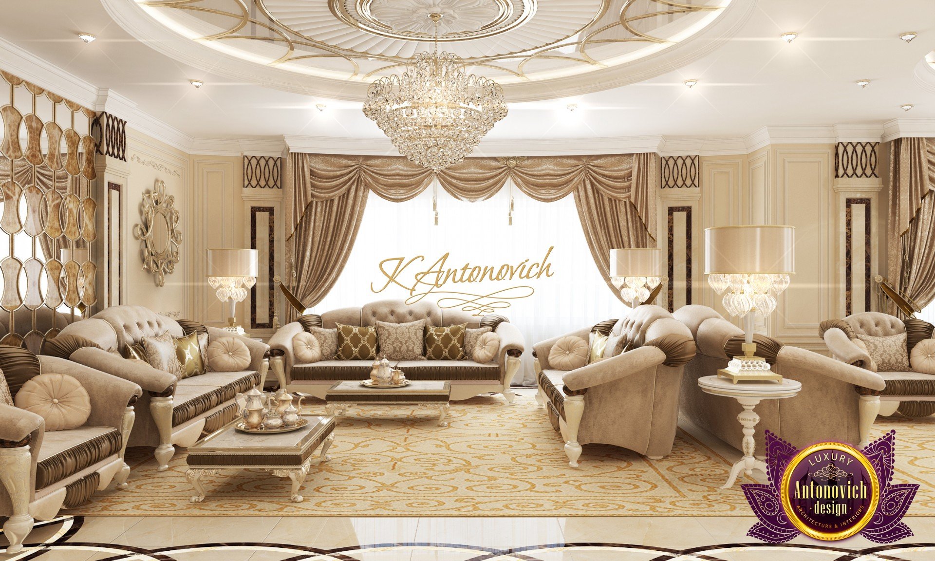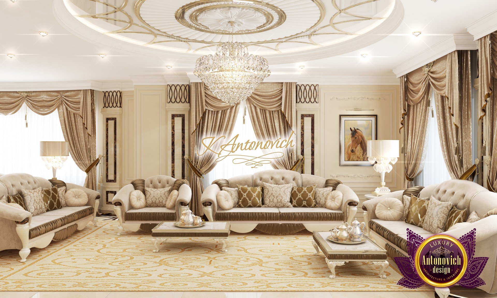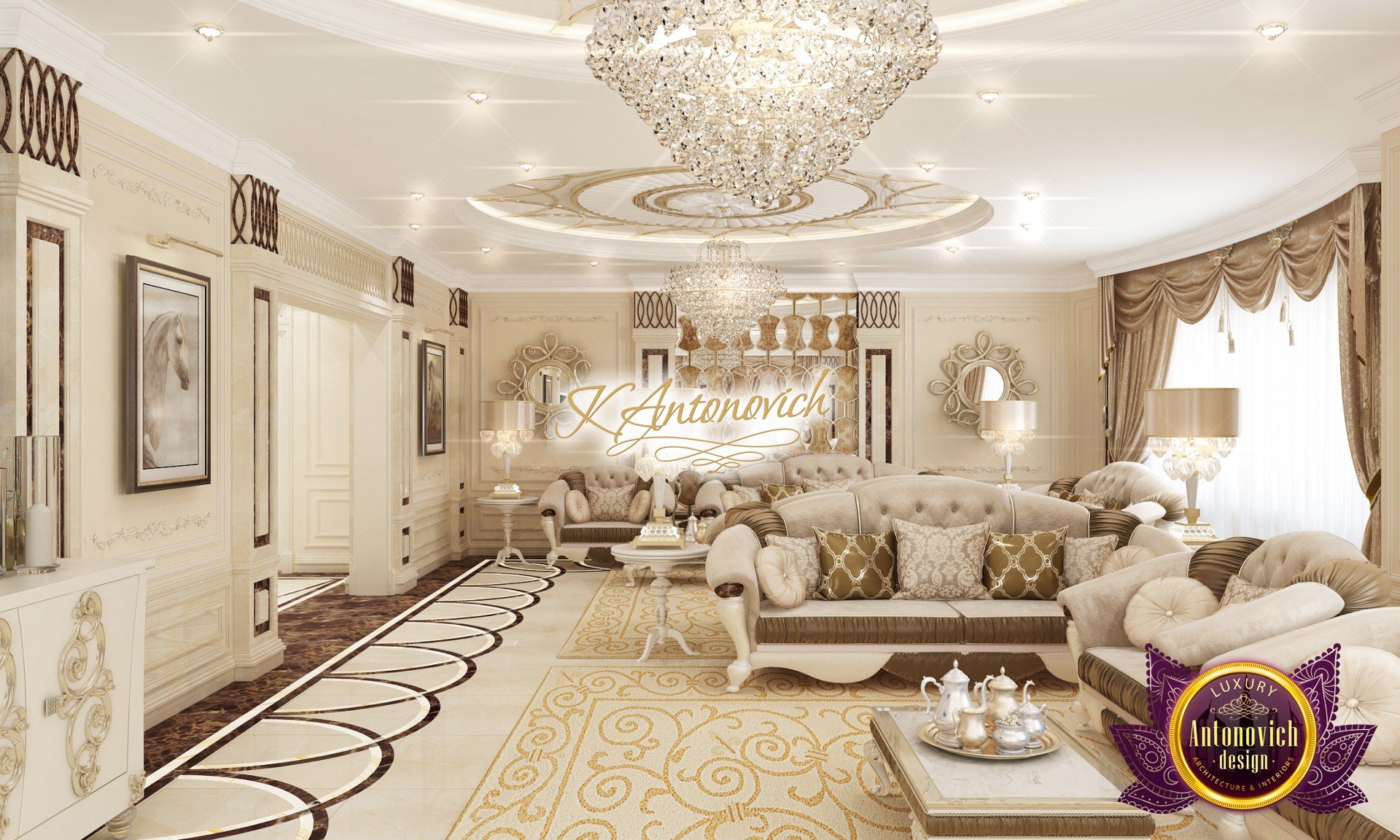 Красивые столы и кресла с изящной расстановкой формируют изысканный образ роскошной гостиной. Колоссальная и эффектная композиция придаёт интерьеру гламурный и современный характер. Комната оформлена в успокаивающих, притягательных тонах. Узоры на полу подчёркивают утончённость интерьера. Кроме того, стены и шторы выполнены в роскошной отделке. Декор и изящная мебель выглядят впечатляюще.