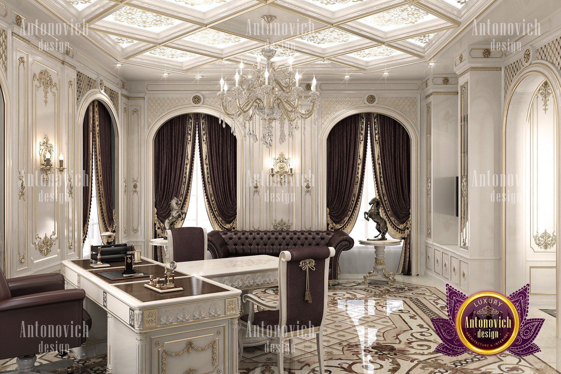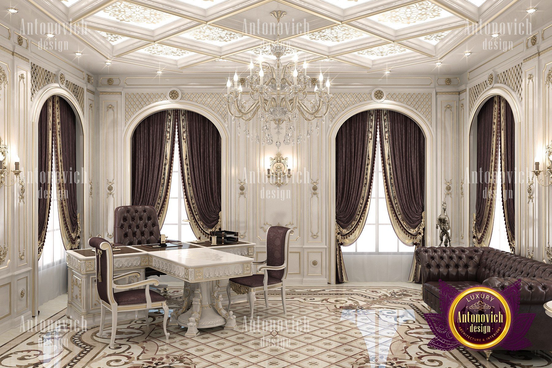 Дизайн офиса в классическом стиле стал отличным способом подчеркнуть солидность и высокий статус его владельца. Классический интерьер офиса учитывает образ жизни и вкусовые предпочтения заказчика. Дизайнеры отразили любовь владельца к путешествиям в больших картинах его любимых мест. Шедевры великолепно смотрятся на фоне лаконичных обоев в широкую полоску. Кремовые оттенки обоев и потолка выгодно оттеняют все остальные детали интерьера. Окно украшено красивой односторонней портьерой из благородного шелка фиолетового оттенка — интерьер с шелковыми шторами выглядит особенно изысканно. Мебель из ценных пород дерева, покрытая лаком, верно подчеркивает солидность интерьера. Дизайн офиса в Дубае удачно сочетает тепло домашнего уюта и рабочую атмосферу. Офис в классическом стиле здесь превращается в комфортное пространство. Дизайн роскошного офиса и оформление офиса в классическом стиле подчёркивают статус и делают пребывание приятным: интерьер офиса в Дубае удобен и элегантен, мягкий ковер и диван из натуральной кожи завершают образ.