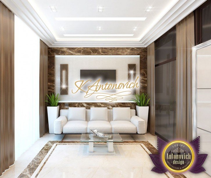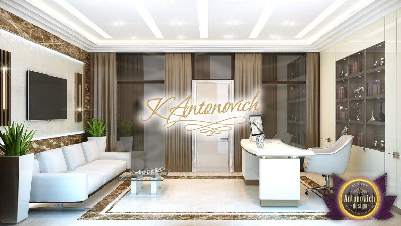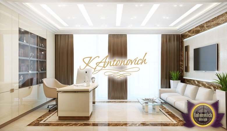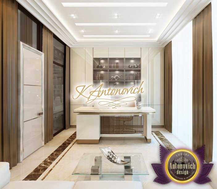 Вдохновение проявляется по-разному, и наши клиенты побуждают нас создавать комфортные и красивые интерьеры. В одном из проектов виллы в ОАЭ мы оформили офисный интерьер в ОАЭ, создав кабинет в вилле ОАЭ на втором этаже здания. Если интерьер виллы в ОАЭ отражает пышность и элегантность современного классического интерьерa, то интерьер рабочего кабинета стал настоящим убежищем для работы. Это пространство, где ничто не отвлекает вас от любимых дел и где создаётся эффективная рабочая среда. Интерьер в современном стиле получился очень уютным — настоящий уютный рабочий кабинет с тёплой атмосферой. В оформлении окон тёплые оттенки шоколада в интерьере задали настроение. Также мраморный пол светлых тонов дополняется коричневыми линиями камня. Линии подсветки прошли по потолку — такая подсветка в потолке кабинета обеспечивает освещение для рабочего кабинета и благоприятна для глаз в любое время суток. Эргономичная офисная мебель и функциональные решения идеально вписались в общую картину. Для документов и небольшой библиотеки мы предложили шкафы с глянцевыми фасадами и шкафы со стеклянными дверцами.